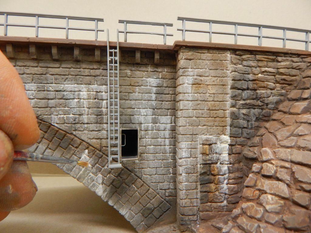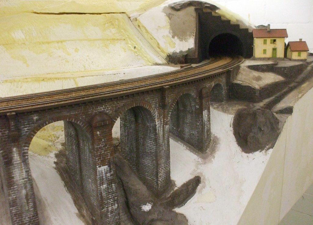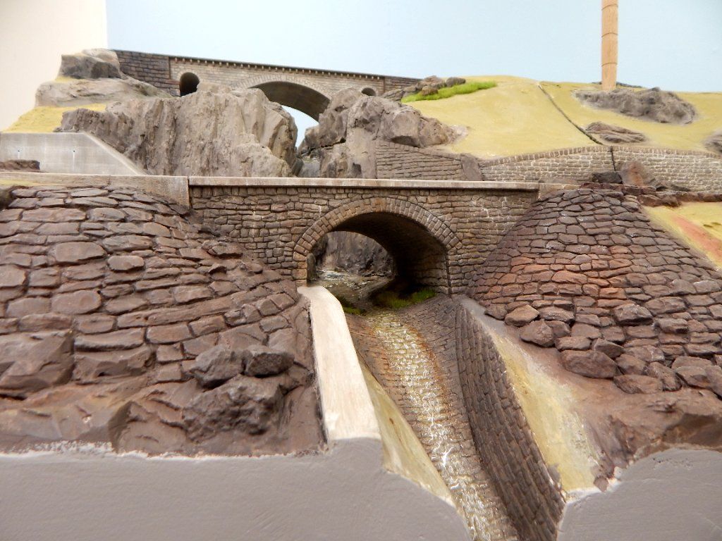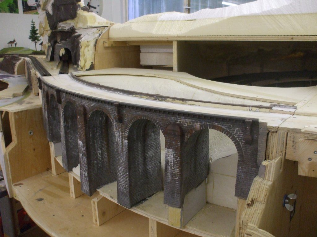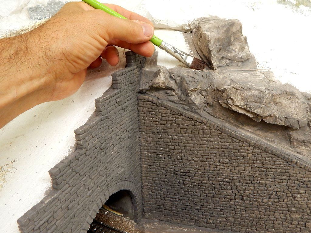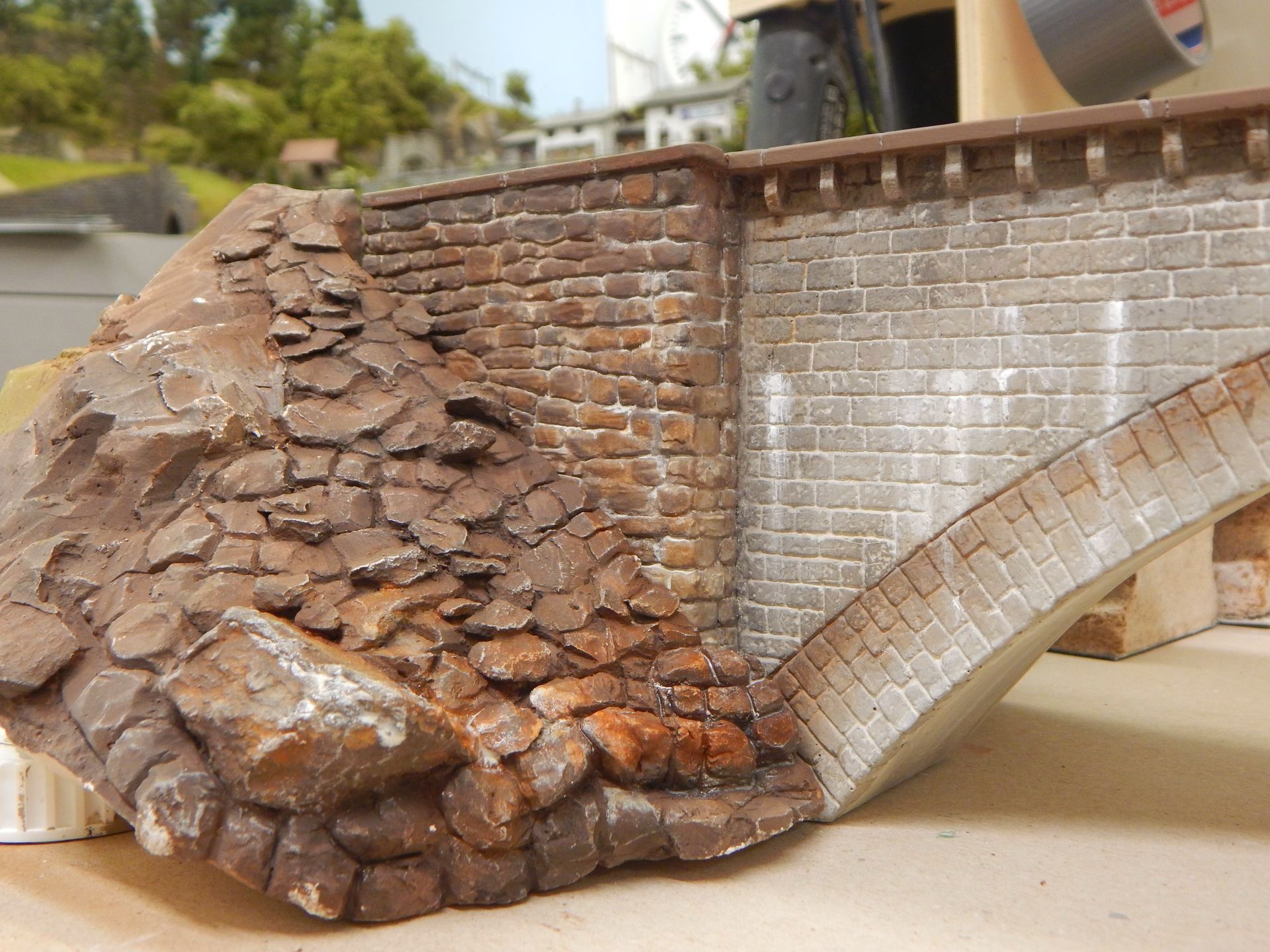 Fertig kolorierte untere Wattinger- Brücke, Tunnelportal und Felsen. Nun kann die Begrünung beginnen.