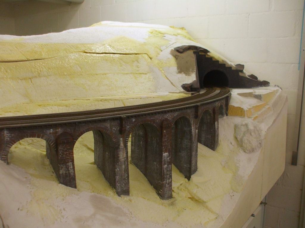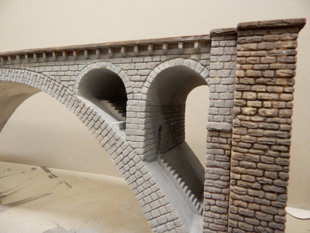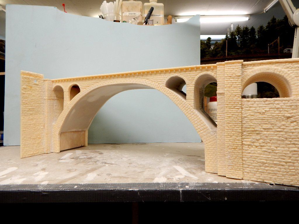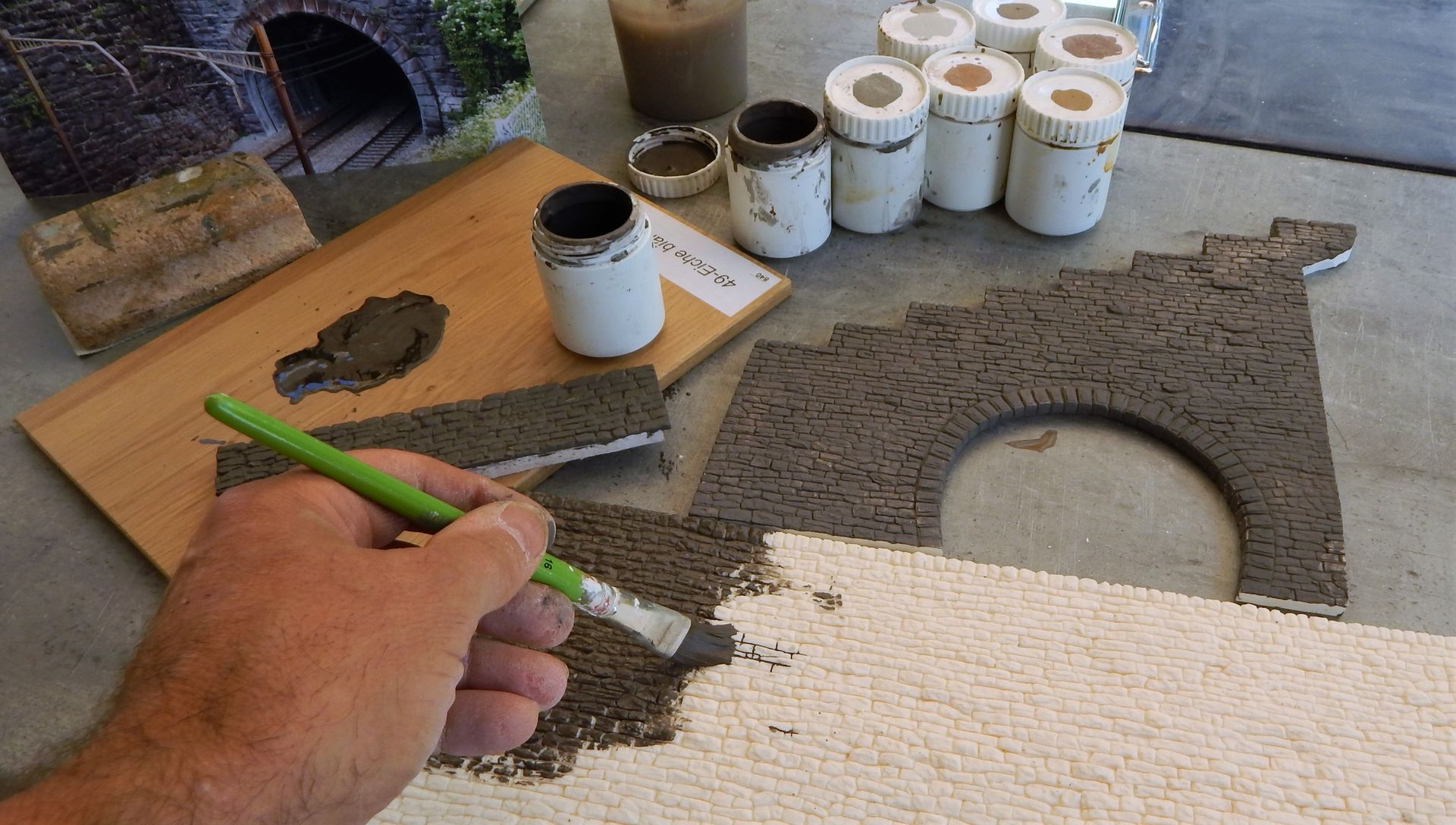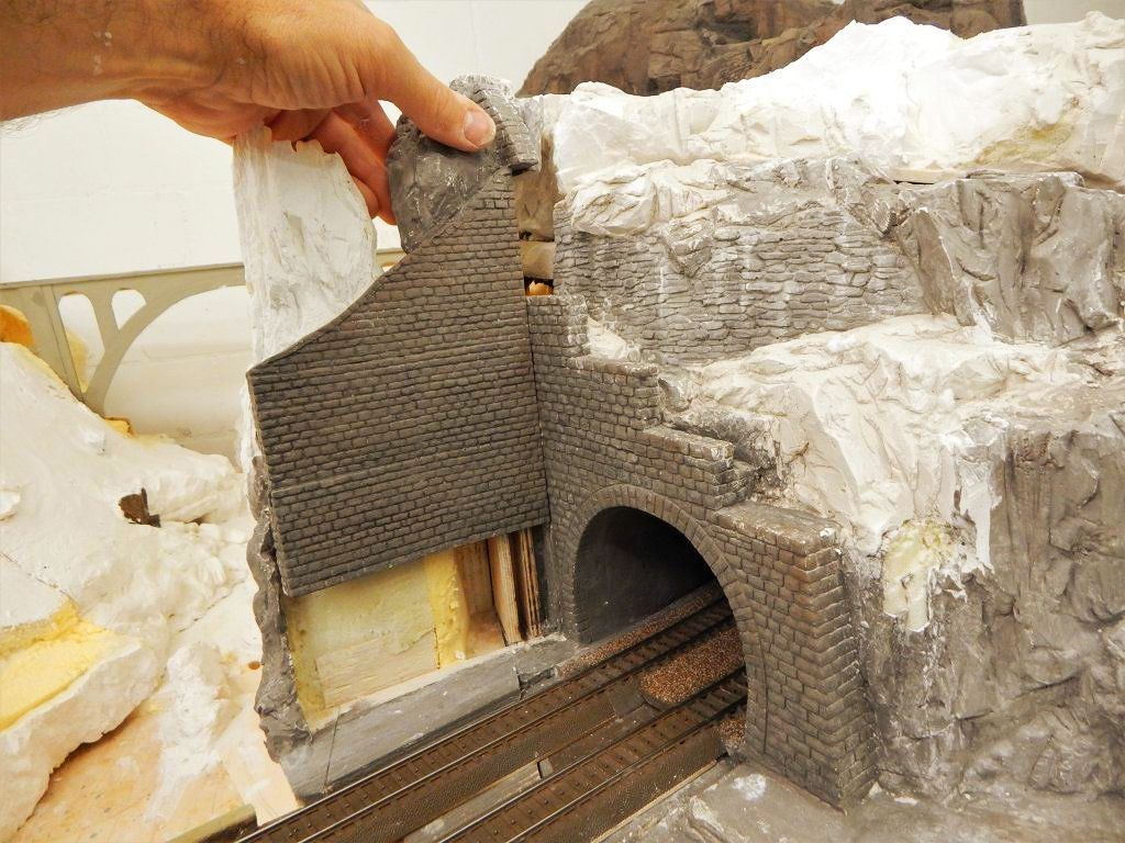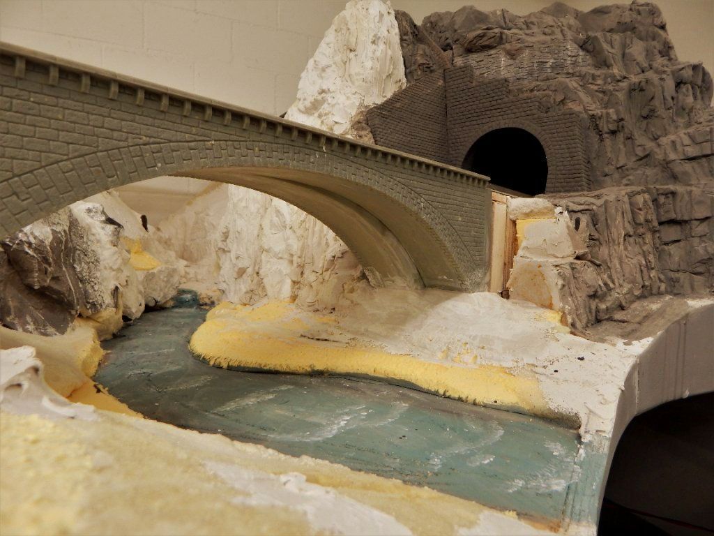 Fertig kolorierte untere Wattinger- Brücke, Tunnelportal und Felsen. Nun kann die Begrünung beginnen.