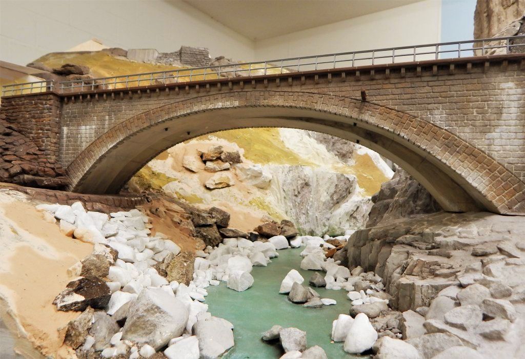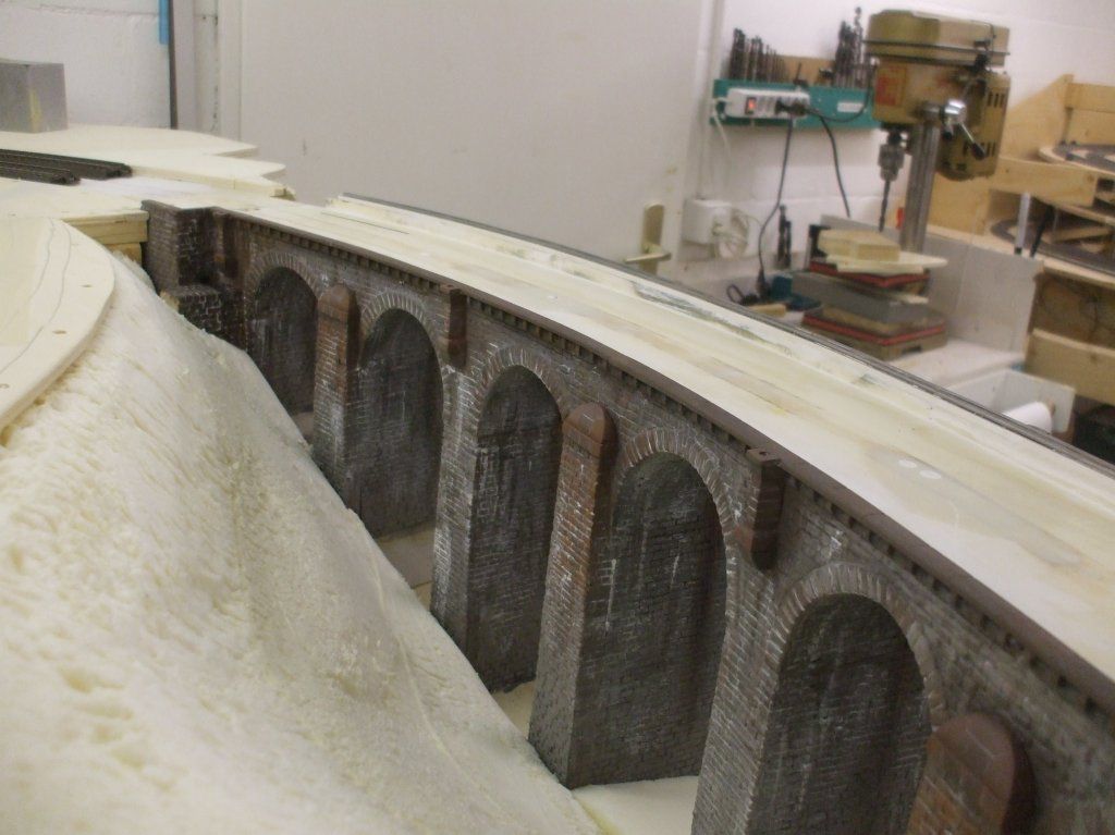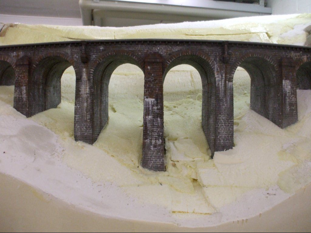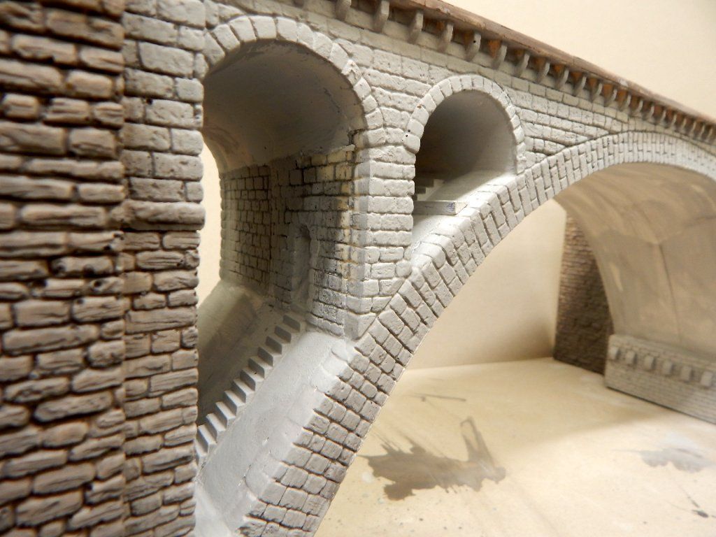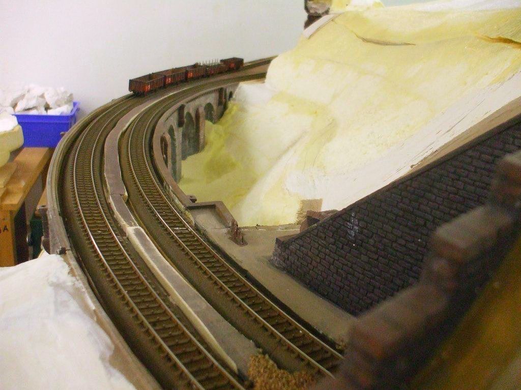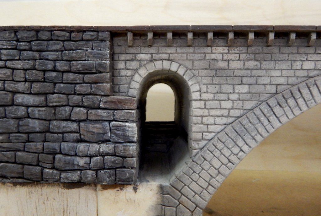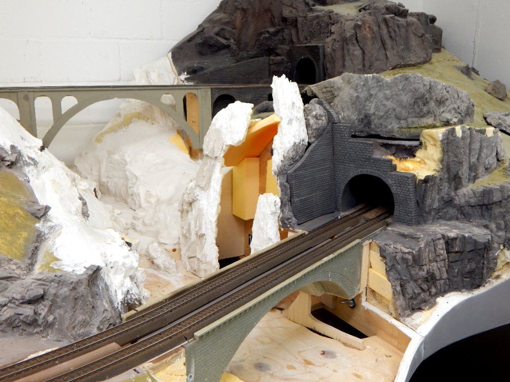 Fertig kolorierte untere Wattinger- Brücke, Tunnelportal und Felsen. Nun kann die Begrünung beginnen.
