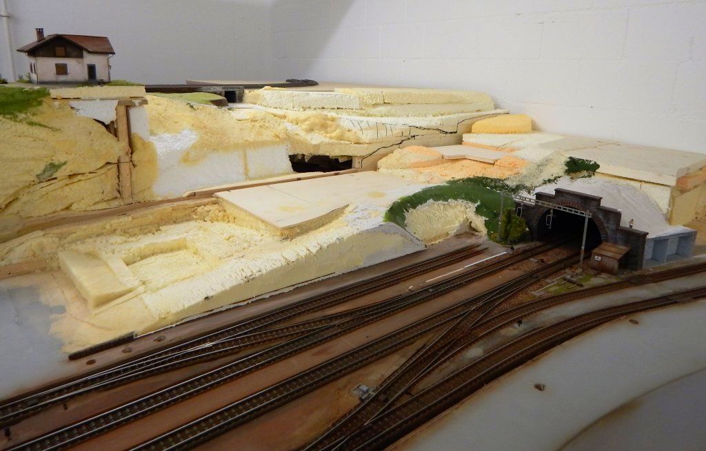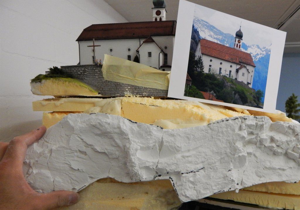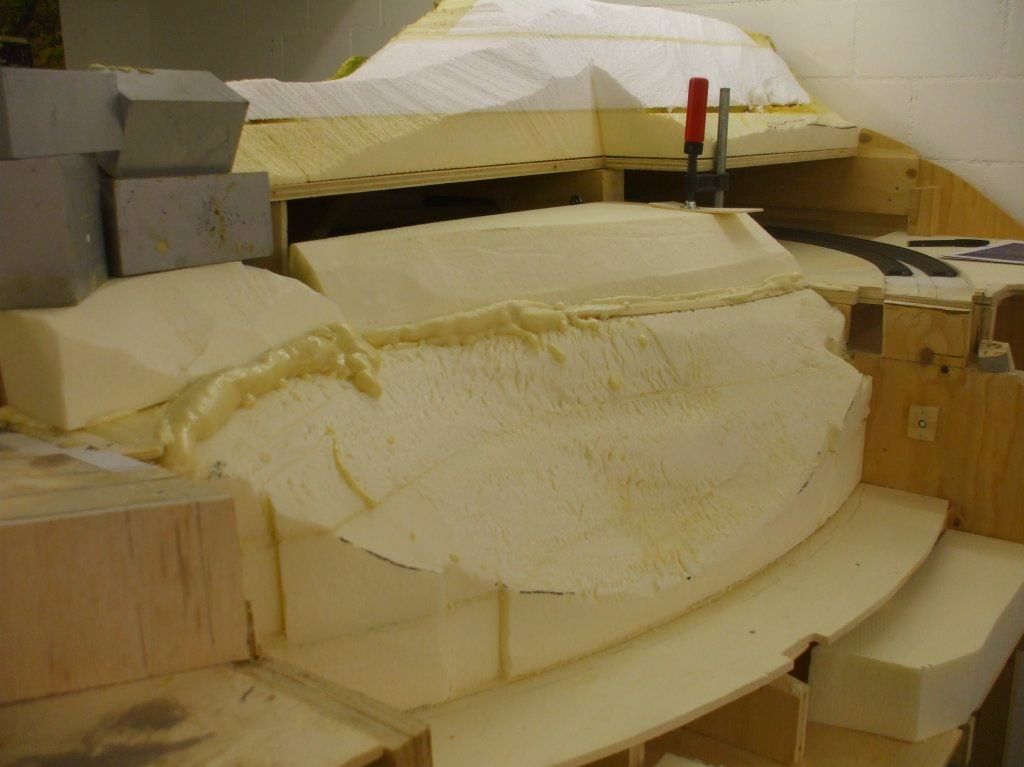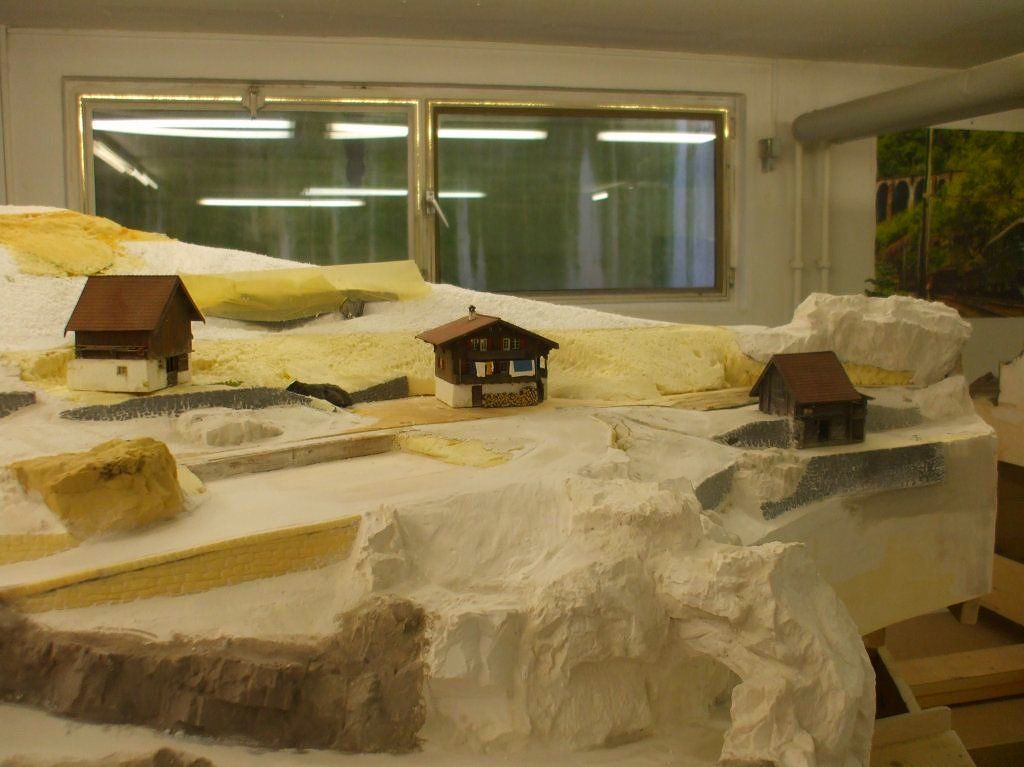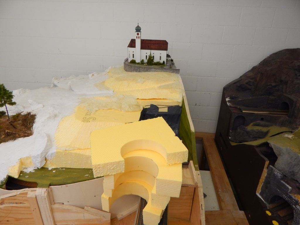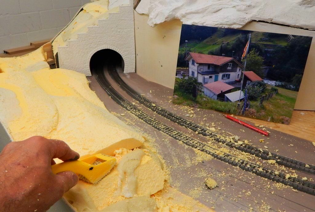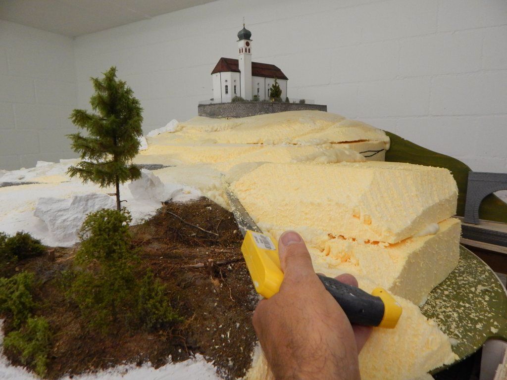 Für die Geländestruktur verwende ich 2-6 cm dicke Hartschaumplatten und 2 Komponenten Hartschaum (Studer Kunststoffe) nicht zu verwechseln mit dem Bauschaum aus der Dose, mit dem ich die Platten verklebe und Hohlräume ausfülle. Der Schaum ist einer halben Stunde hart und kann anschliessend gut mit Säge und Raspel bearbeiten werden. Ich liebe diese Bauweise, den sie ermöglicht mir, ein effizientes Vorankommen der Landschaftsgestaltung. Die Hartschaumplatten (Jumbo Baumarkt) lassen sich ebenfalls gut mit Säge und Raspel bearbeiten und so das Gelände relativ einfach in die gewünschte Form bringen. Die Bauweise mir Hartschaumplatten, habe ich zum ersten mal bei Josef Brandel gesehen. Er gehört, für mich persönlich, zu einer der Besten Anlagebauer.