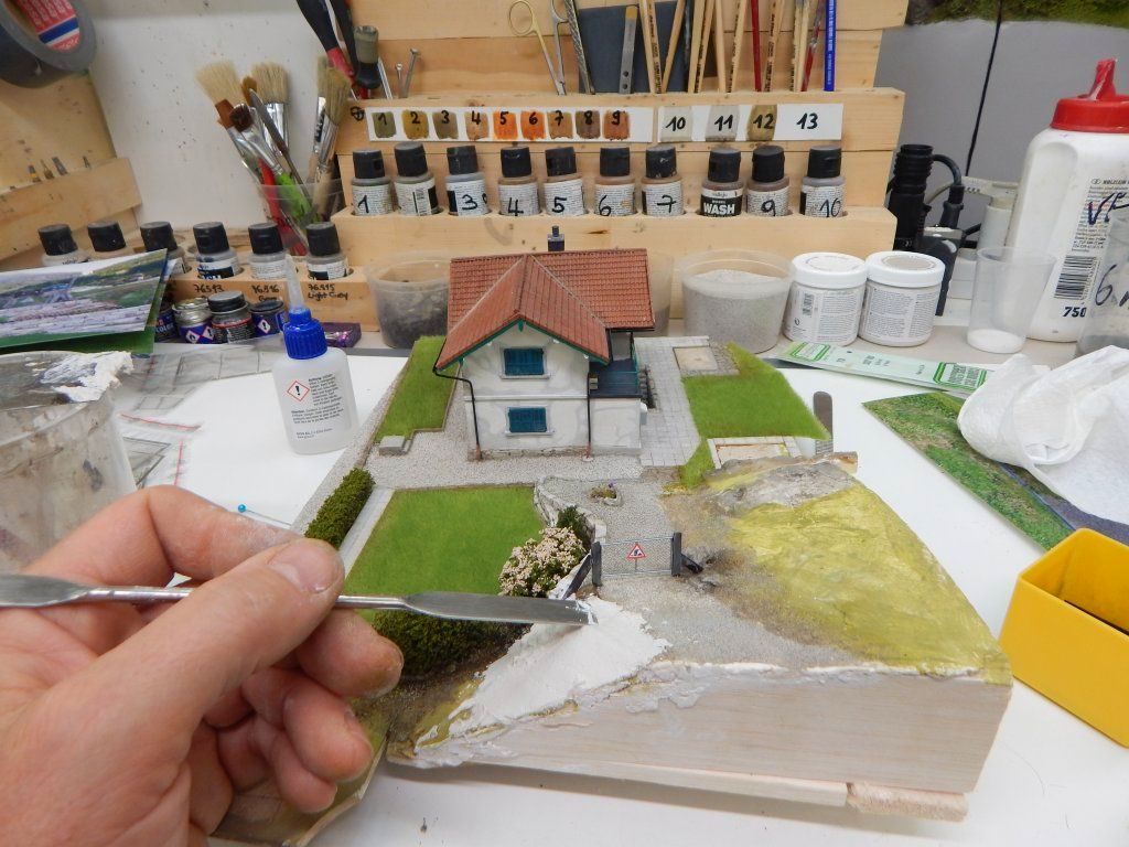 Das Bahnwärterhaus und deren nähere Umgebung mit Nebengebäuden, werden am Werktisch fertig modelliert und dann erst an der vorgesehenen Stelle eingebaut.