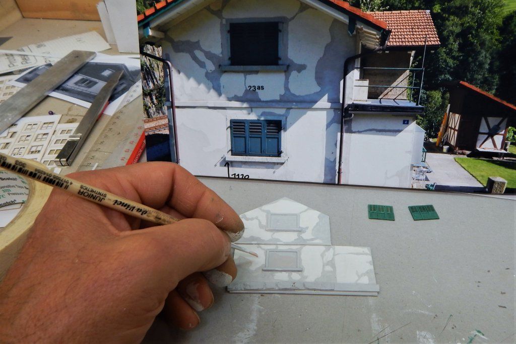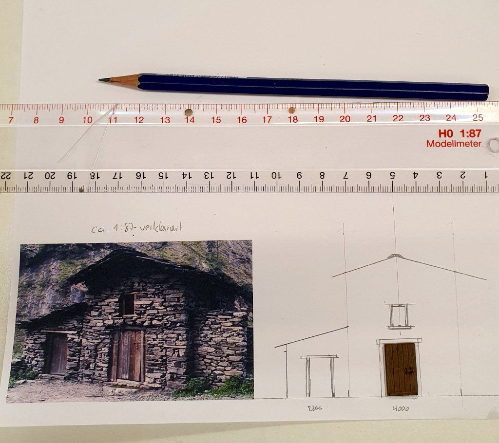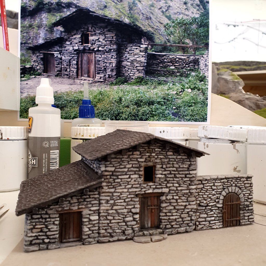 Ein paar Gebäude sind Eigenbau. Viele jedoch, sind gekaufte Bausätze der Firmen Kibri, Noch, Busch und Tilly Models. Aus einigen Bausätzen, habe ich jeweils zwei bis drei verschiedene Häusertypen hergestellt. Sehr schöne Bausätze findest Du auch bei Laser Creation und MBZ. Tessiner Stall Eigenbau von Bild aus Internet, verkleinert auf 1:87, orientiert an Hand der Stalltür.