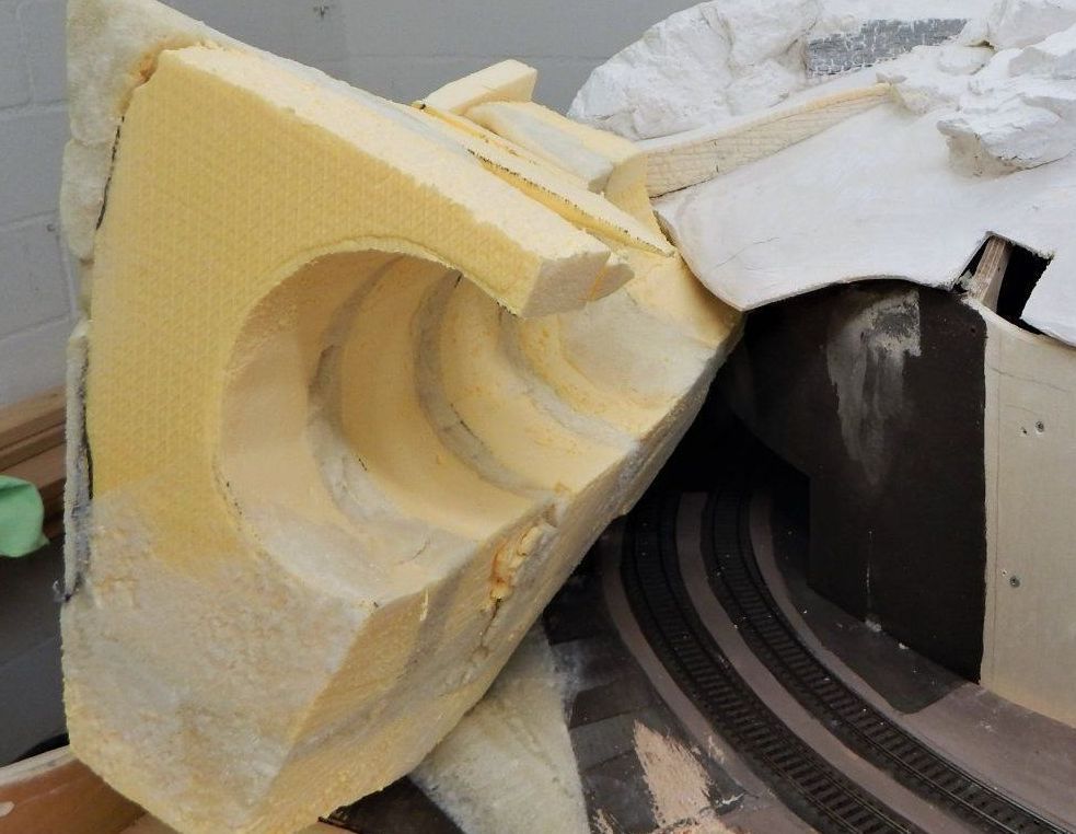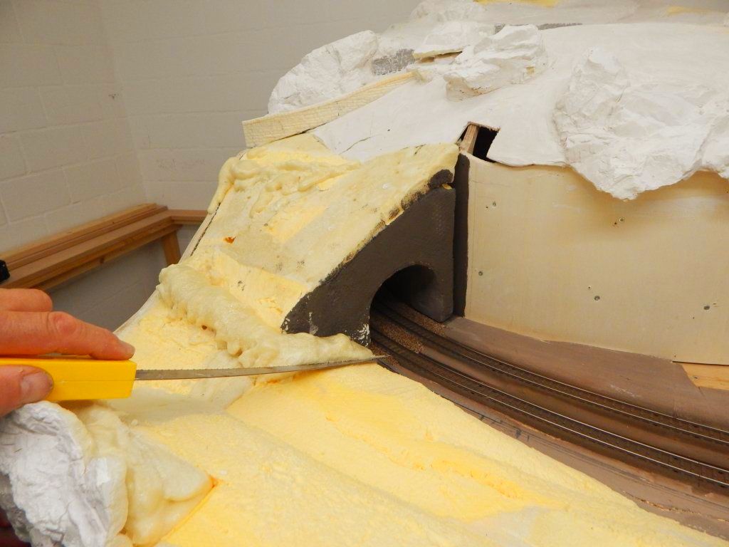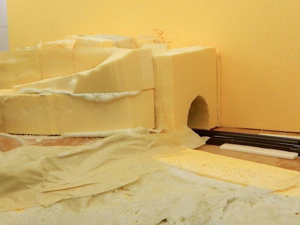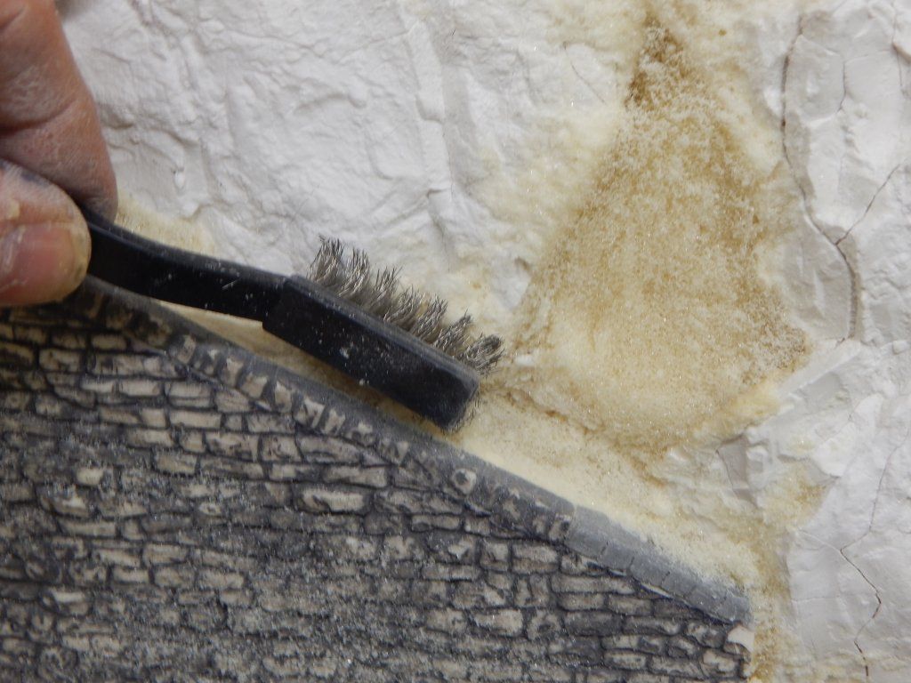 Nach der Trocknung des Hartschaums, befreie ich die feste Felspartie mit Cutter und Drahtbürste vom aufgequollenen, überschüssigen Schaum. Falls mal etwas Schaum aufs C-Gleis gerät, kein Problem, wichtig jedoch, gut trocknen lassen und dann ebenfalls mit einer feinen Drahtbürste entfernen.