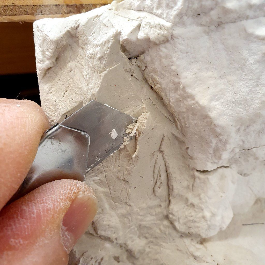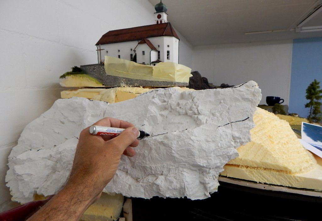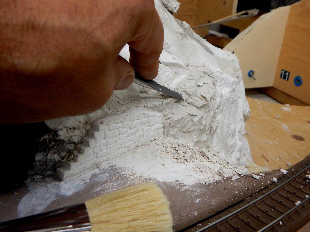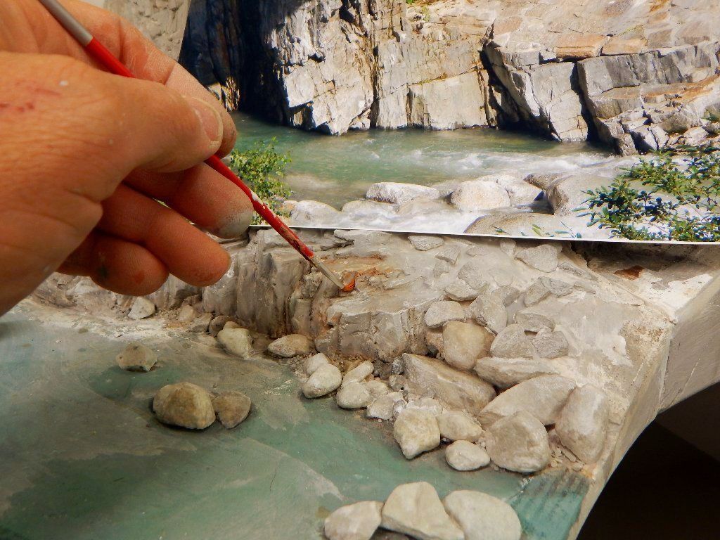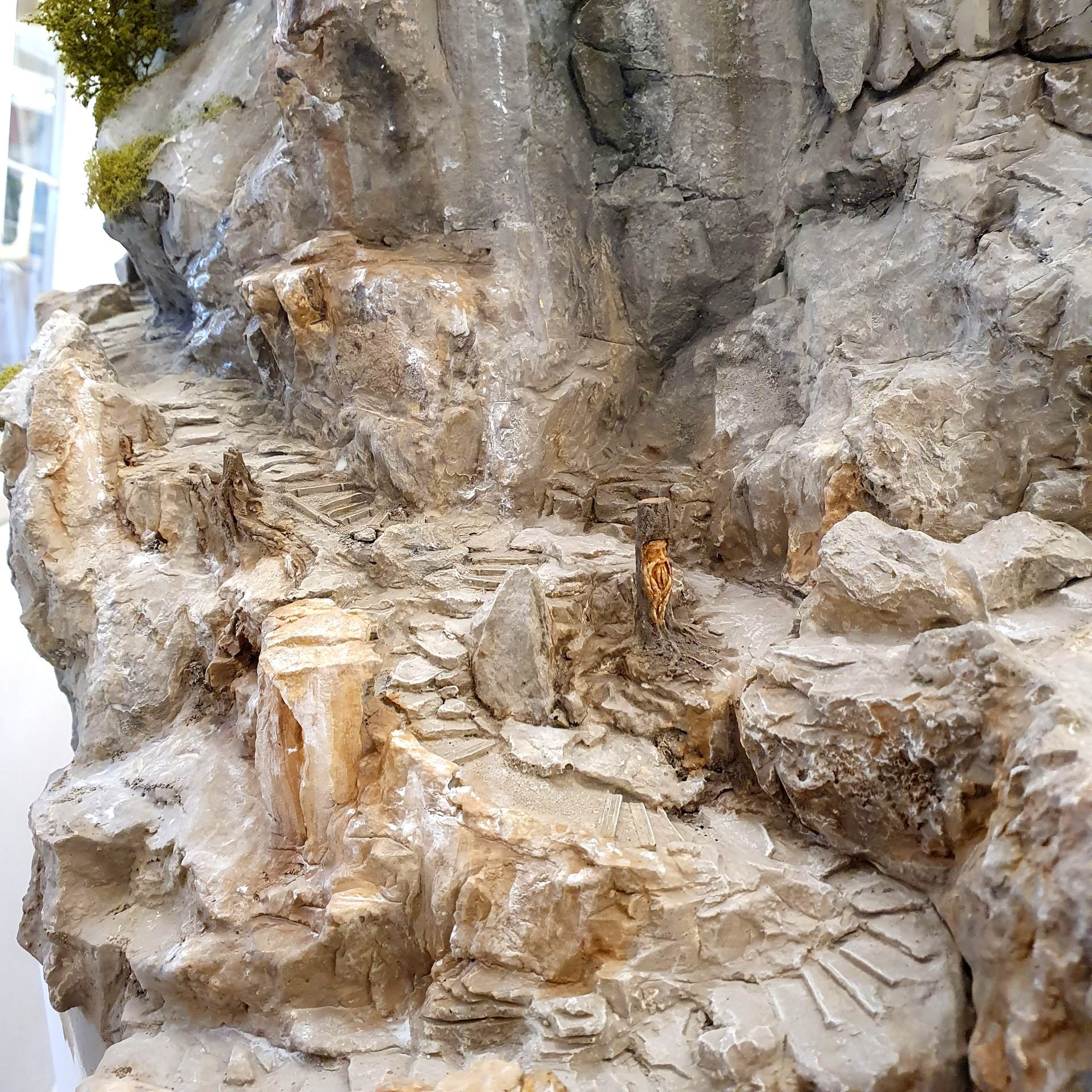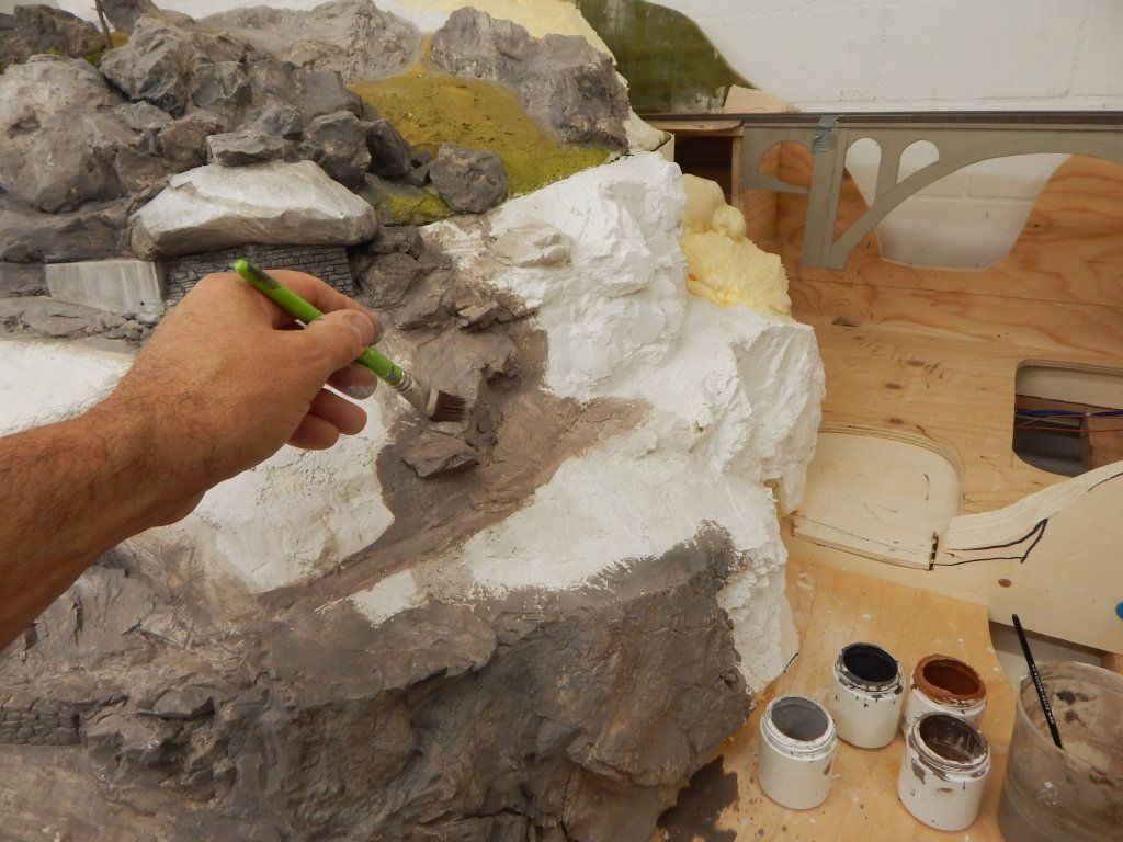 Die Übergänge verspachtle ich mit Moltofill, dem ich ein wenig Holzleim beifüge, was die Masse nach der kompletten Aushärten stabiler macht. Nach dem Antrocknen, modelliere ich mit dem Cutter die Felsstruktur. So erhalten wir einen Nahtlosen Übergang der einzelnen Felsstücke. Nach der Trocknung des Moltofills, erfolgt die Bemalung mit wässerigen bis deckenden Dispersionsfarben.
