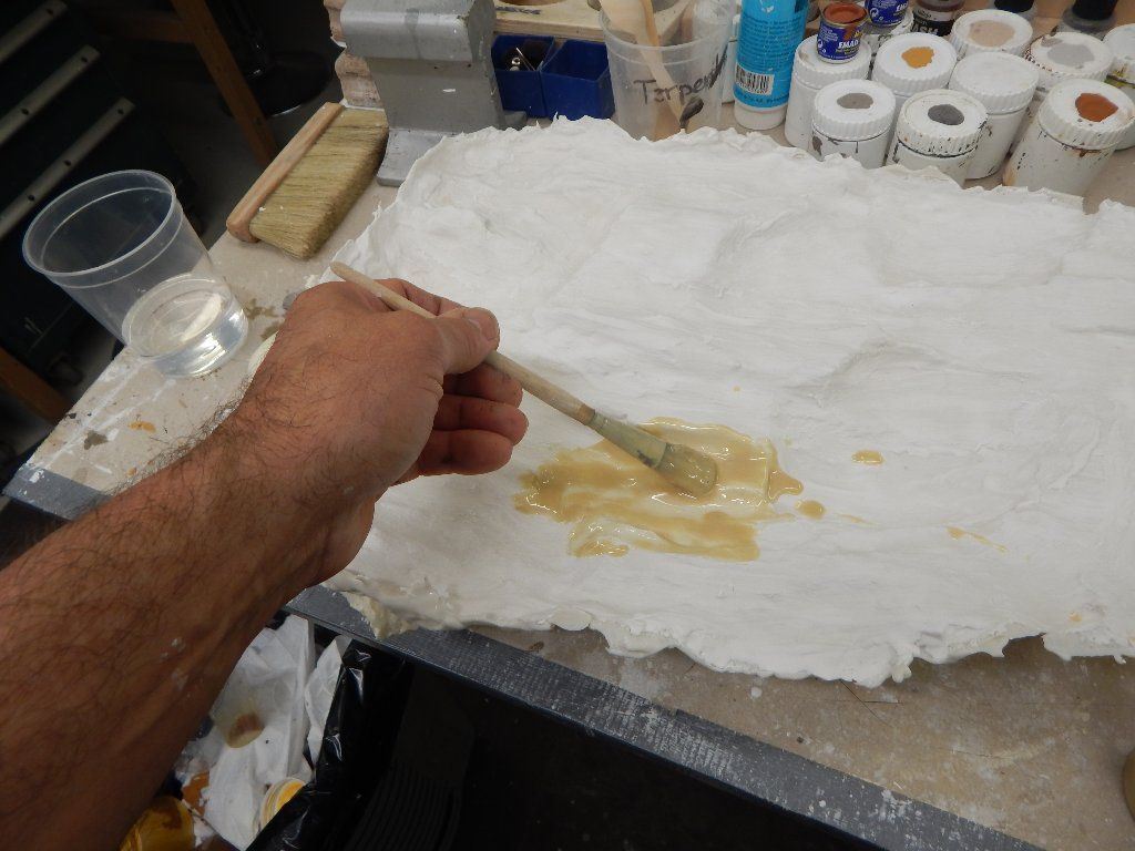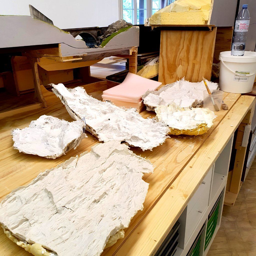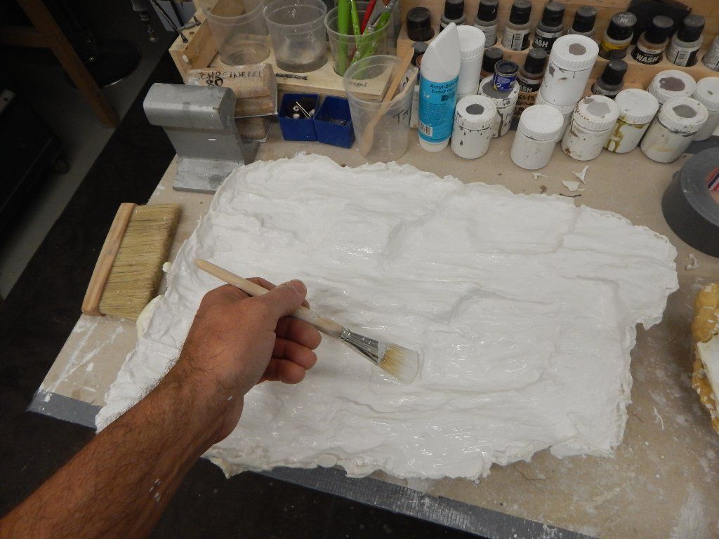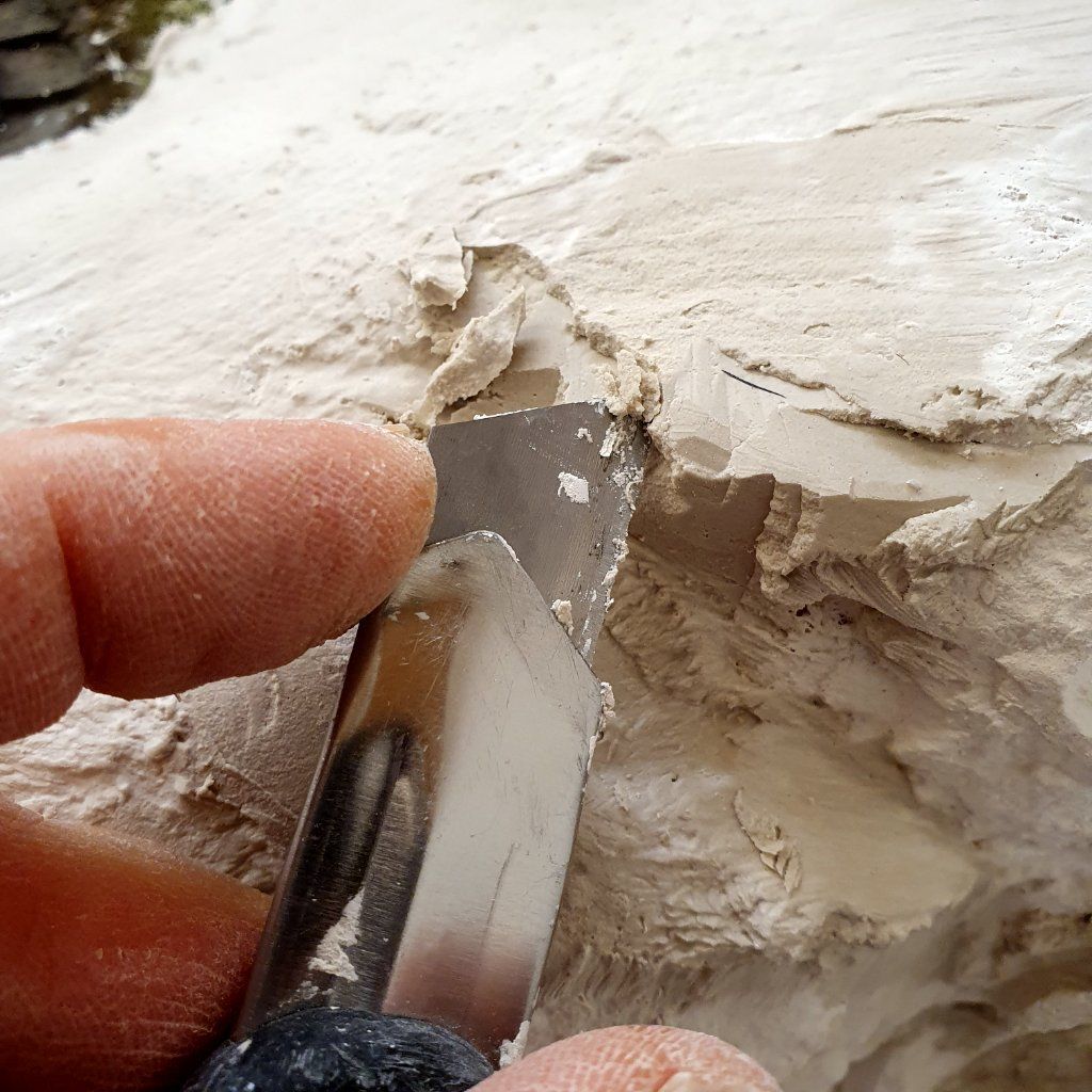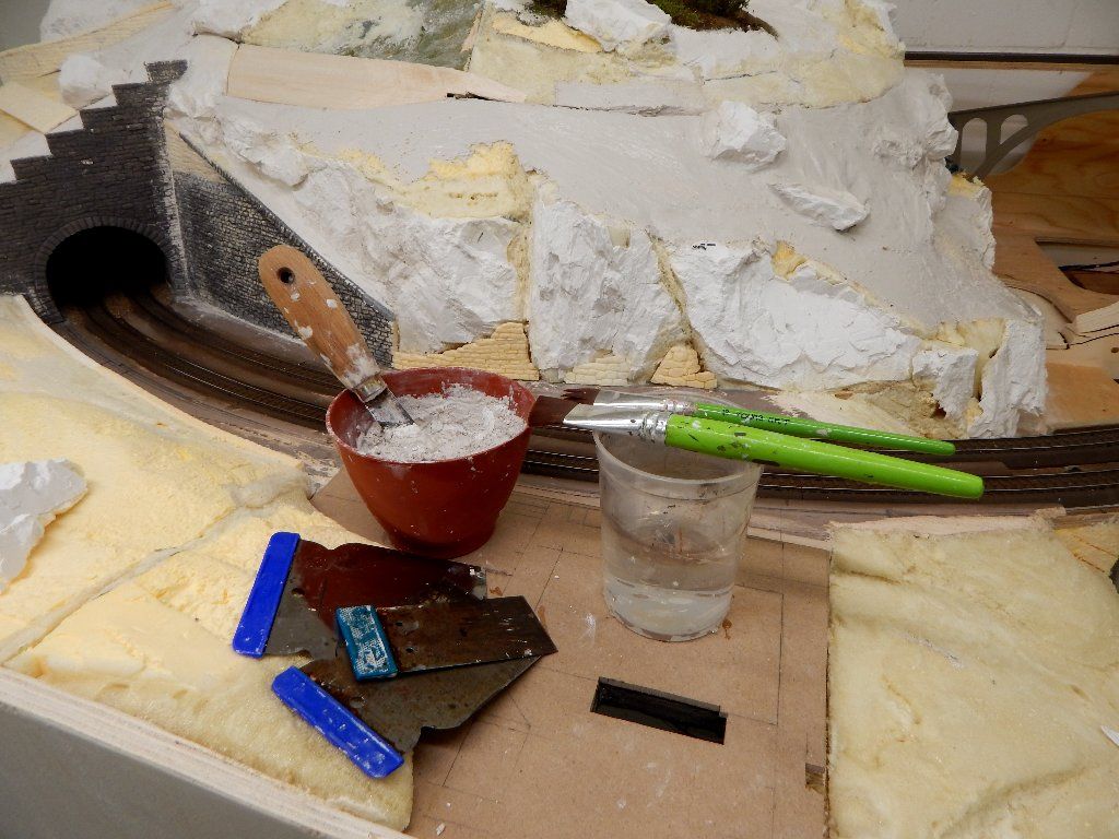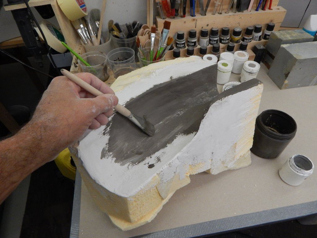 Die Übergänge verspachtle ich mit Moltofill, dem ich ein wenig Holzleim beifüge, was die Masse nach der kompletten Aushärten stabiler macht. Nach dem Antrocknen, modelliere ich mit dem Cutter die Felsstruktur. So erhalten wir einen Nahtlosen Übergang der einzelnen Felsstücke. Nach der Trocknung des Moltofills, erfolgt die Bemalung mit wässerigen bis deckenden Dispersionsfarben.