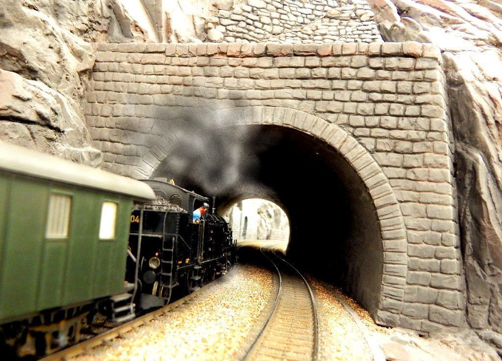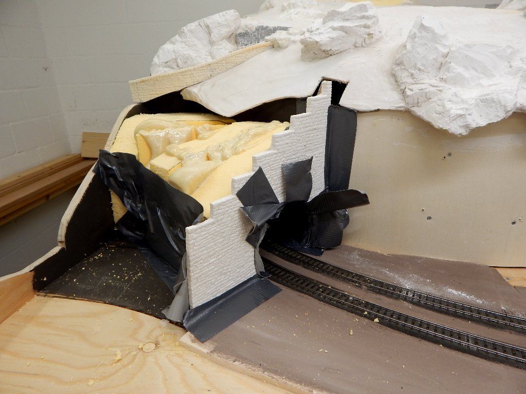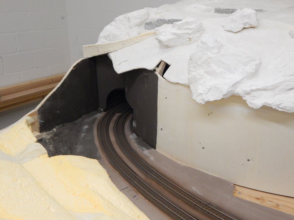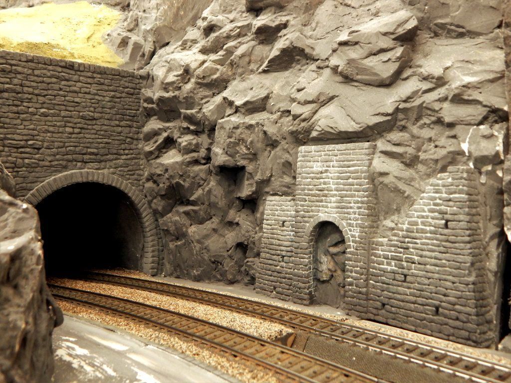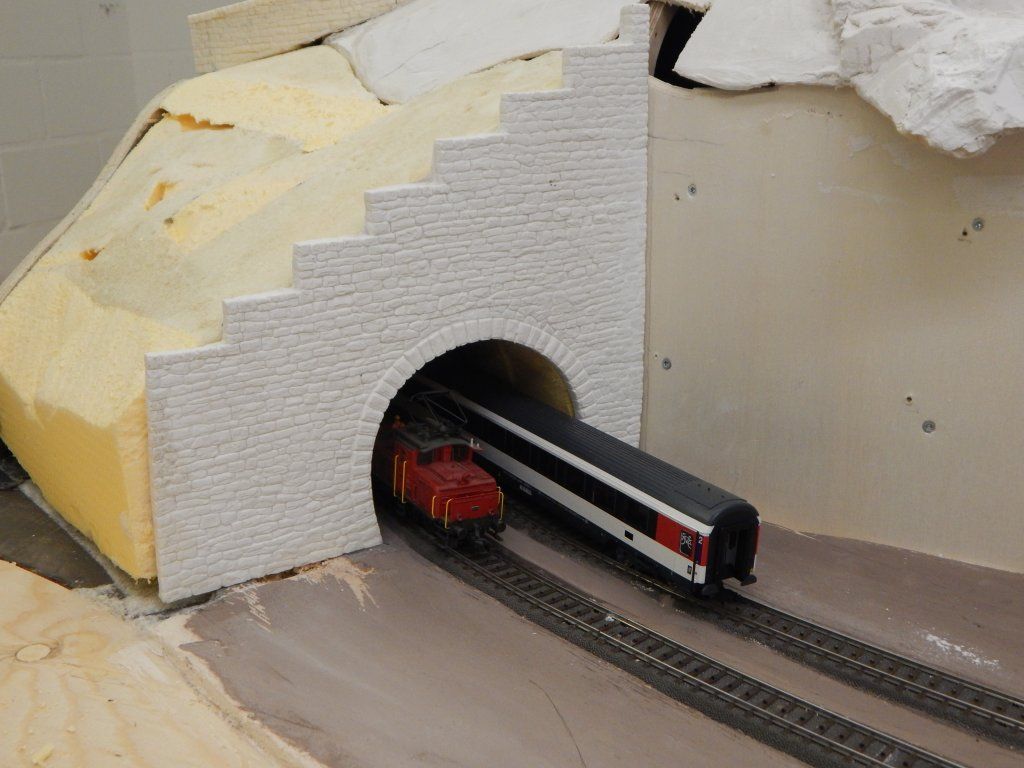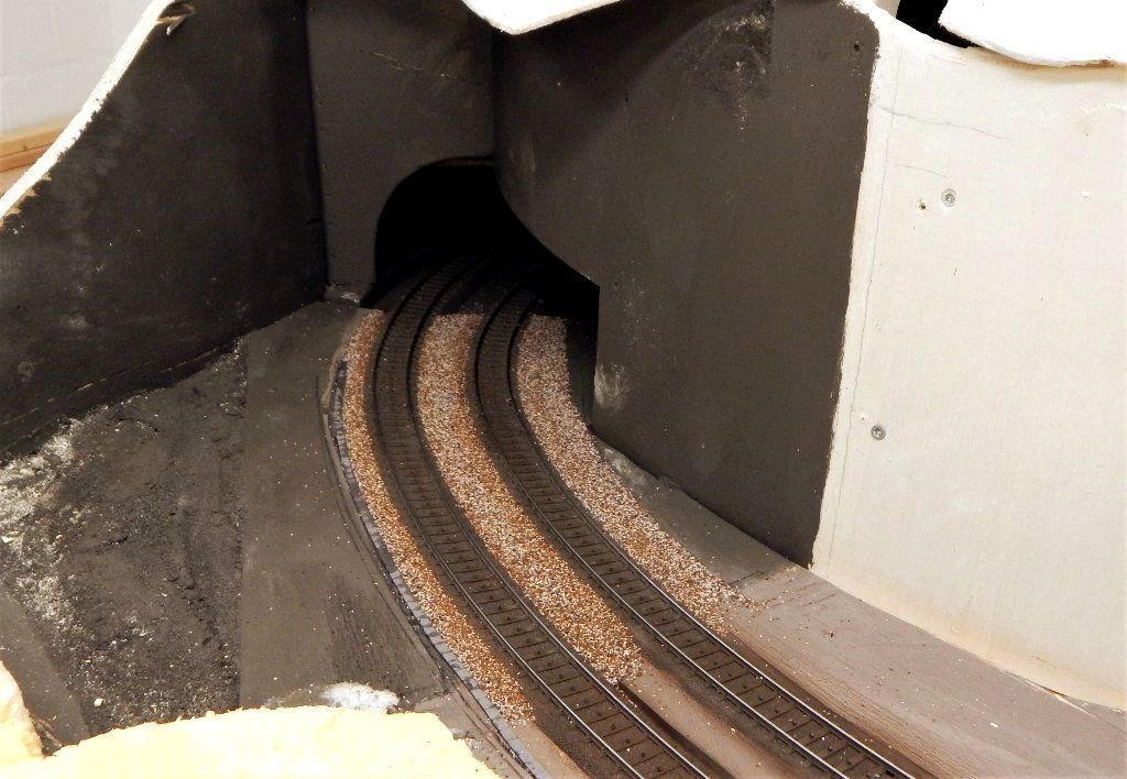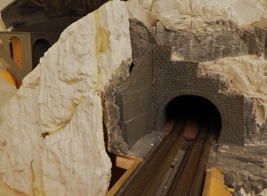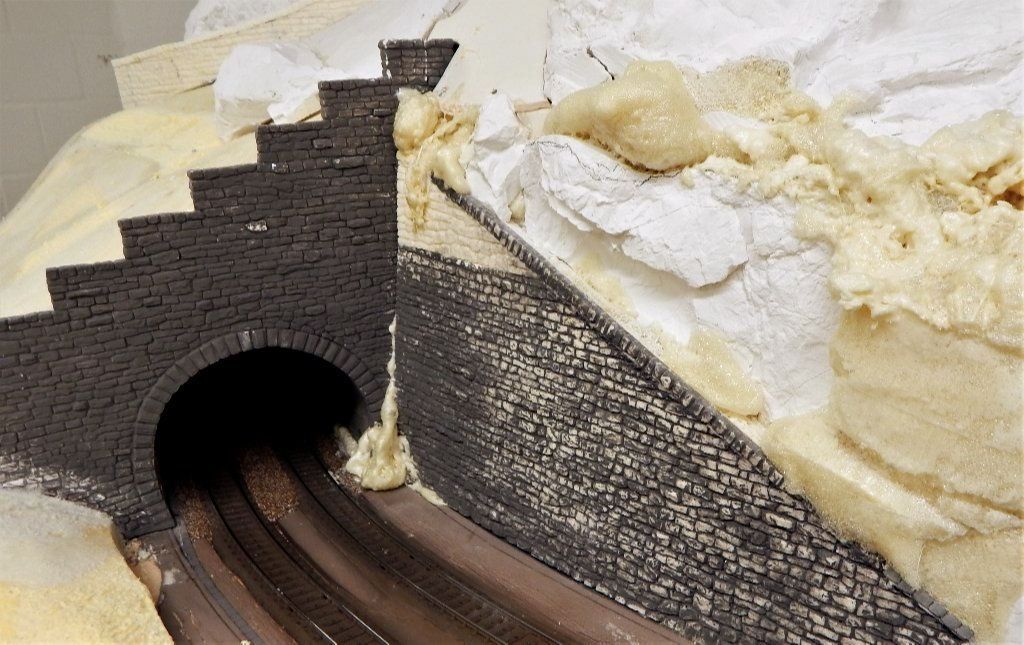 Die Tunneleingänge stellte ich aus zugeschnittenen Hartschaumplatten her. Nach dem das C-Gleis mit Klebband abgedeckt wurde, werden die einzelnen Segmente zusammen gefügt. Nun klebe ich ebenfalls die Innenwände des Tunnels und die Seiten ab und fülle anschließend in die Hohlräume mit flüssigem Hartschaum aus. Nach 30 Min. löse ich das Tunnelstück vom Untergrund. Die Innenwände verspachtle ich mit Moltofill und streiche diese, nach der Trocknung, mit dunkler Dispersion an. Nun folgt ein Test mit dem längsten Personenwagen und einer Lok, mit angehobenem Stromabnehmer, ob das Rollmaterial den Tunnel einwandfrei durchläuft. Bevor das Tunnel fest verklebt wird, färbe ich das Gleis rostbraun mit der Airbrush-Pistole und schottere anschließend das C-Gleis dauerhaft ein.