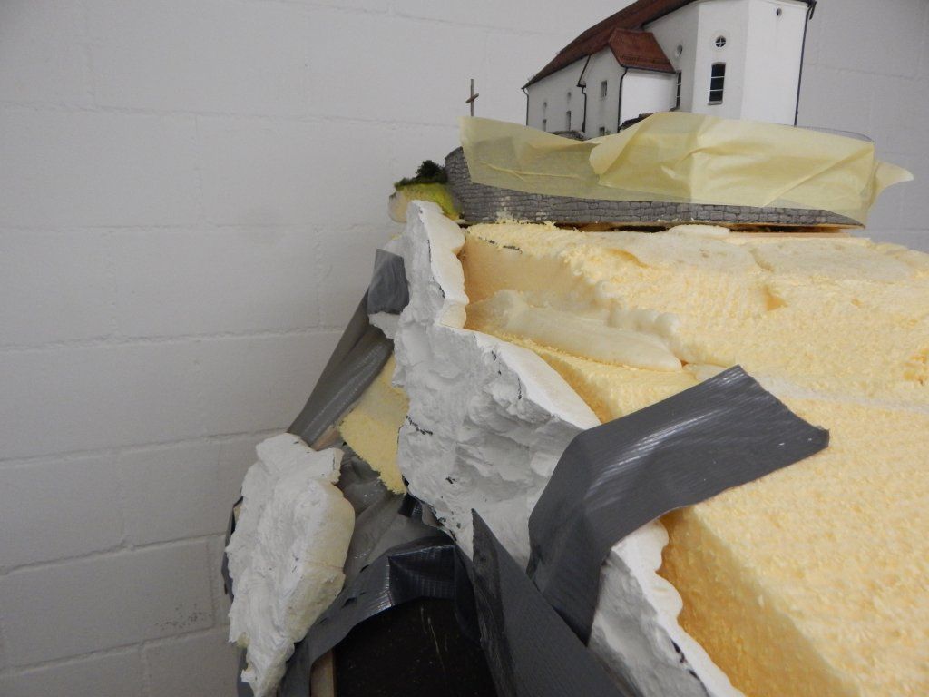 Größere oder kleinere Teile davon, je nach Platzbedarf, werden nun an der vorgesehenen Stelle, zu einer realistisch wirkenden Felspartie zusammengestellt und mit Heissleim fixiert. Anschliessend werden die Unterseite und die Übergänge der Felsstücke mit Gewebeband verklebt. Hierbei achte ich darauf, dass das Klebeband alle Spalten schießt, aus der später der flüssige Hartschaum austreten könnte. Nun fülle ich alle Hohlräume mit Hartschaum, was eine stabile Gesamtkonstruktion der Felspartie ergibt.