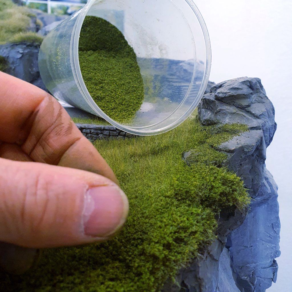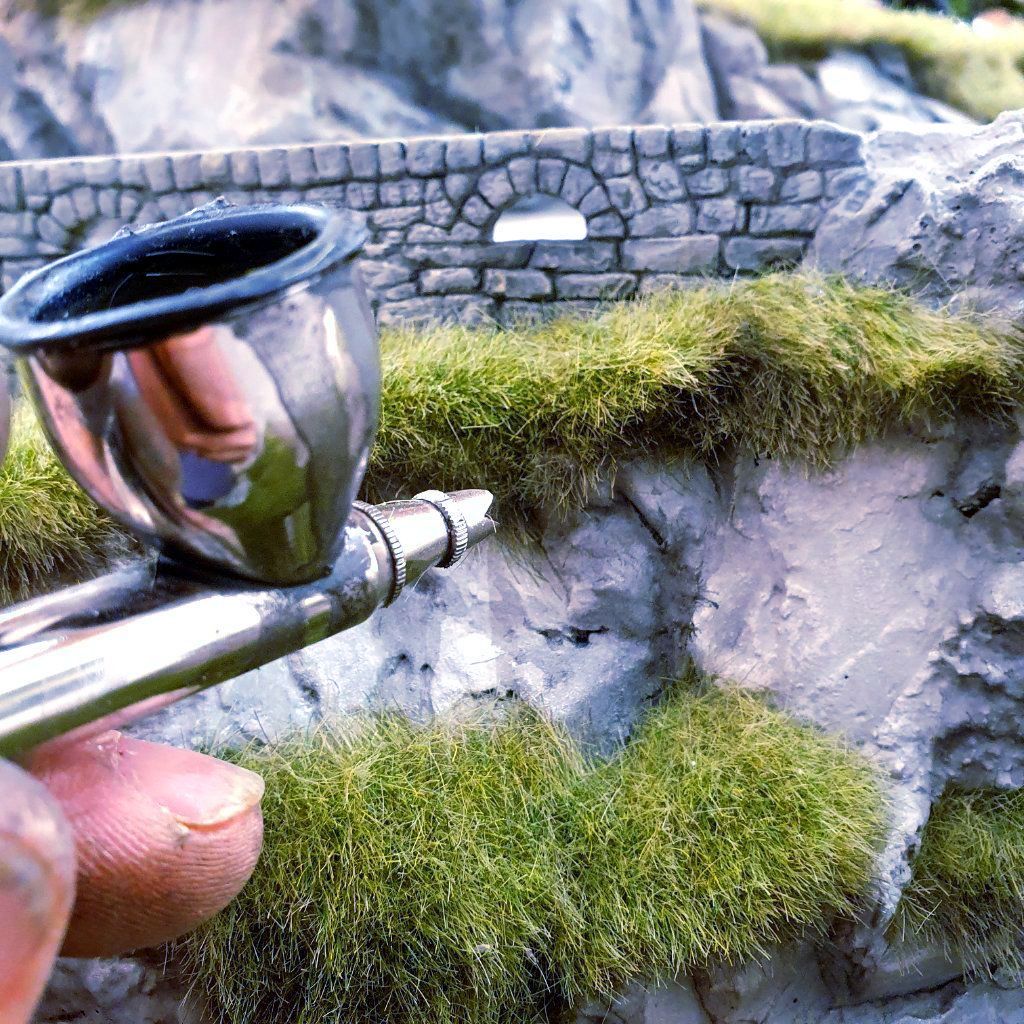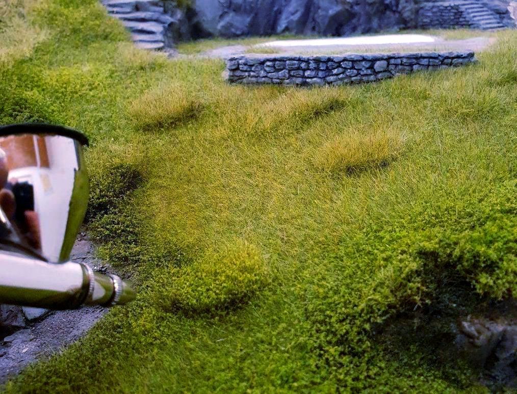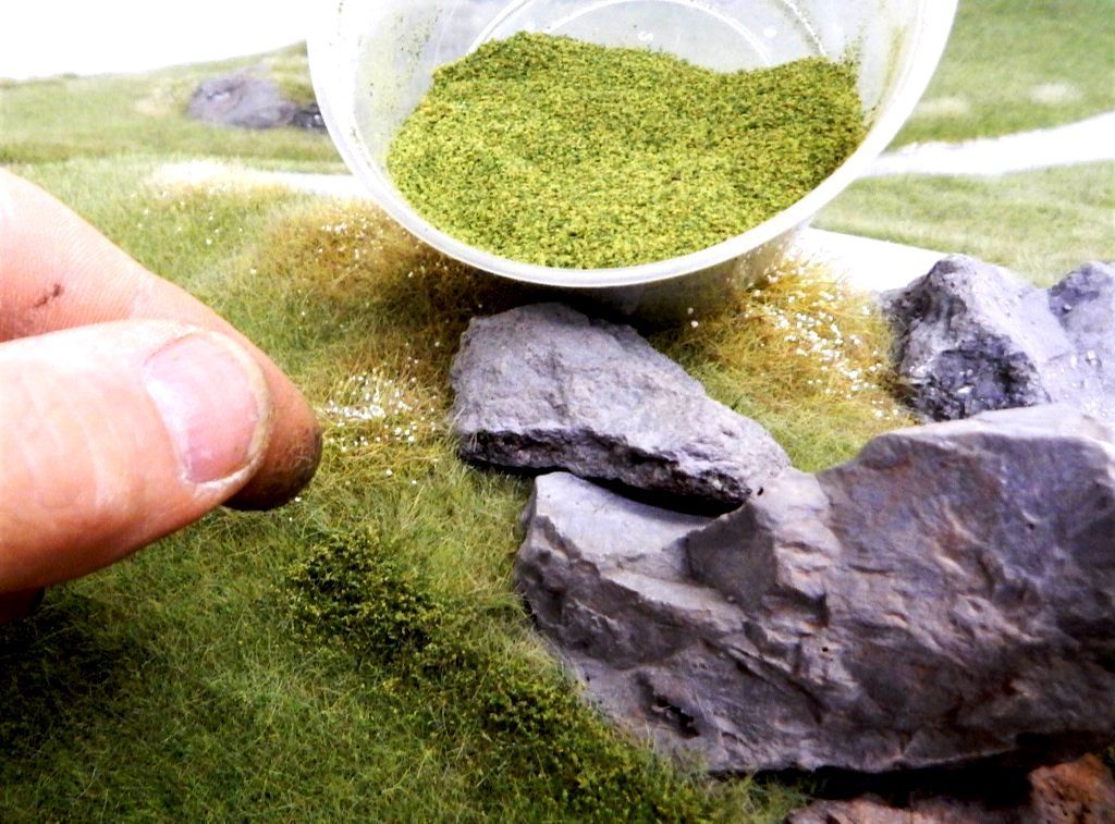 Die Begrünung entsteht aus verschiedensten Streumaterialien und Naturprodukten. Für die Wiesengestaltung verwende ich das starke Maag-Flockgerät. Grasbüschel in alles Grössen werden ebenfalls mit diesem Flockgerät hergestellt.