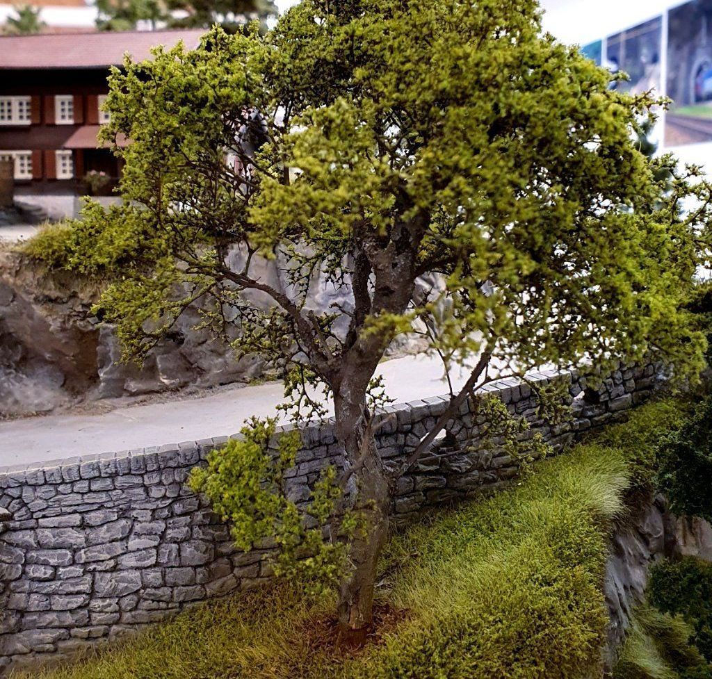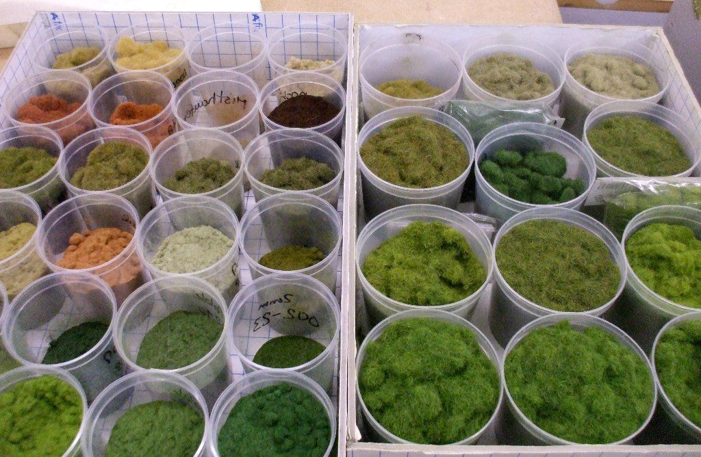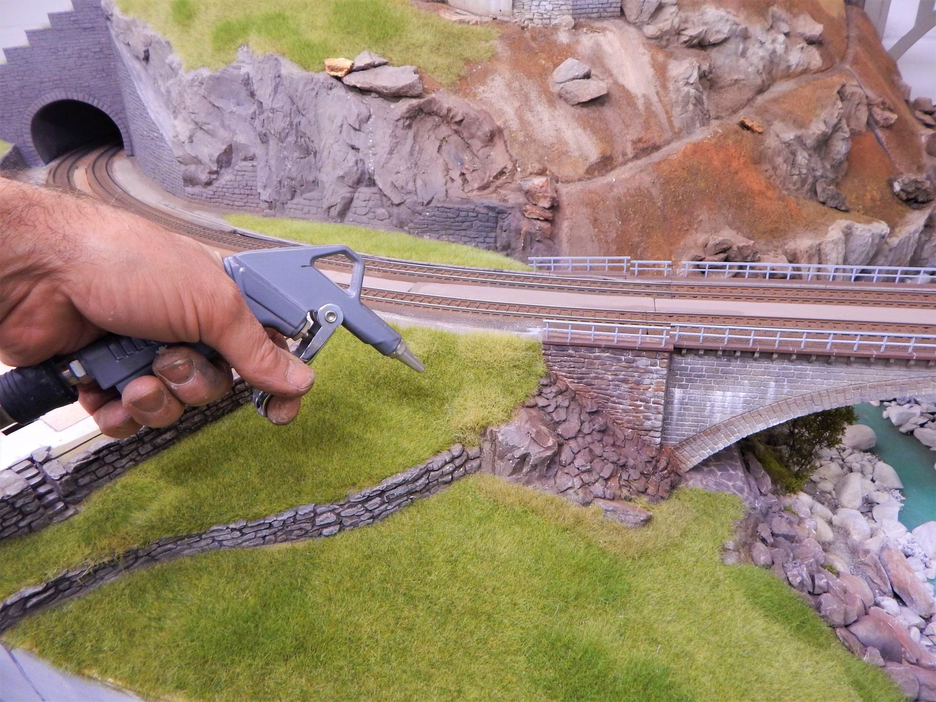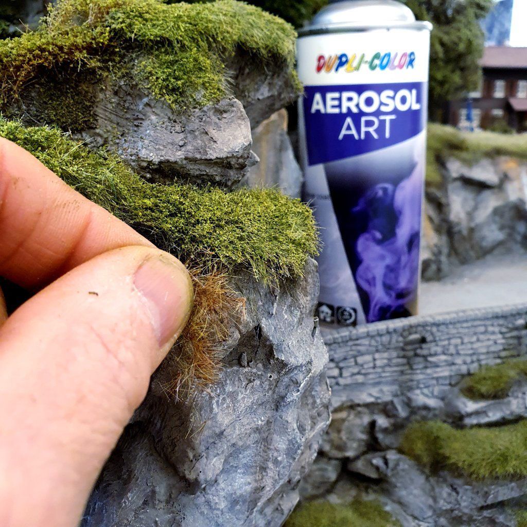 Die Begrünung entsteht aus verschiedensten Streumaterialien und Naturprodukten. Für die Wiesengestaltung verwende ich das starke Maag-Flockgerät. Grasbüschel in alles Grössen werden ebenfalls mit diesem Flockgerät hergestellt.