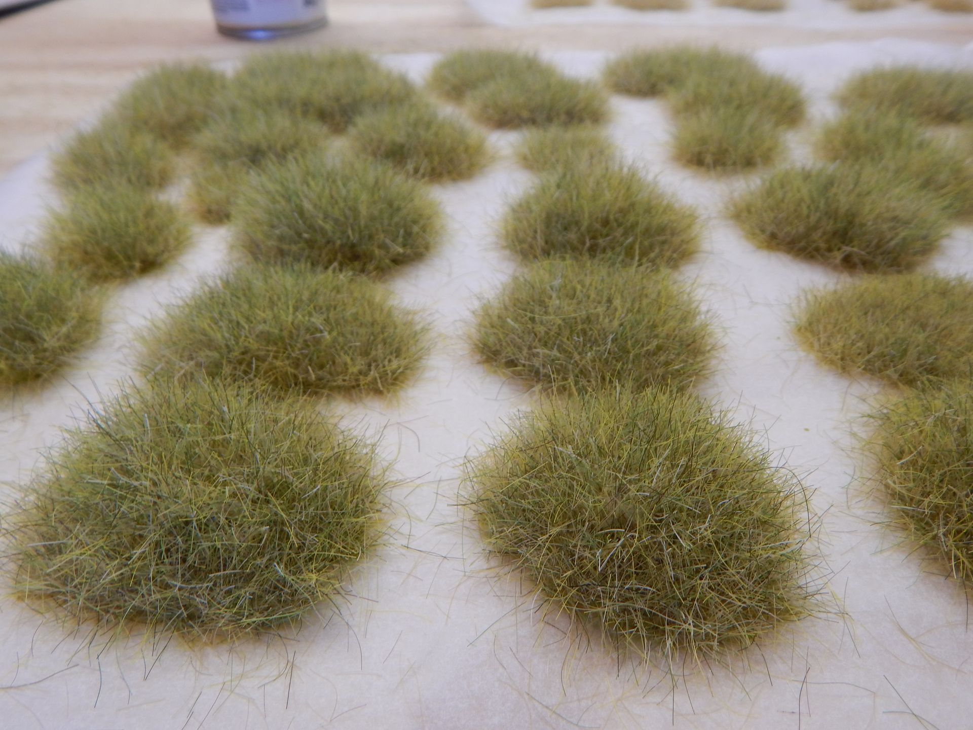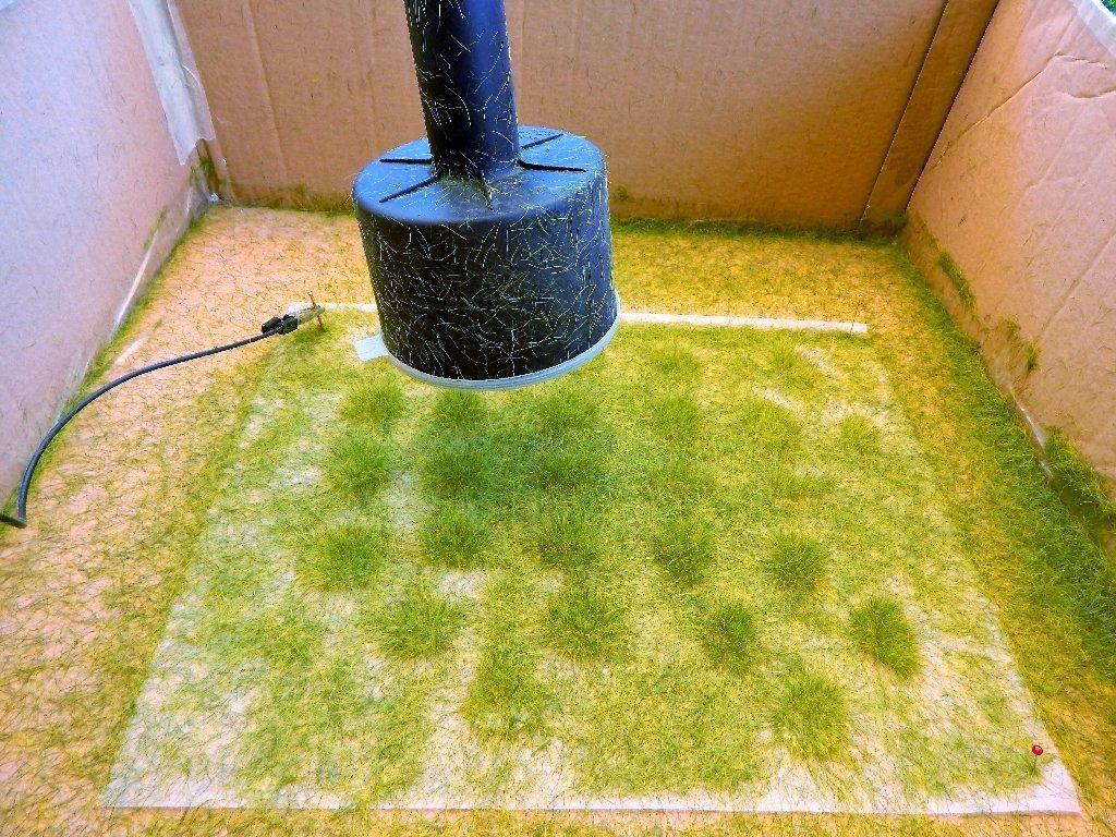 Später folgt eine Schicht Weissleim, in die ich, mit dem Flockgerät, 4-6mm Grassfasern aufsprühe. Nach 24 stündiger Trocknung, werden die nicht haftenden Grassfasern abgesaugt. Mit der Druckluftpistole, befreie ich anschliessend die Flächen, insbesondere alle Ecken und Rillen von den letzten Fasern. Immer wieder erstaunlich, wie viele Grassfasern sich da noch verbargen.
