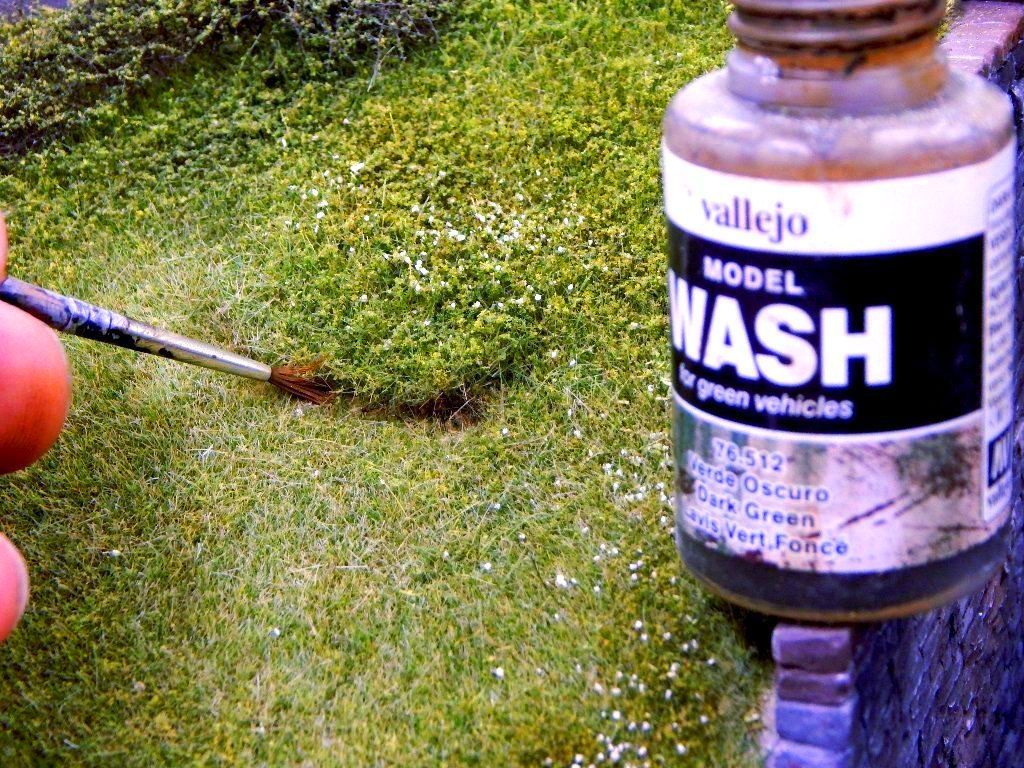Mit einem braungrün Gemisch aus Wash-Lasuren, lassen sich mit Pinsel gut Grasnarben nachbilden. Ebenfalls durch Aufsprühen mit Airprush.