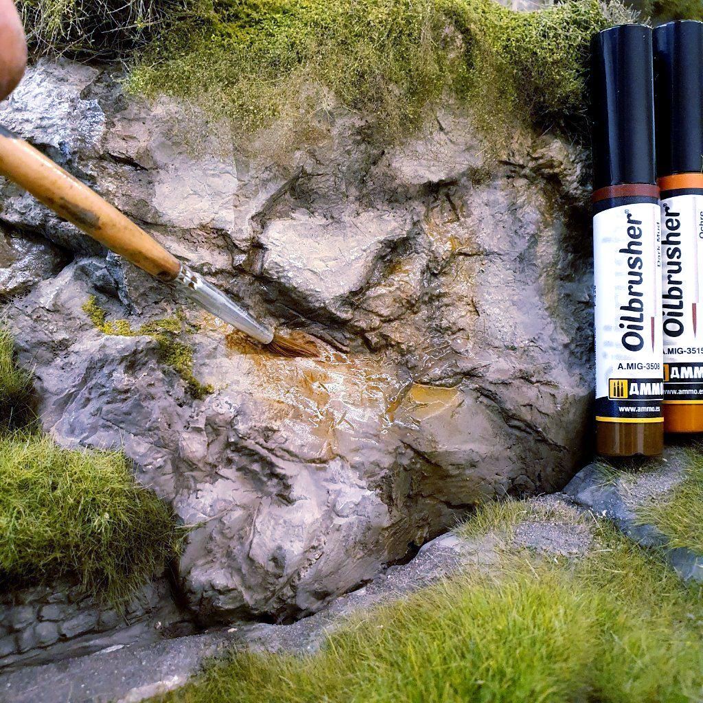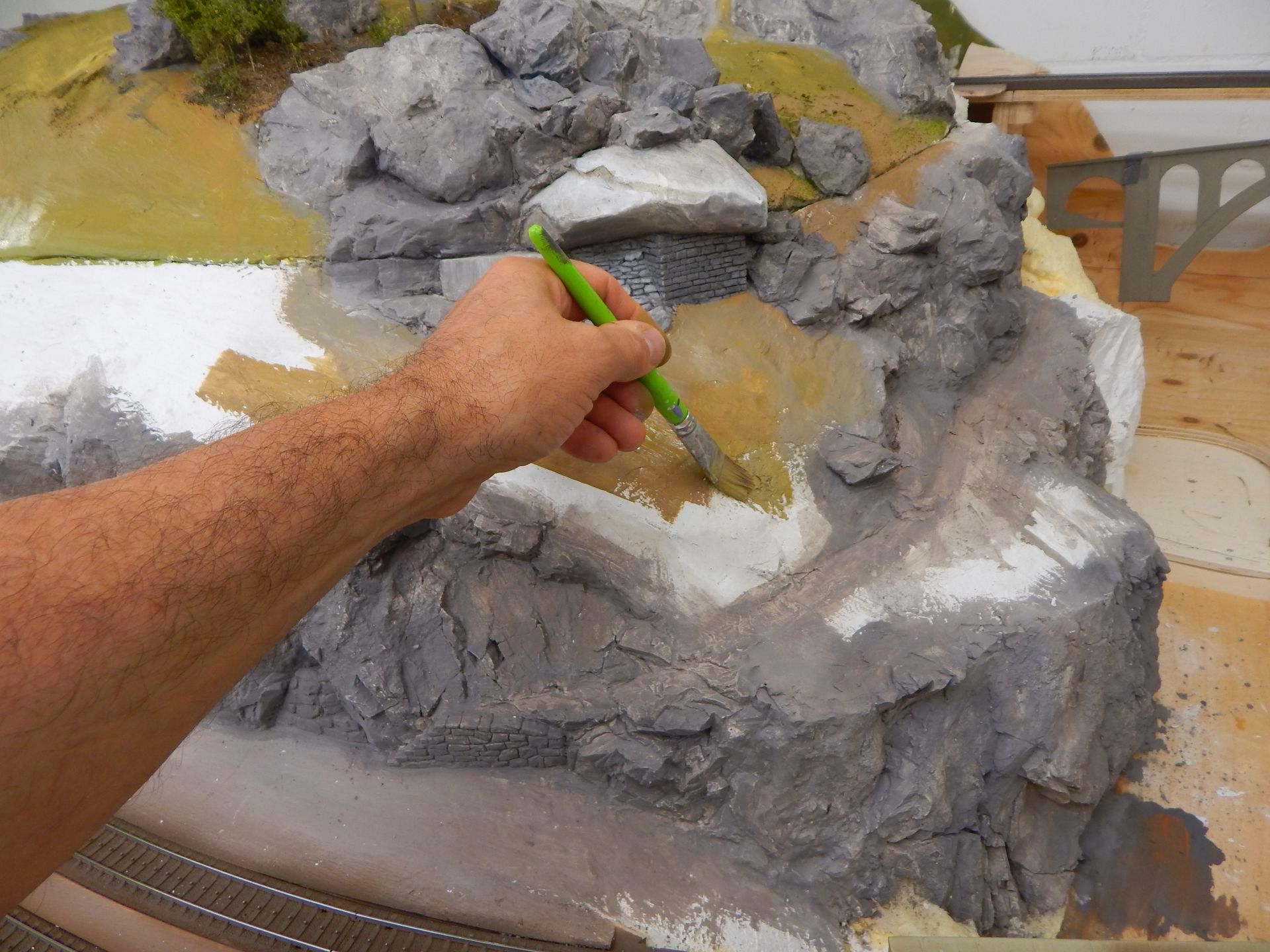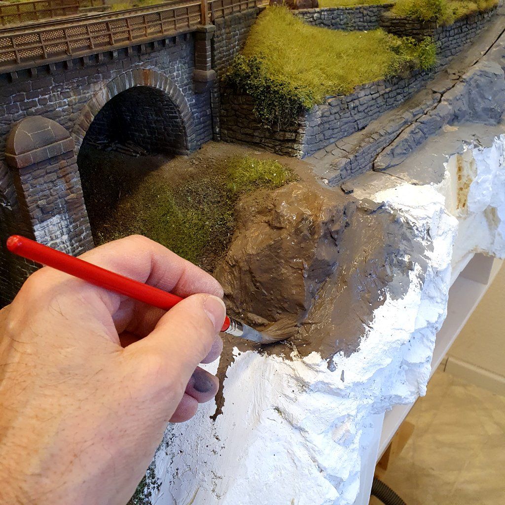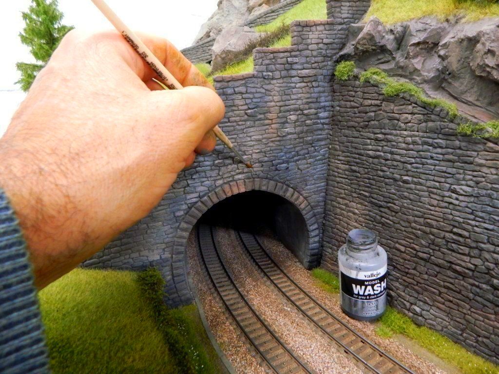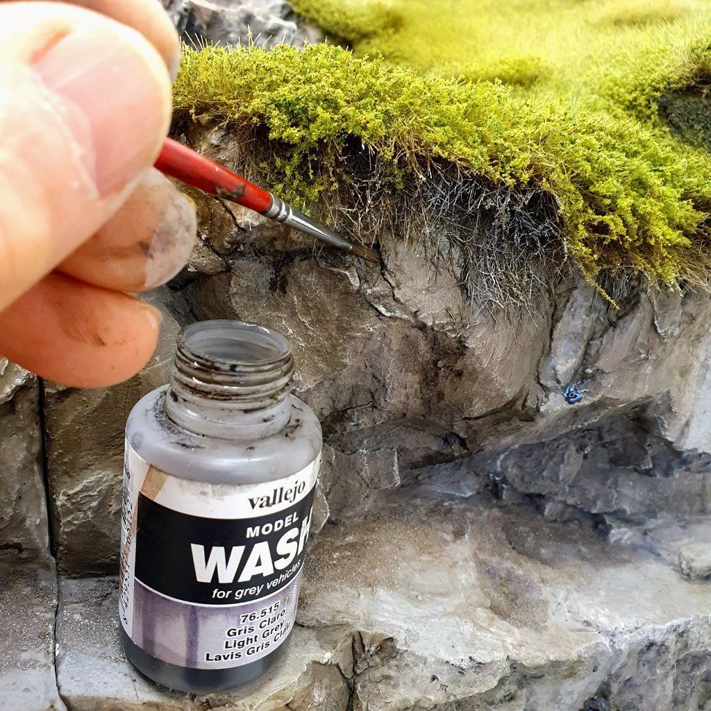 Nachdem die Dispersionsfarben gut getrocknet sind, werden 2-3 Schichten der wässerigen Lasurfarben von Vallejo WASH aufgetragen. Die Farbe dringt in jede Ritze der Felsen und es entsteht eine enorme Tiefenwirkung. Das selbe gilt auch für Mauerwerk von Brücken und Tunnelportalen etc. Um eine wirklich gute Tiefenwirkung zu erreichen, ist es von Vorteil, diesen Vorgang einige Male zu wiederholen, da das WASH nach dem Trocknen stark aufhellt.