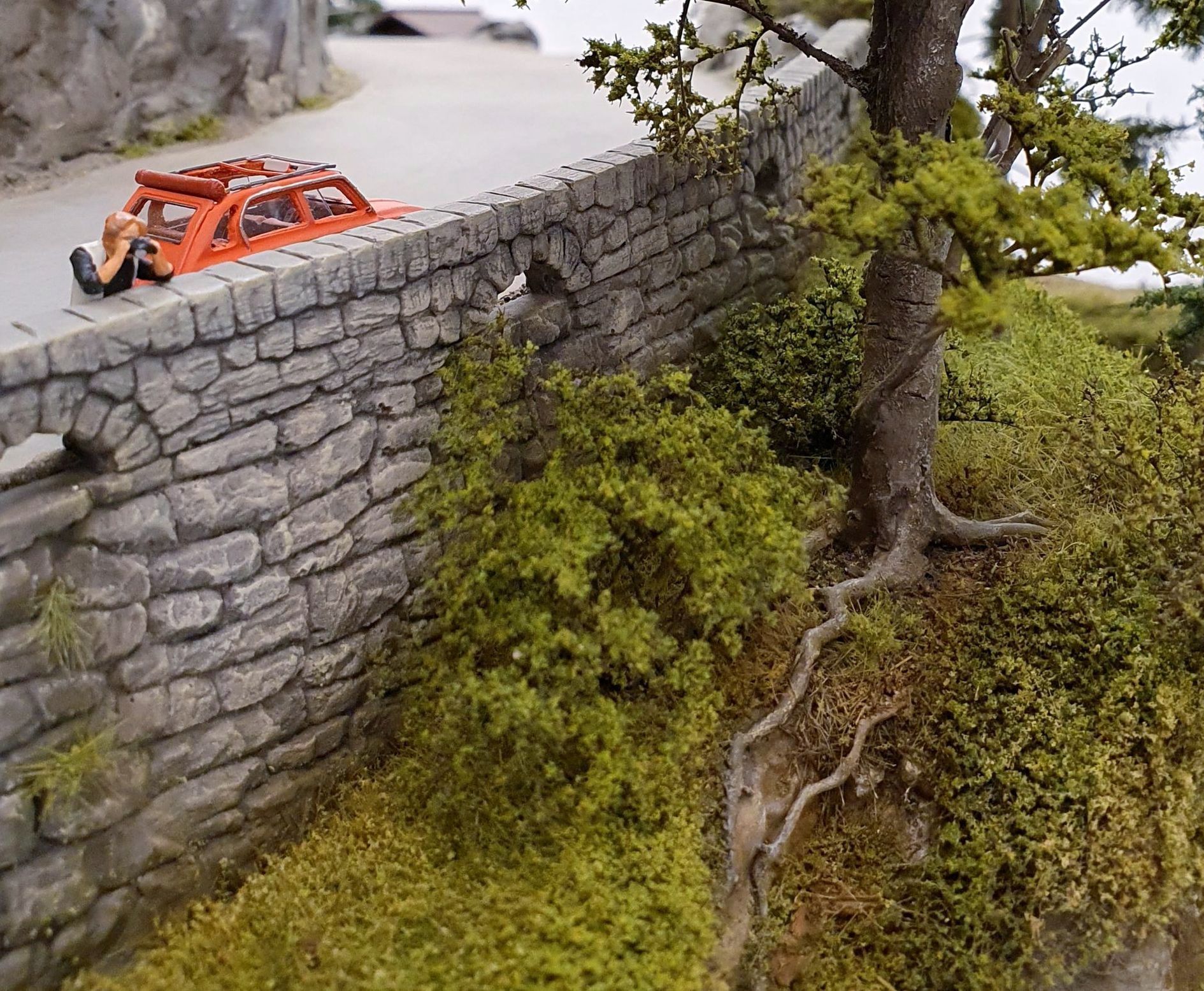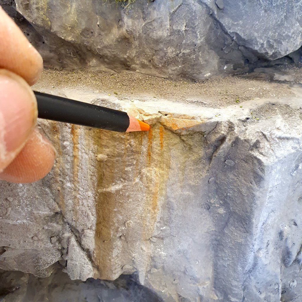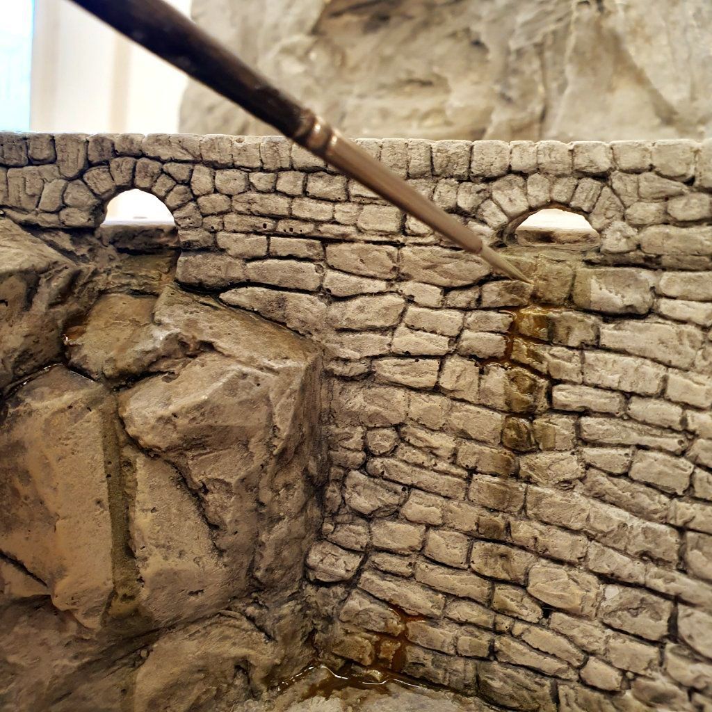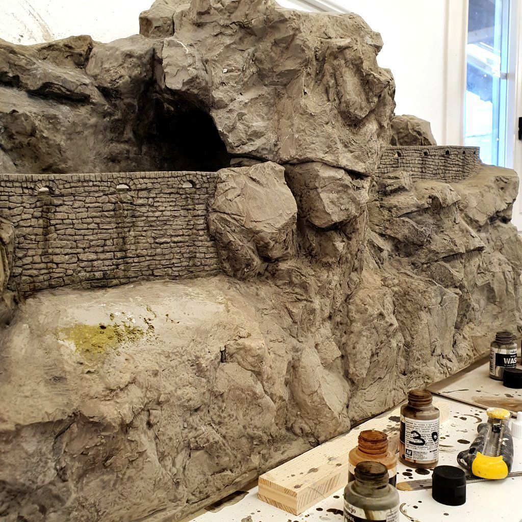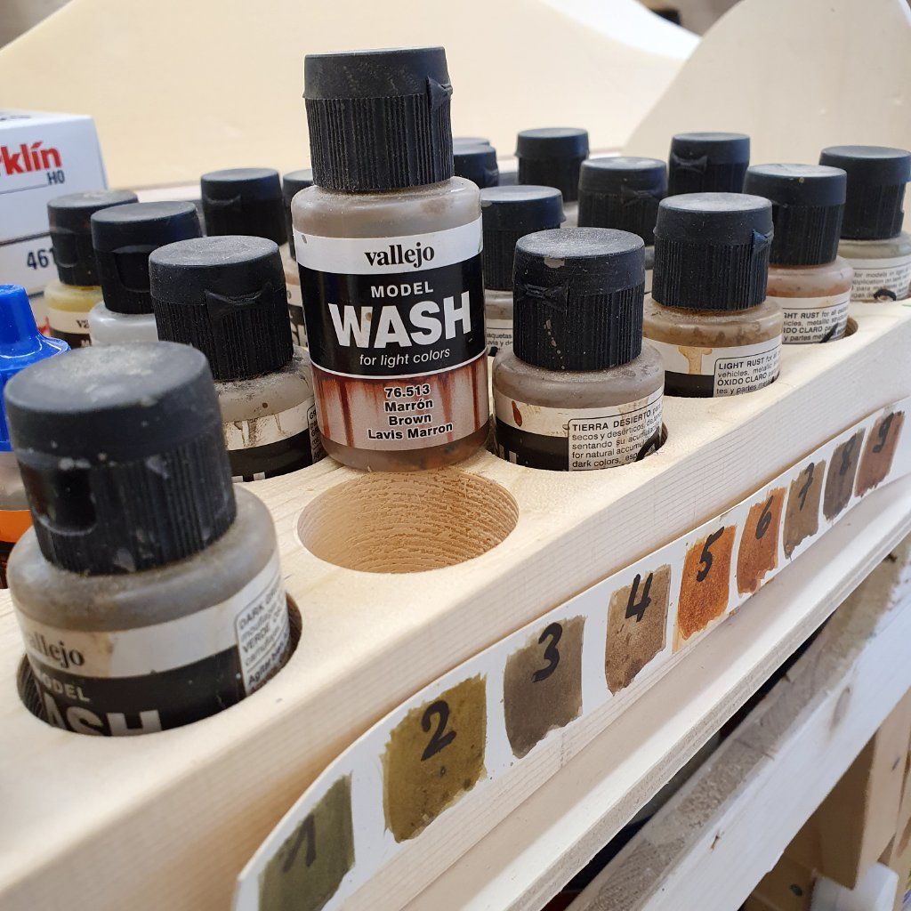 Nachdem die Dispersionsfarben gut getrocknet sind, werden 2-3 Schichten der wässerigen Lasurfarben von Vallejo WASH aufgetragen. Die Farbe dringt in jede Ritze der Felsen und es entsteht eine enorme Tiefenwirkung. Das selbe gilt auch für Mauerwerk von Brücken und Tunnelportalen etc. Um eine wirklich gute Tiefenwirkung zu erreichen, ist es von Vorteil, diesen Vorgang einige Male zu wiederholen, da das WASH nach dem Trocknen stark aufhellt.