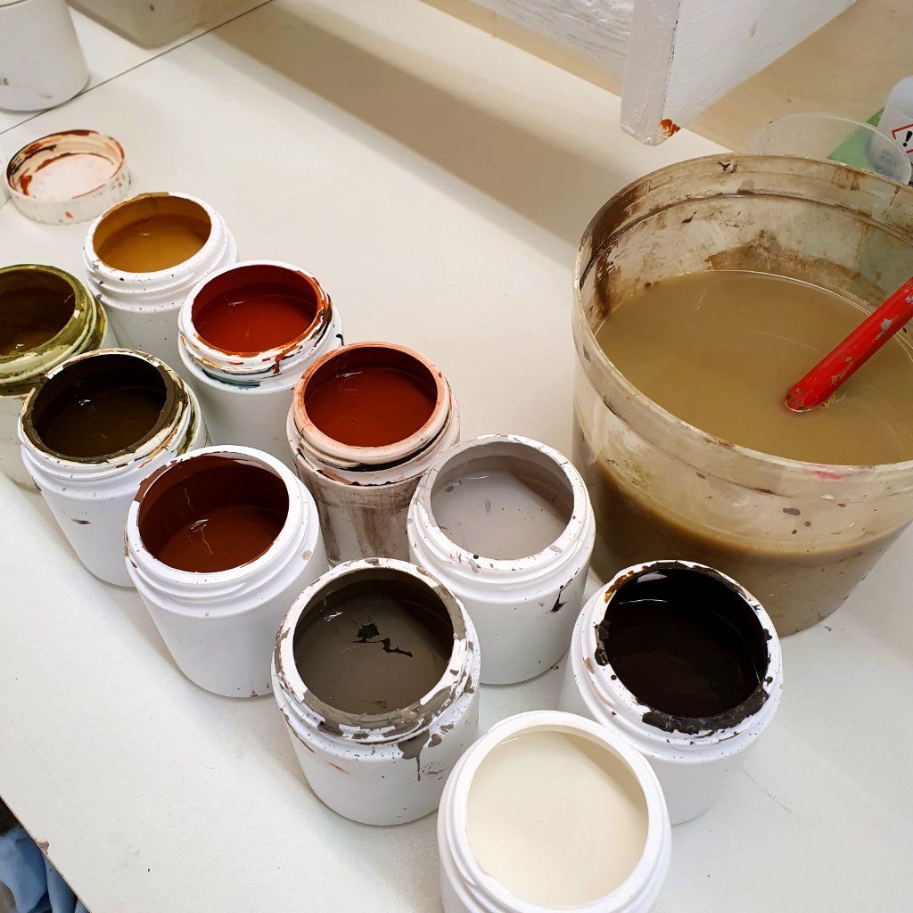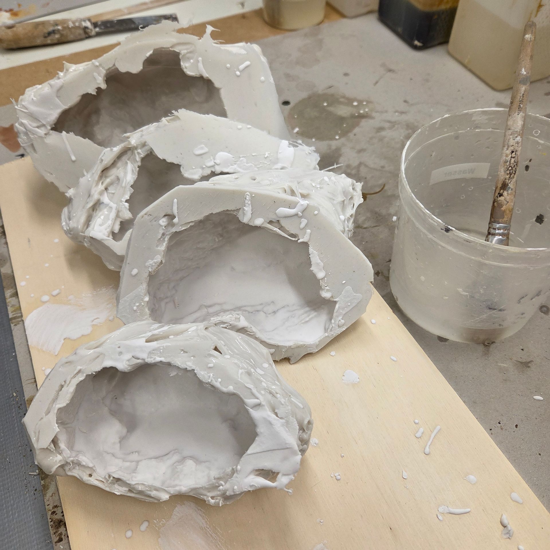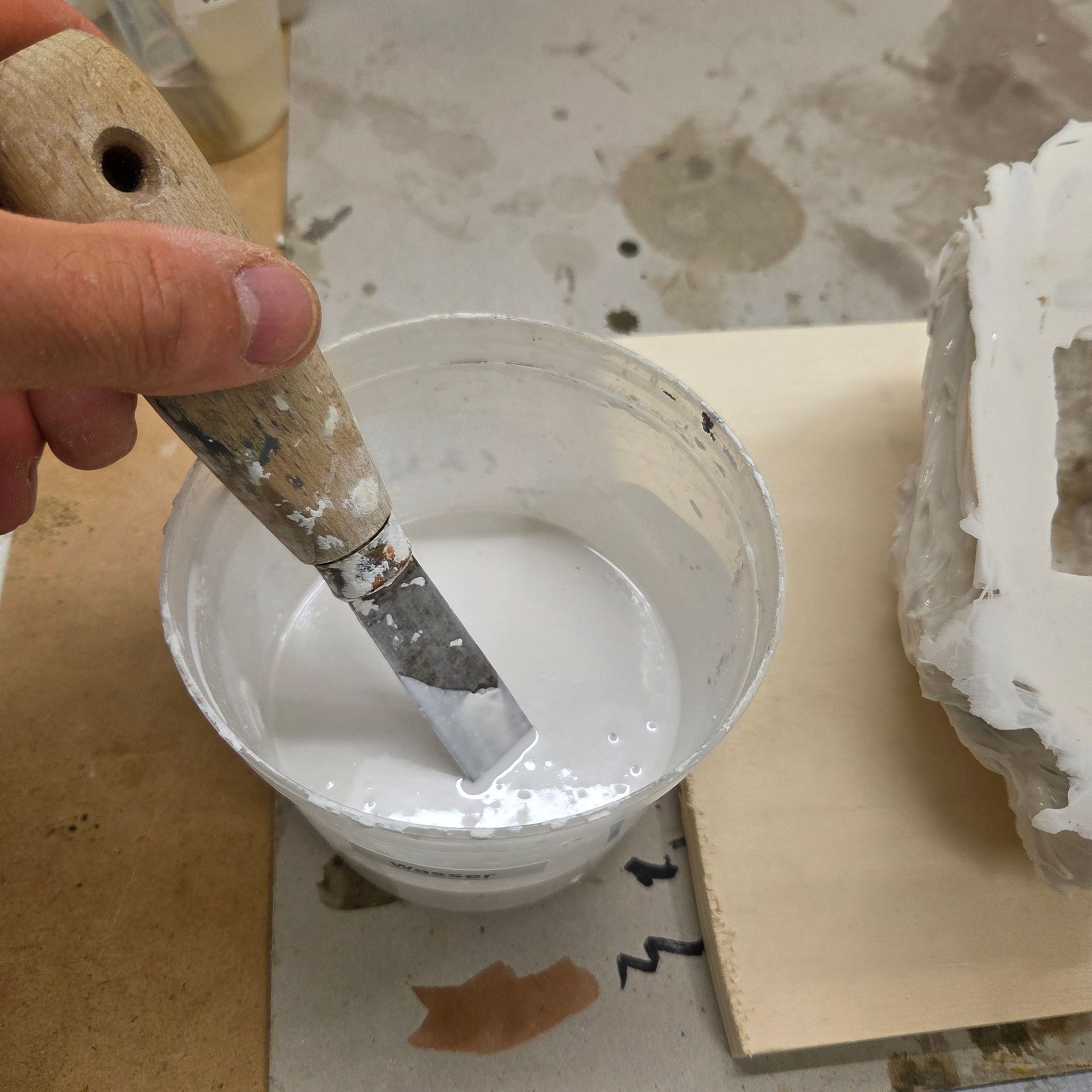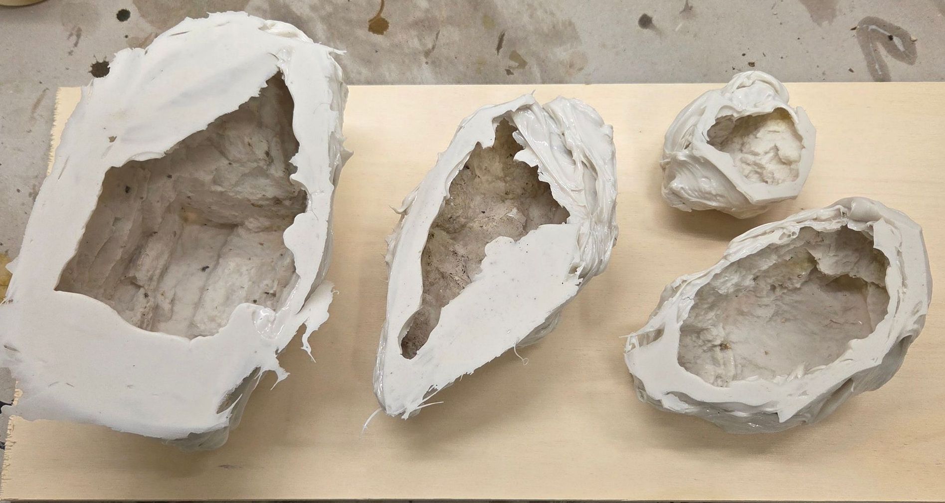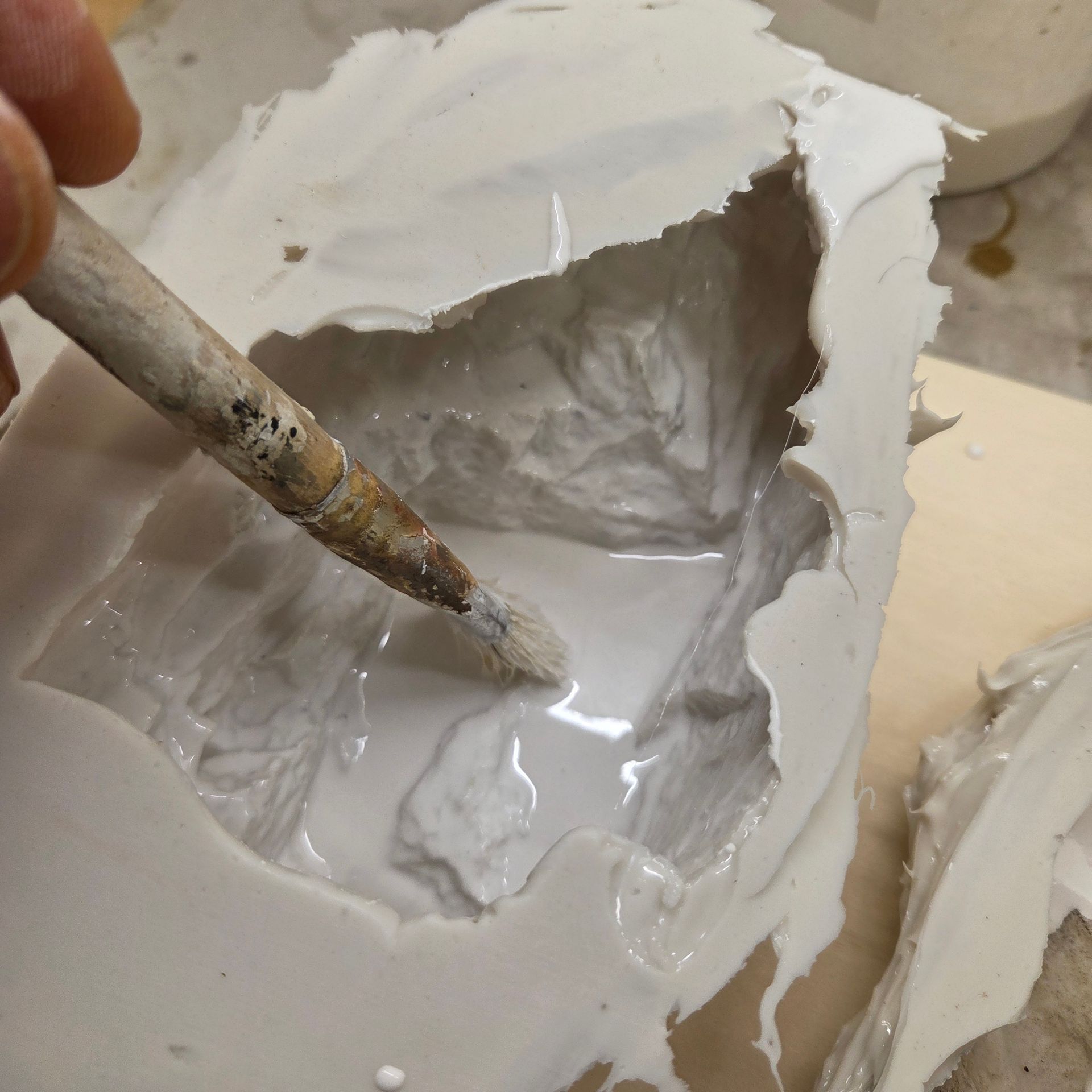 Die Silikonformen bestreiche ich mit 2-3 Schichten Keramikmasse. Nach dem trocknen, streiche ich noch eine Schicht zwei Komponenten Hartschaum auf, somit wird die relativ dünne Schicht Keramikmasse weitgehend Bruchsicher, beim trennen von der Silikonform.