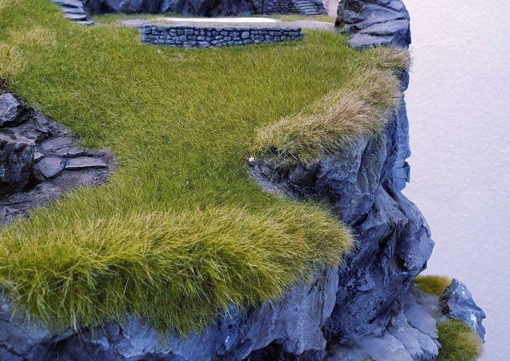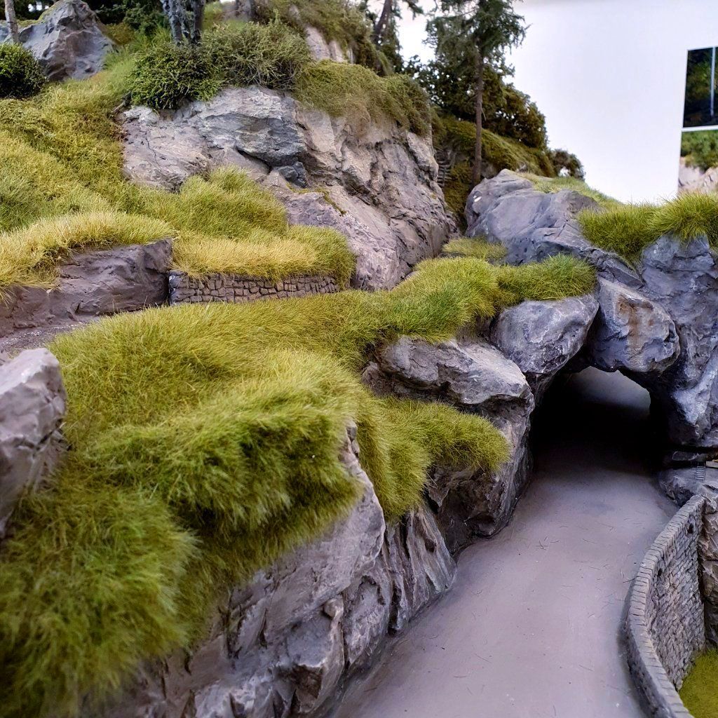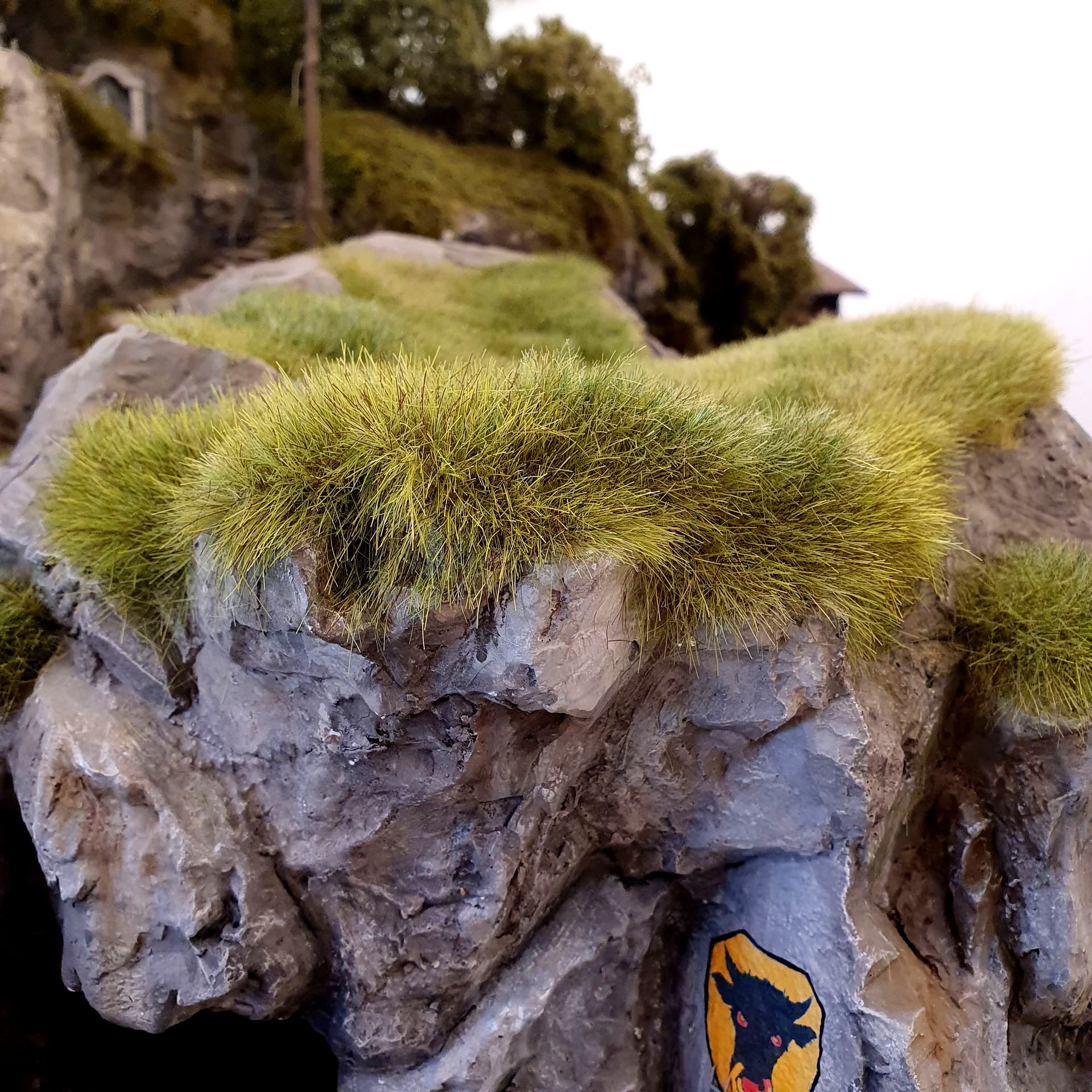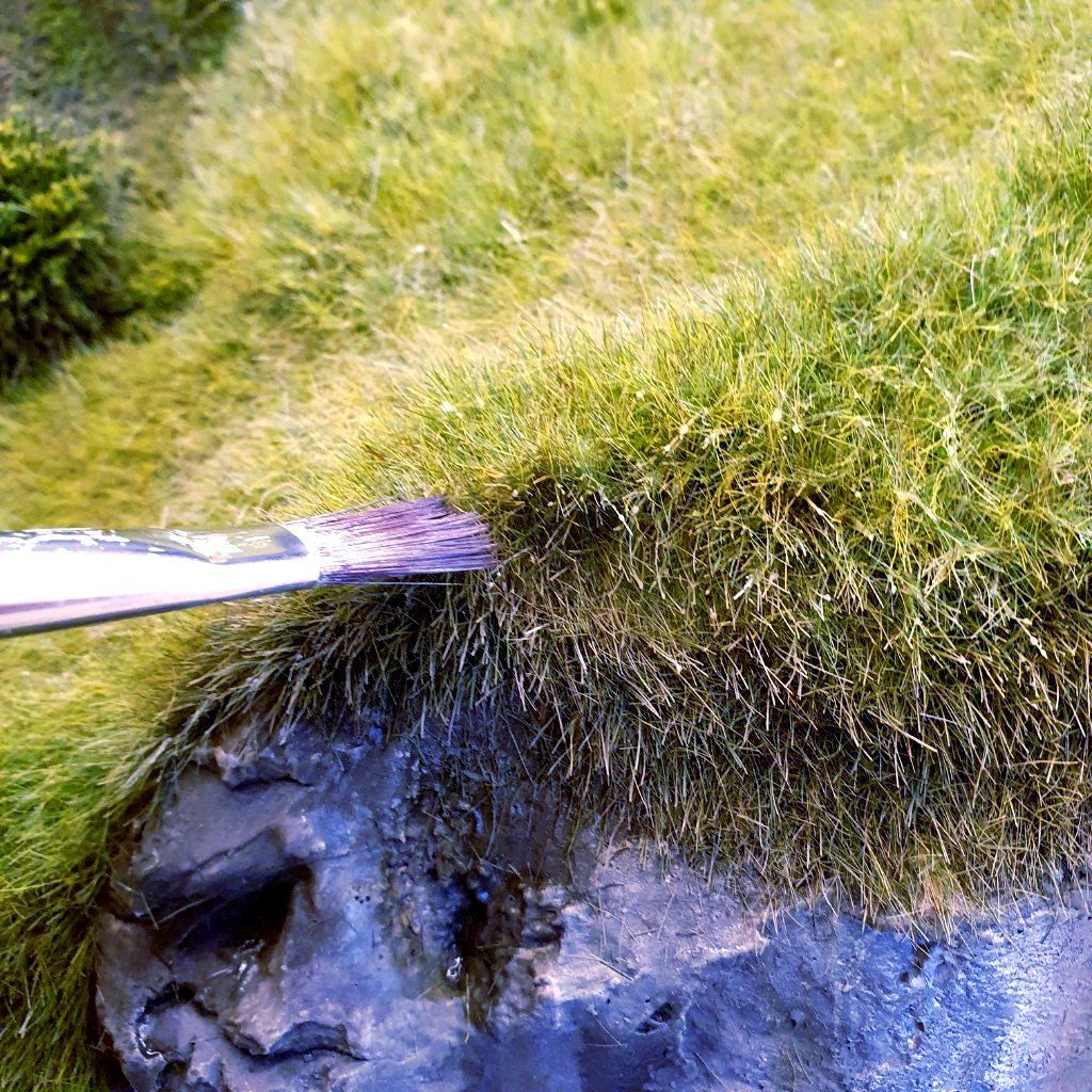 In einem weiteren Schritt, besprühe ich die Wiesenflächen, die an Felsränder grenzen, mit etwas Sprühkleber und beflocke diese weitere 1-2 male mit 10-12mm Grasfasern, um später größere Gräser und Büsche darzustellen. Nach der Reinigung mit Druckluft, besprühe ich die unterseite der Gräser mit brauner Farbe und anschließend bemale ich diese mit fast trockenem Pinsel in weiß, um vertrocknete Gräser zu imitieren.