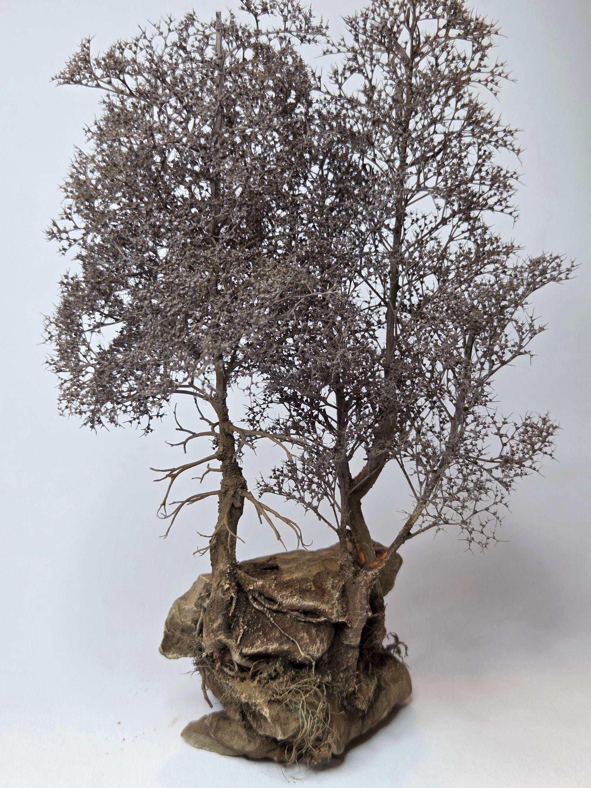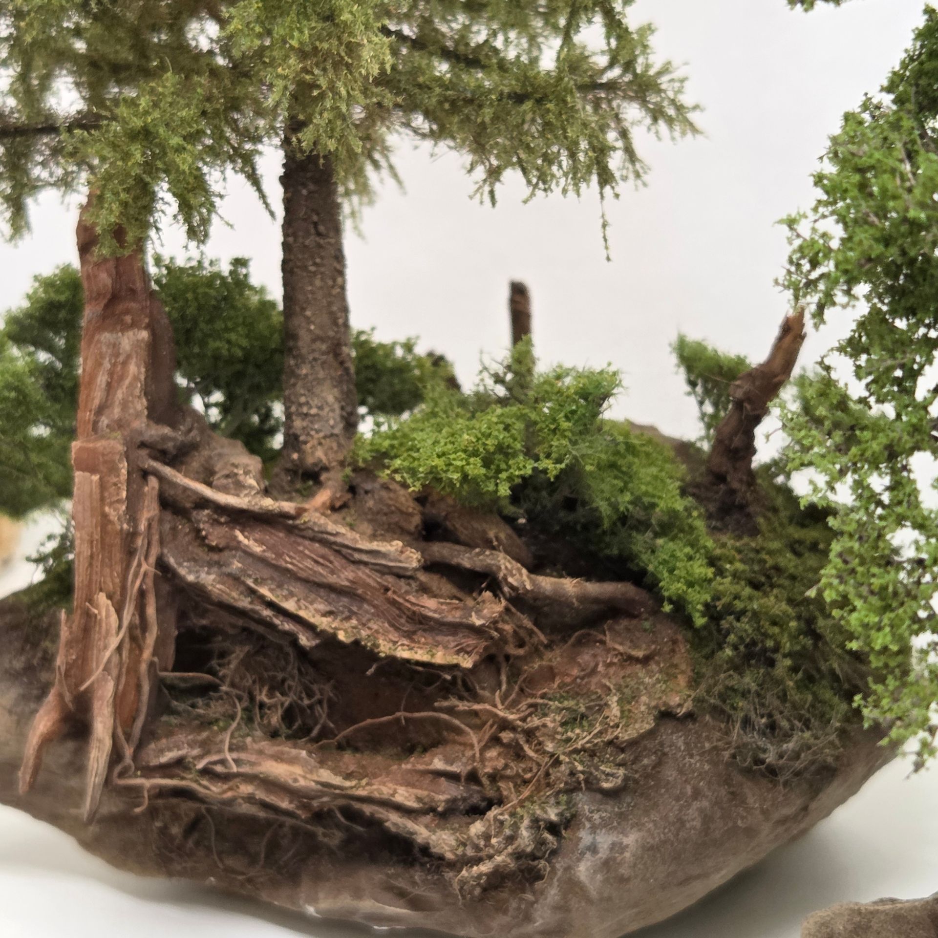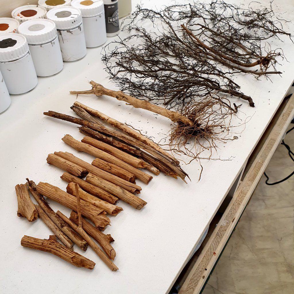 Für die Darstellung von knorrigen Bäumen, verwende ich feine Wurzeln von umgefallenen Bäumen, die ich auf meinen Wanderungen gesammelt habe.