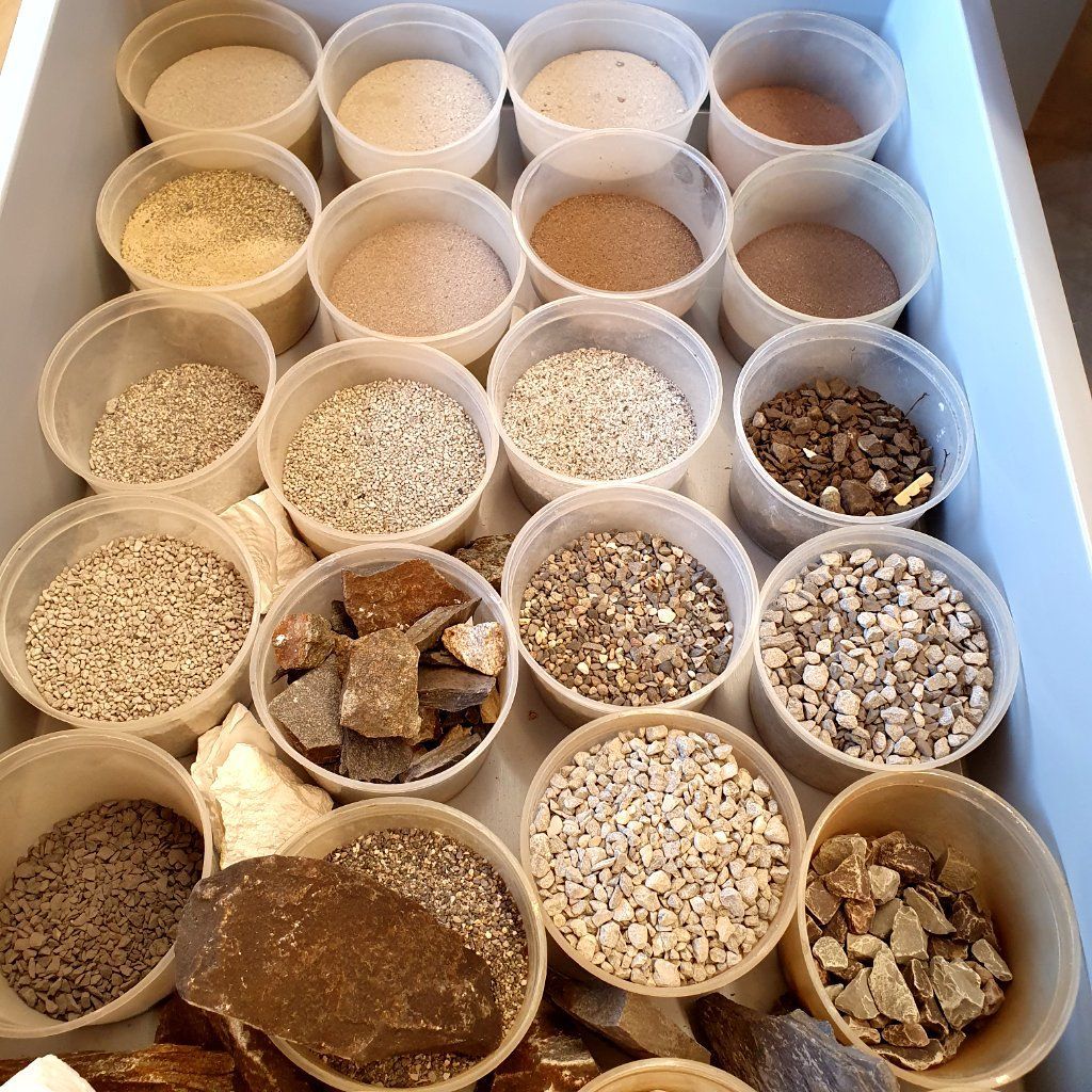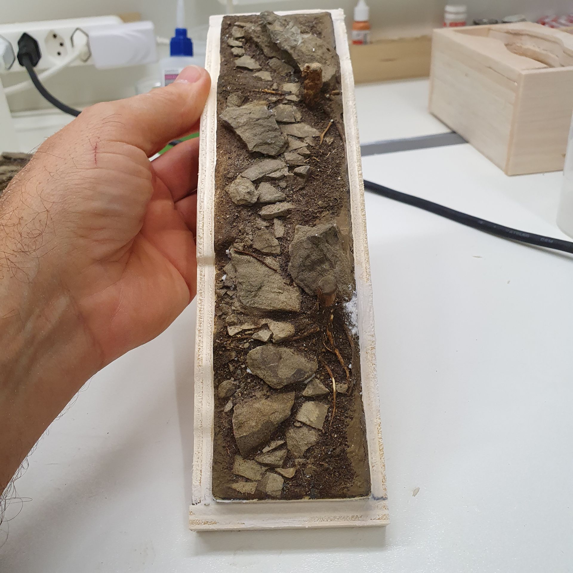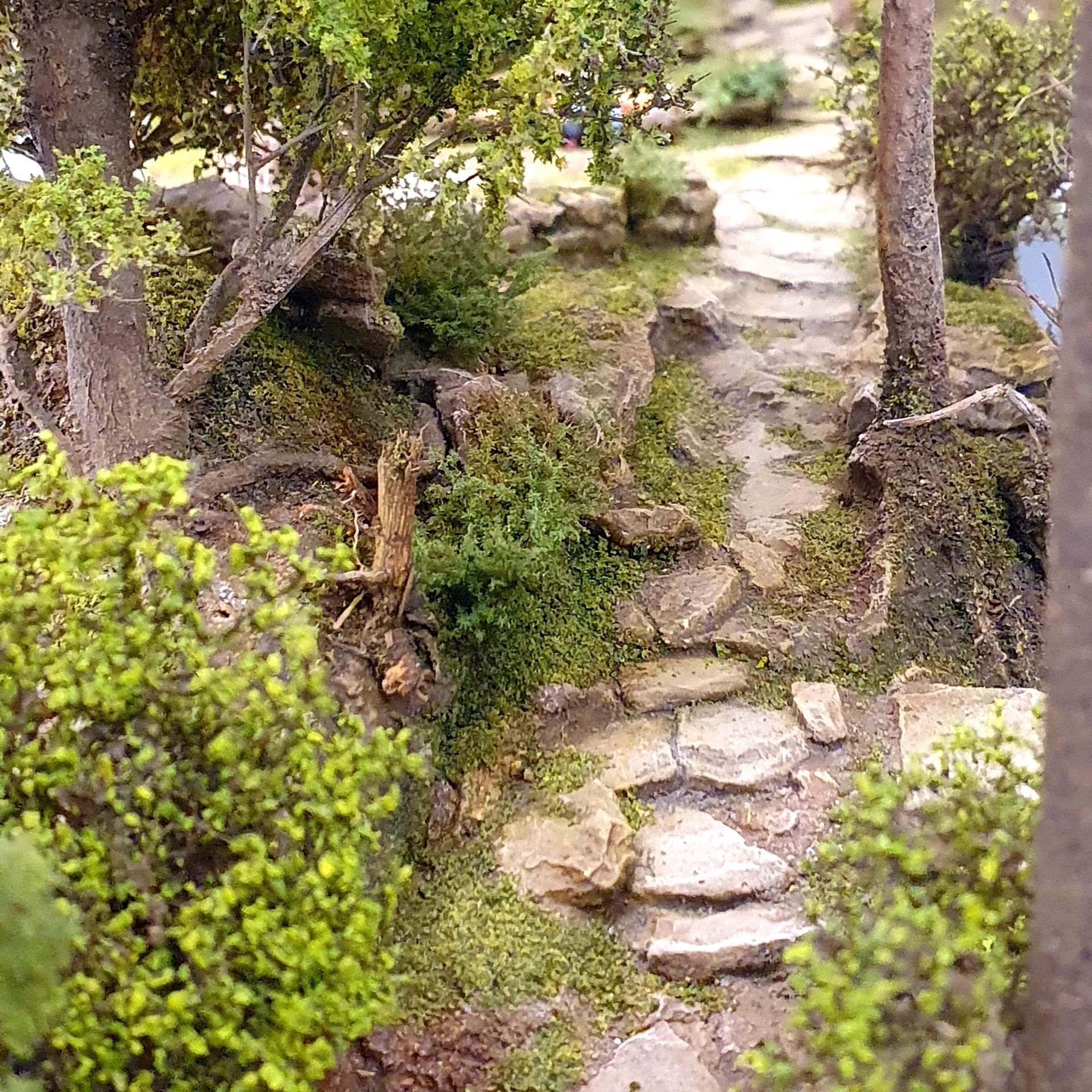Für die Darstellung von Waldboden, Wanderwegen und Kiesplätze, verwende ich feinen Quarzsand, den ich mit Pan-Pastellkreiden einfärbe oder verwende das Erdsortiment von RTS, mit sehr realistischen Farbtönen. Ebenfalls kommt echte Waldbodenerde zum Einsatz.