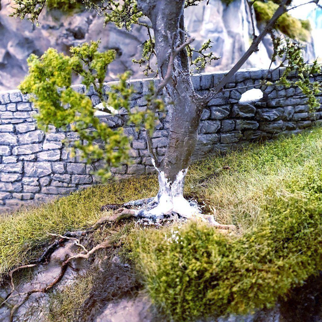 Wer Lust hat, kann auch nach dem Einpflanzen eines Seemoosbaums Wurzeln mit Moltofil nachbilden. Diese habe ich mit der Spachtelmasse an den Stamm modelliert und mit echten, feinen Wurzeln ergänzt. Anschließend wird das Ganze noch mit graubrauner Acrylfarbe bemalt.