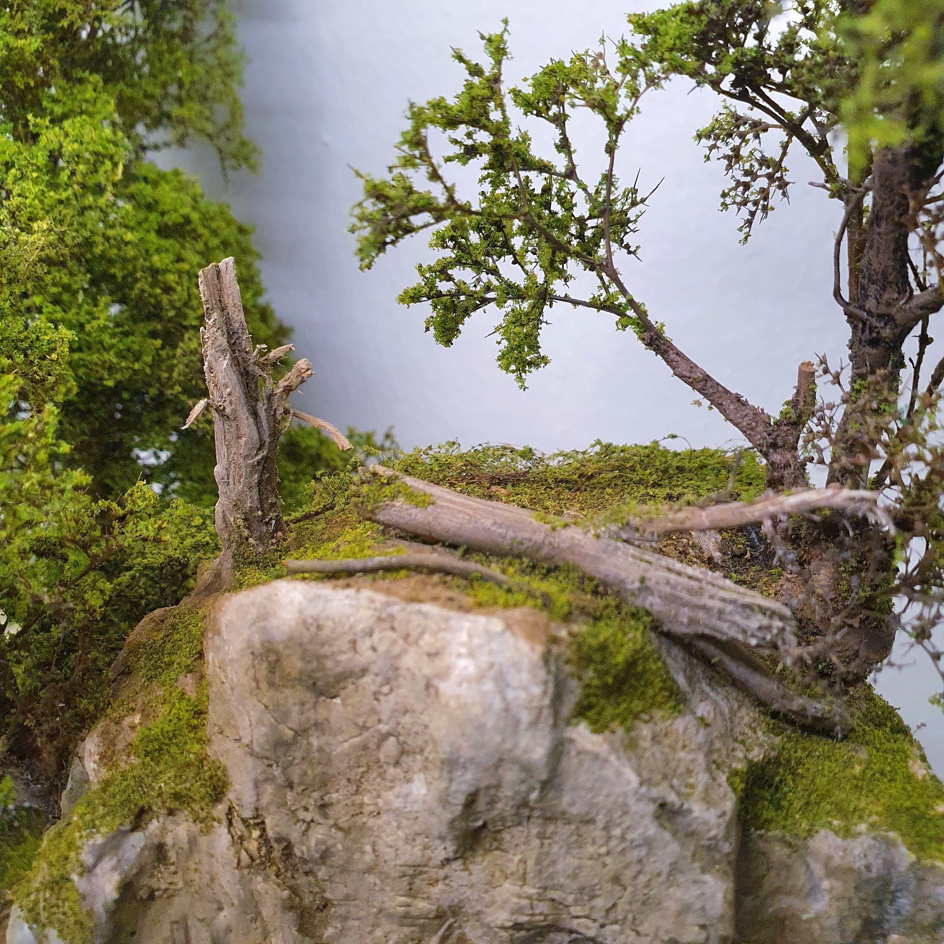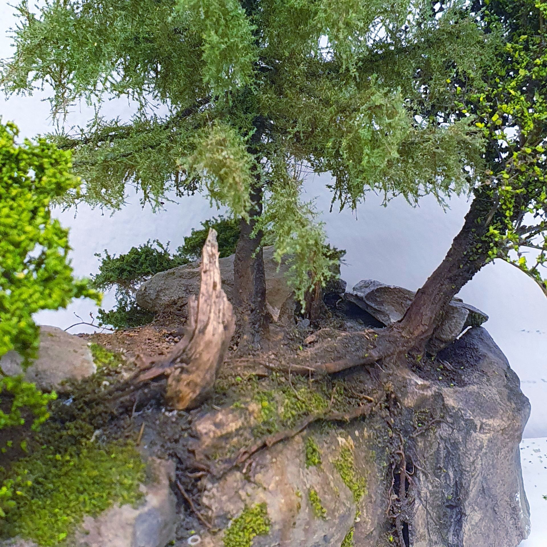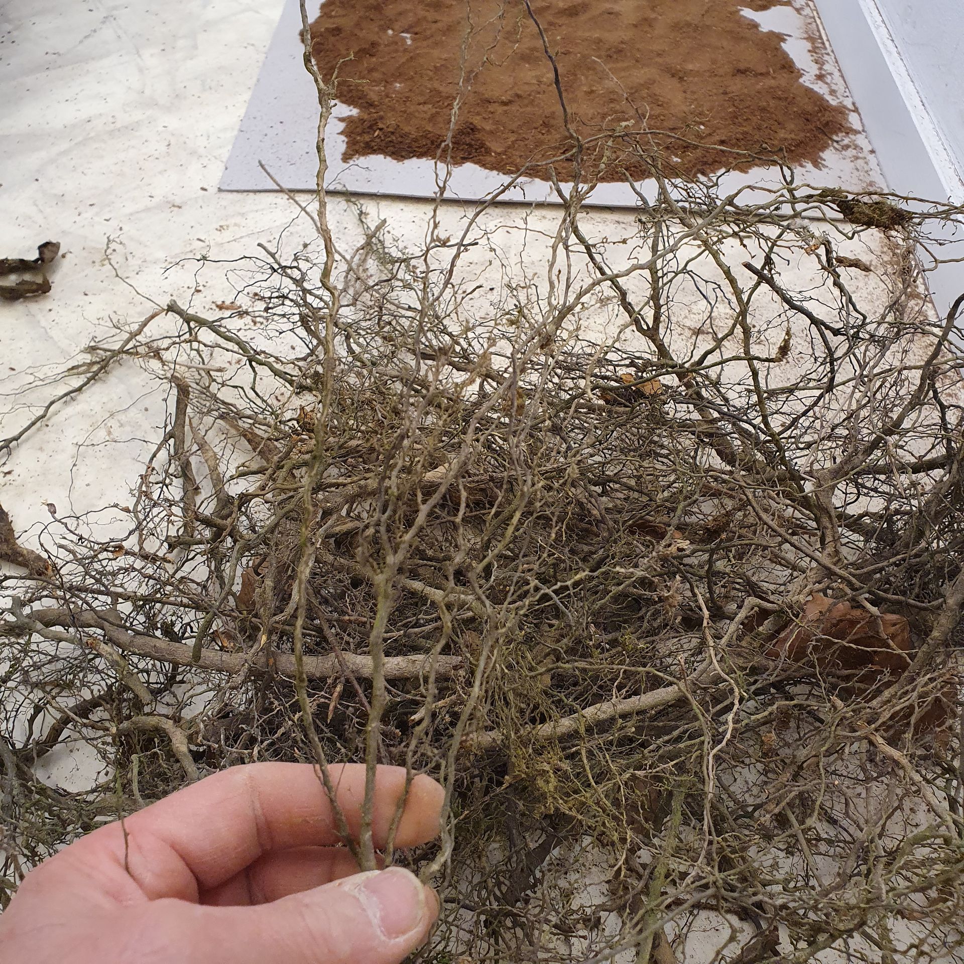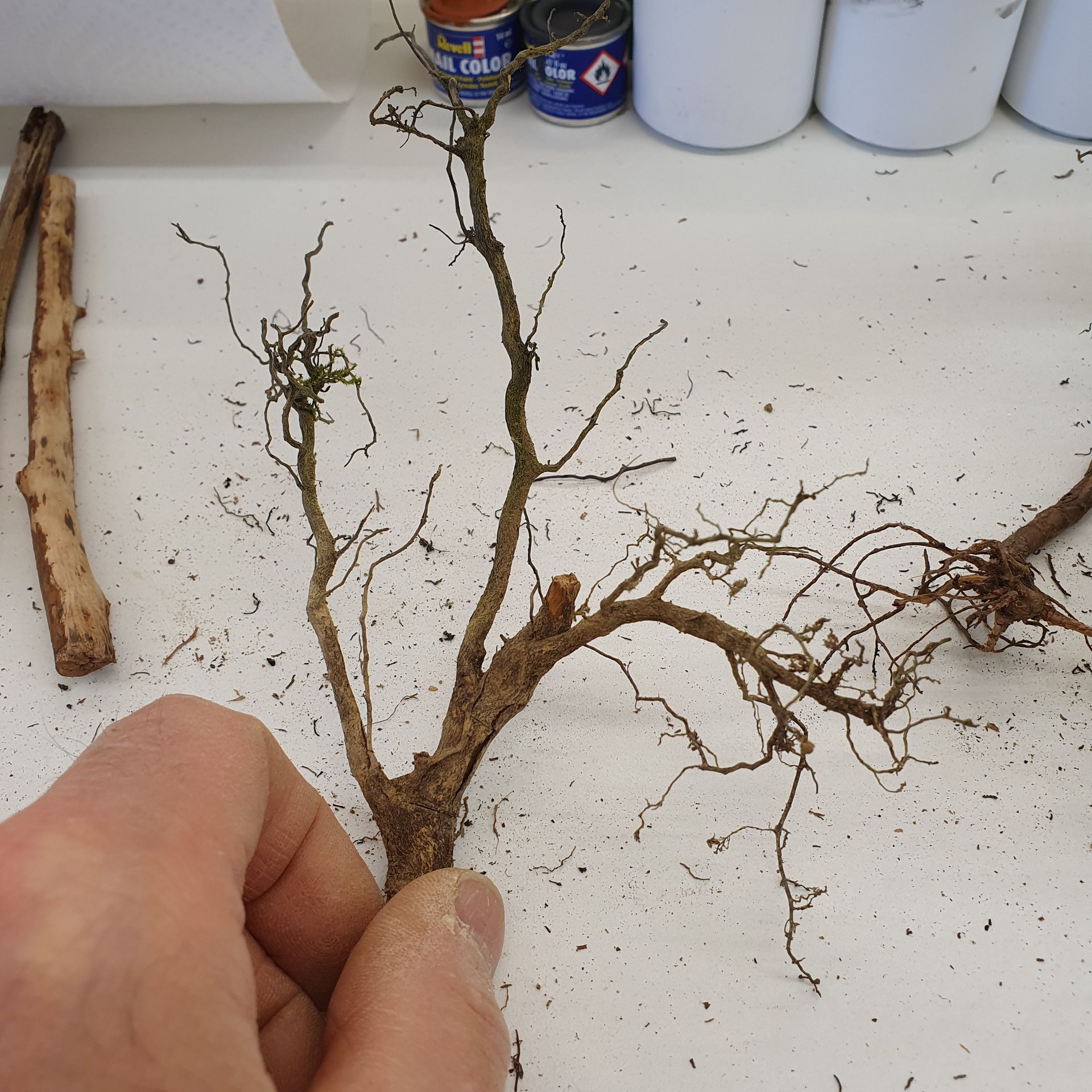 Vor dem Einfärben der Seemooszweige mit der Spraydose oder Airbrush, binde ich ebenfalls kleinere Zweige mit feinem Draht zu Büschen zusammen. Oder stelle mit Seemooszweigen und Wurzeln alte knorrige Bäume her, wie sie oft in Bergregionen anzutreffen sind.