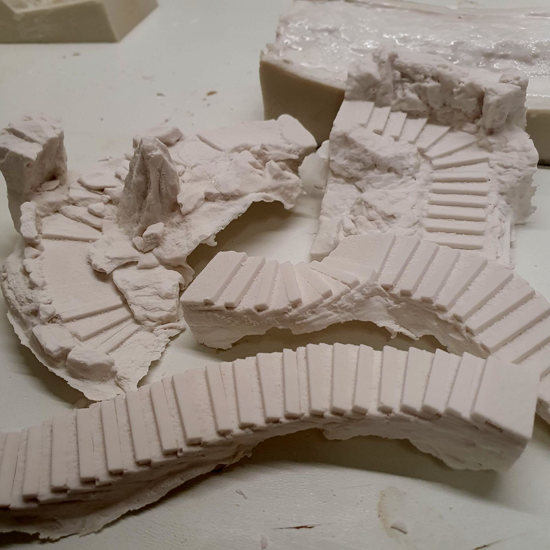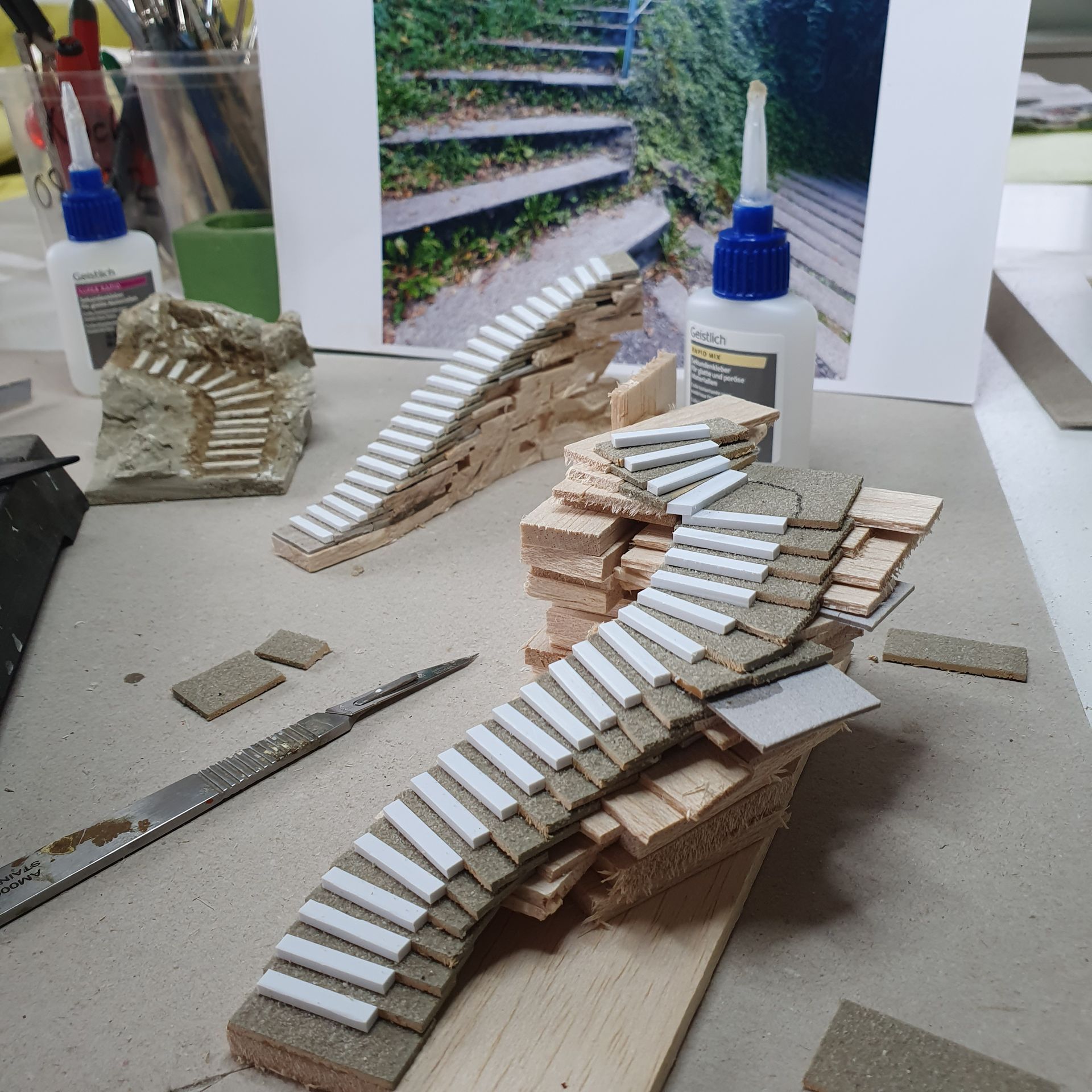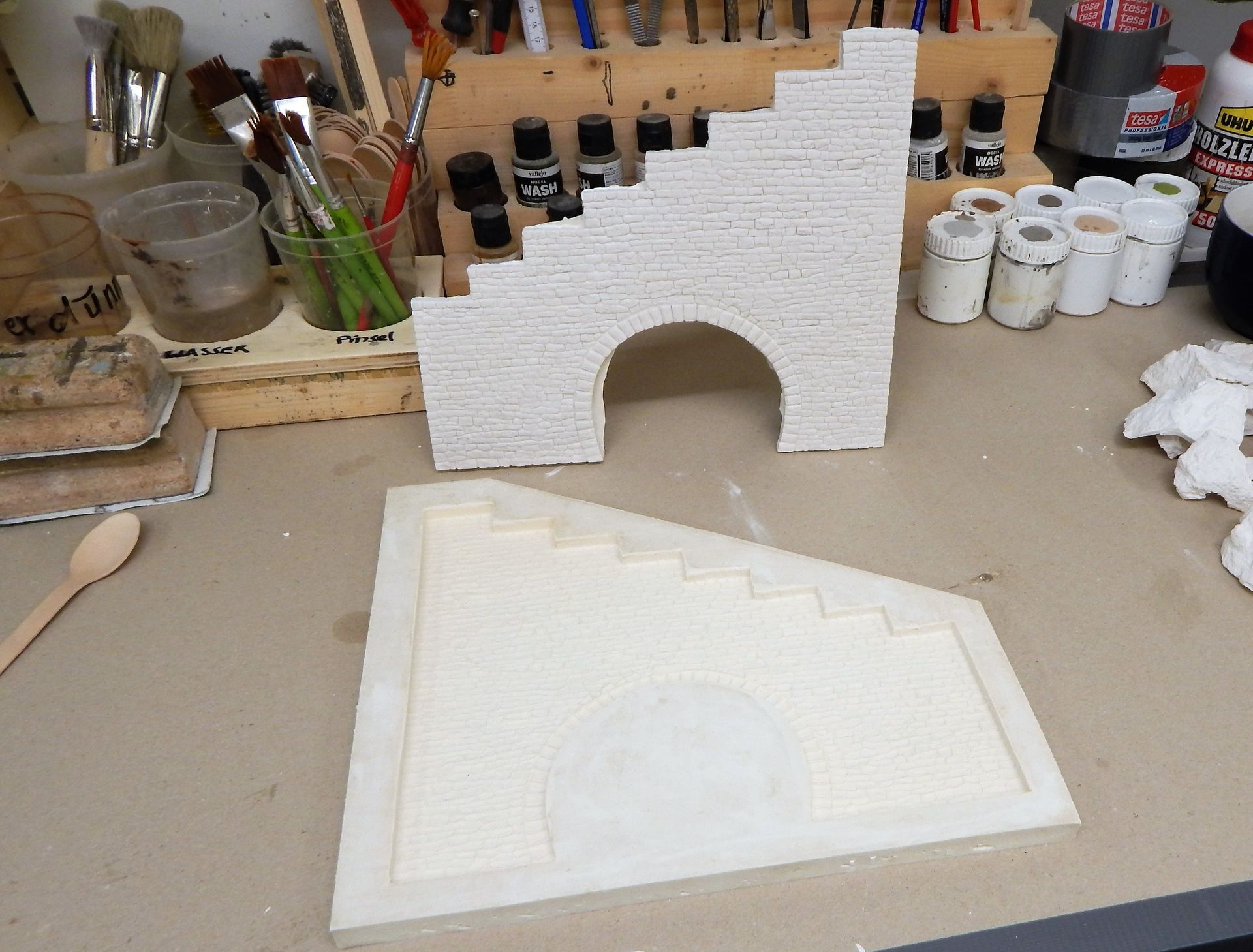 Da ich mich entschlossen habe, ringsum die Anlage einen Wanderweg anzulegen, habe ich kleinere Treppenmodule in verschiedenen Varianten modelliert und davon Silikonformen hergestellt. Einige Abgüsse davon habe ich bereits verbaut.