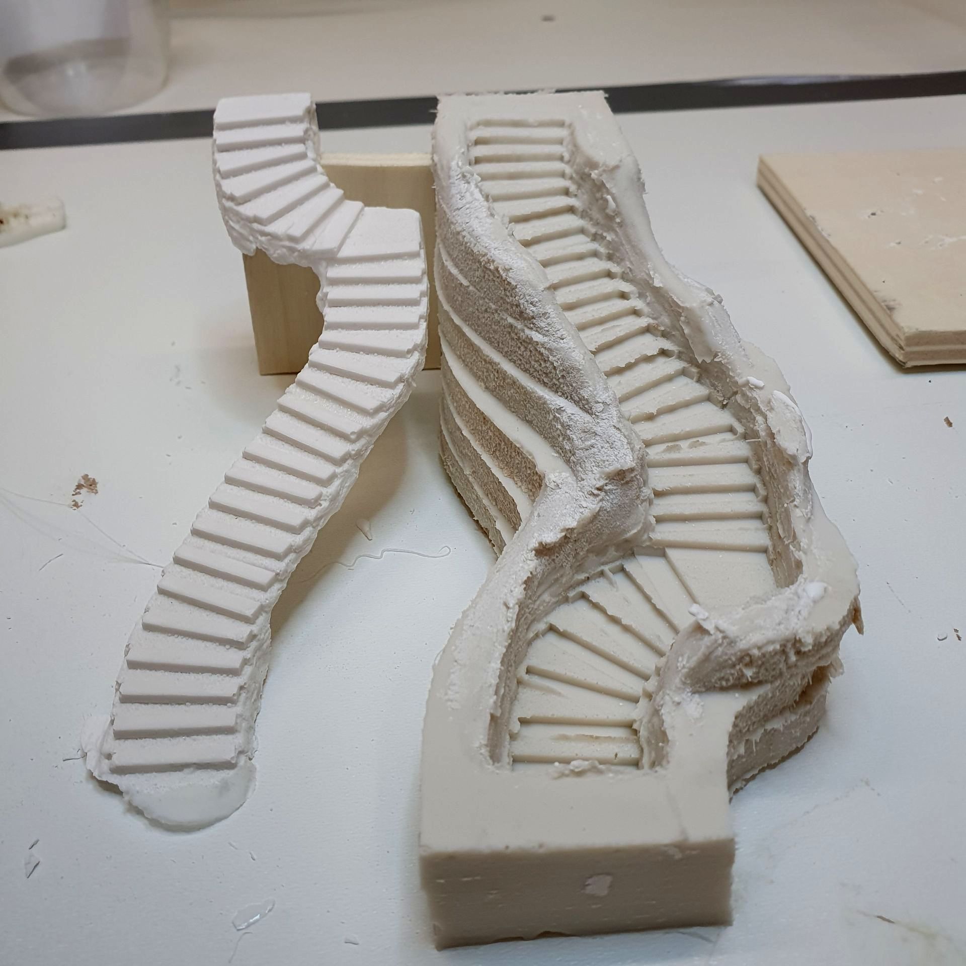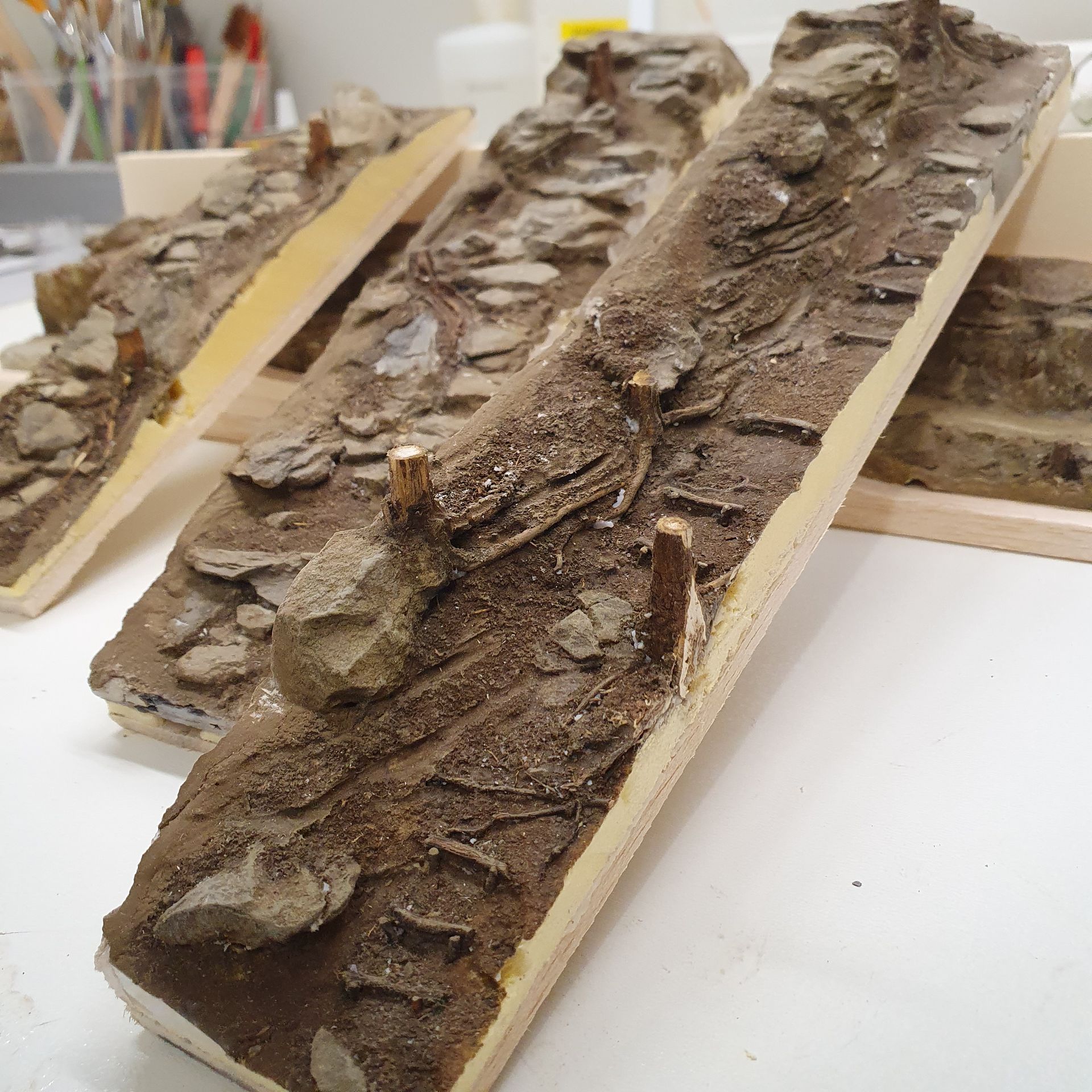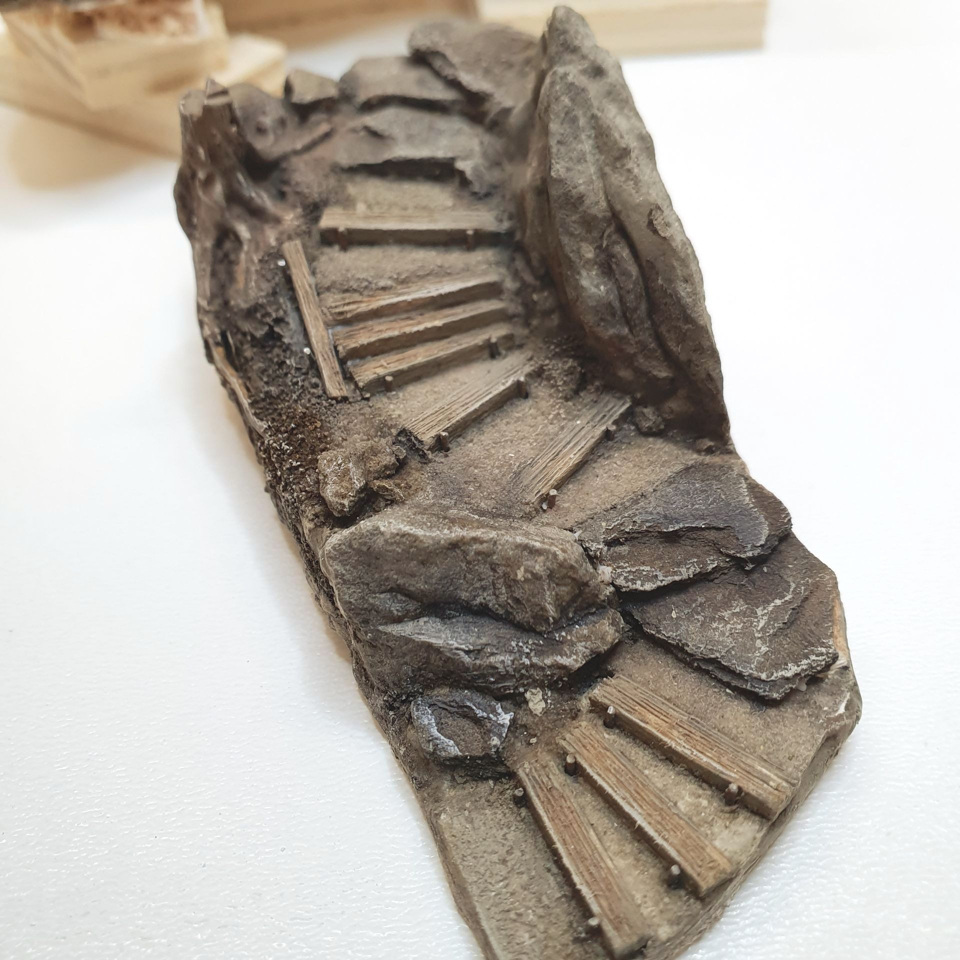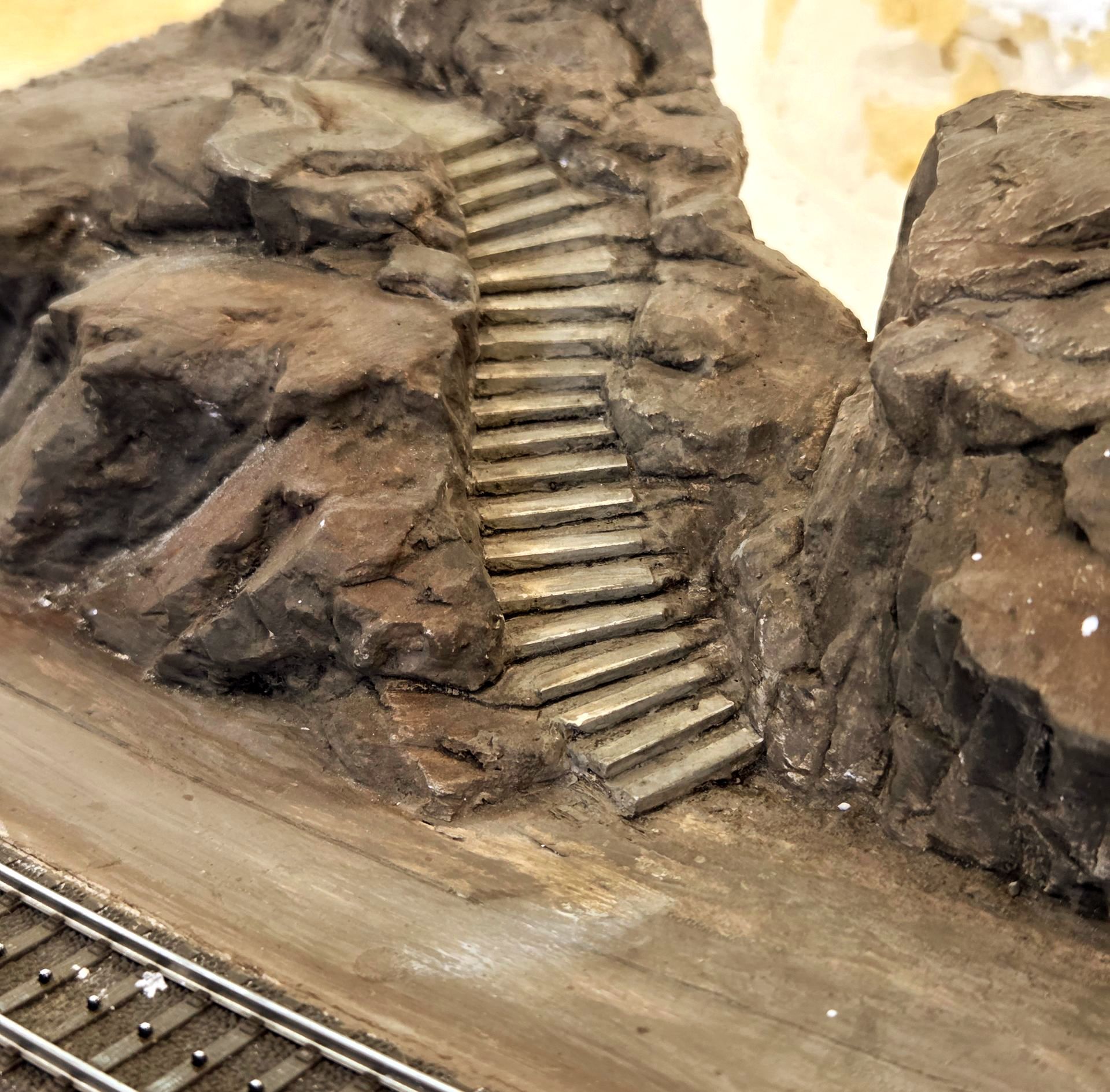 Da ich mich entschlossen habe, ringsum die Anlage einen Wanderweg anzulegen, habe ich kleinere Treppenmodule in verschiedenen Varianten modelliert und davon Silikonformen hergestellt. Einige Abgüsse davon habe ich bereits verbaut.