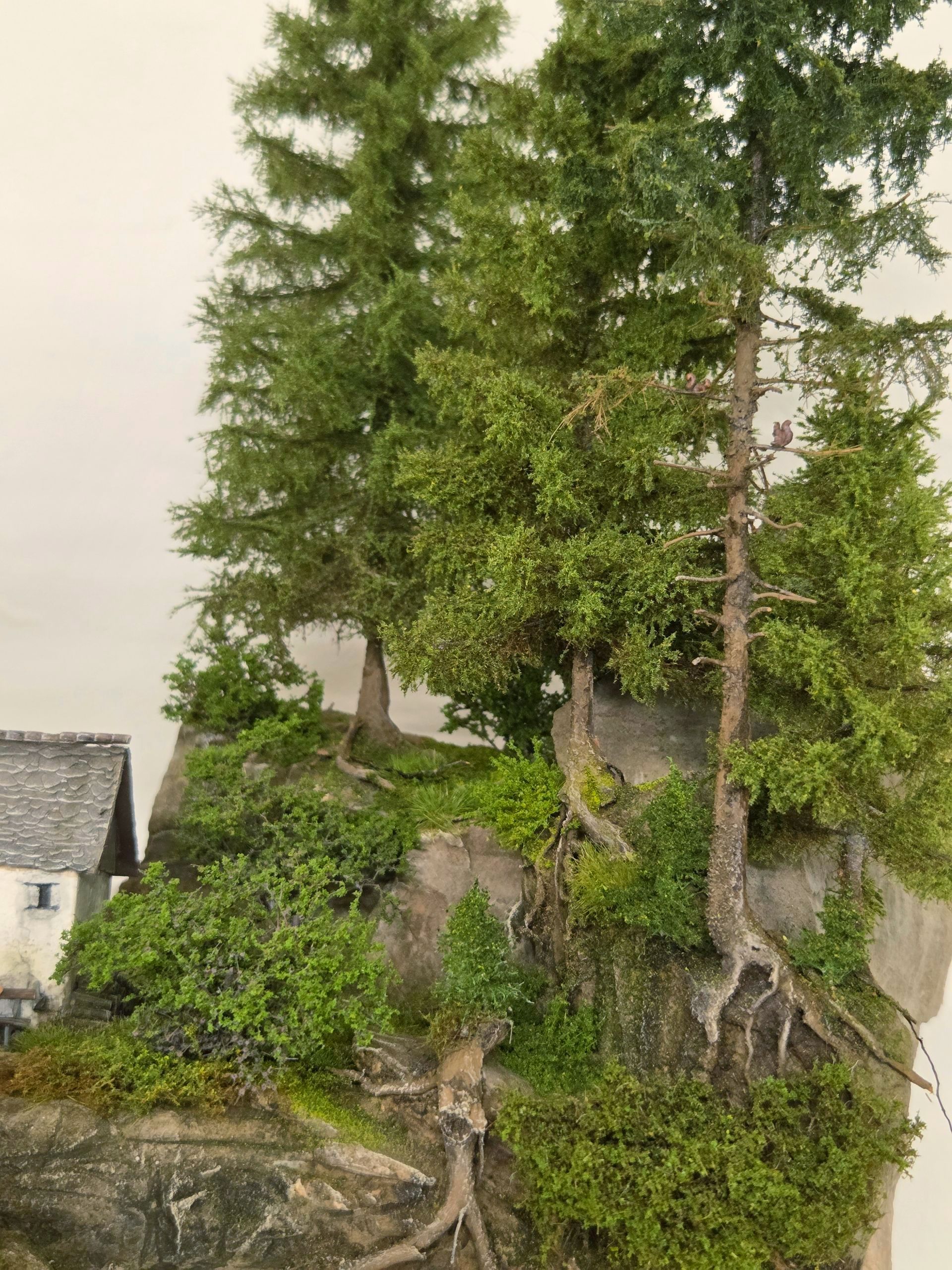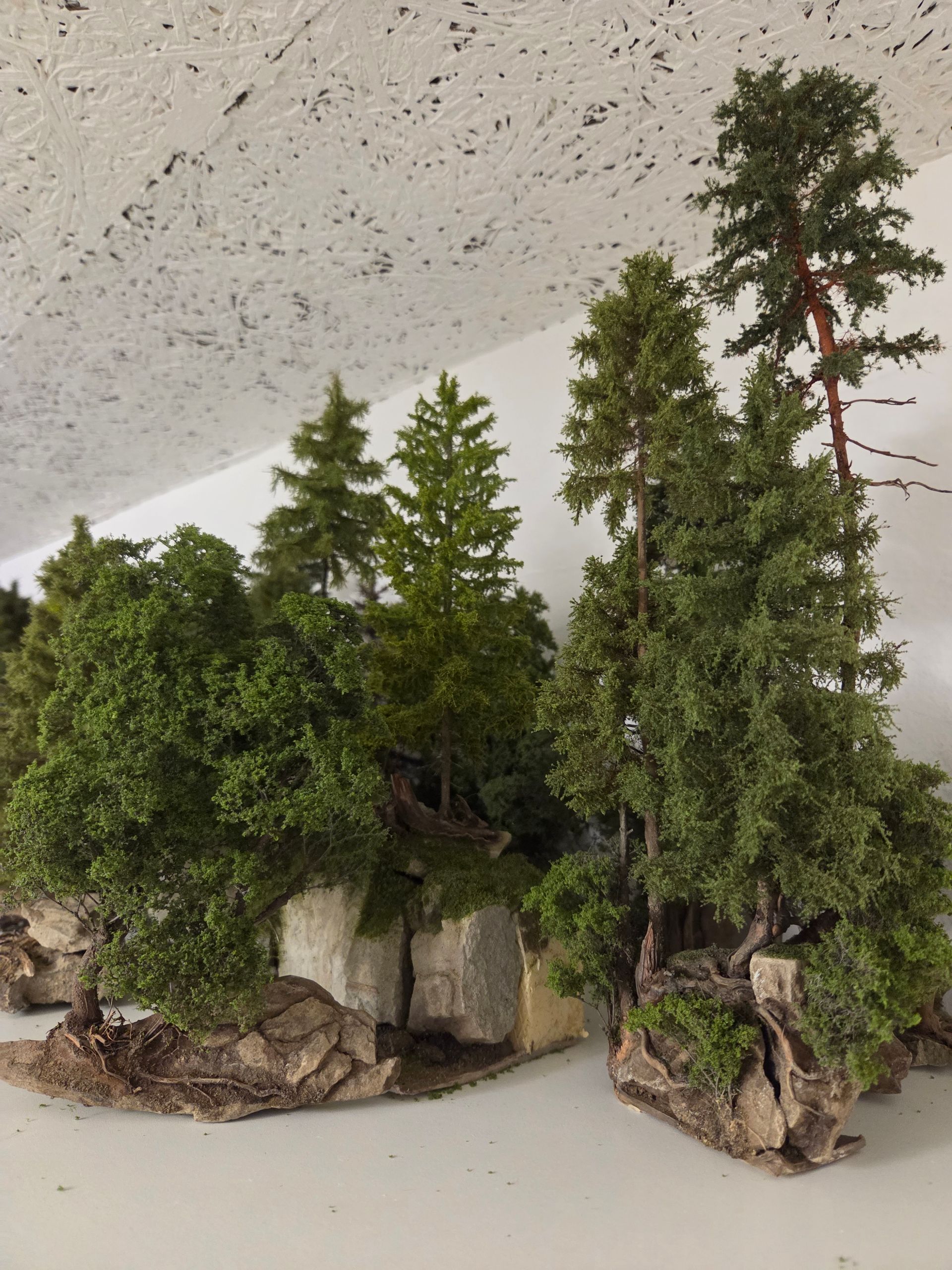 Die meisten Fichten, Tannen und Kiefern stammen von MBR. Super realistisch und Top Qualität zu fairem Preis. Habe diese auf gesammelte Wurzeln aufgesteckt und den Stamm etwas verdickt oder den original MBR-Stamm mit einem Messingröhrchen einige cm verlängert, um verschiedene Höhen der Bäume darzustellen.
