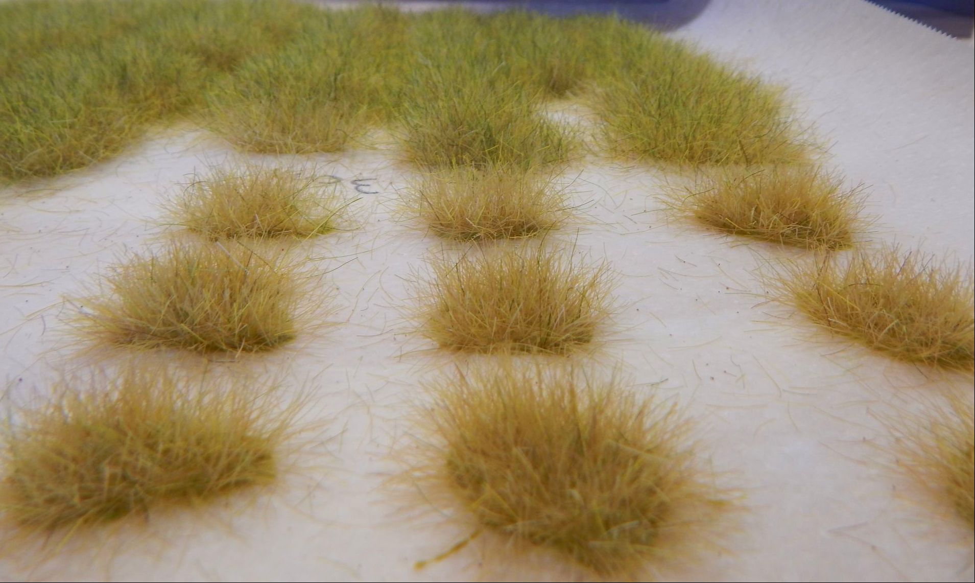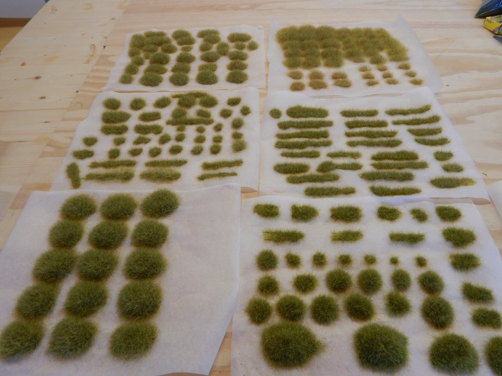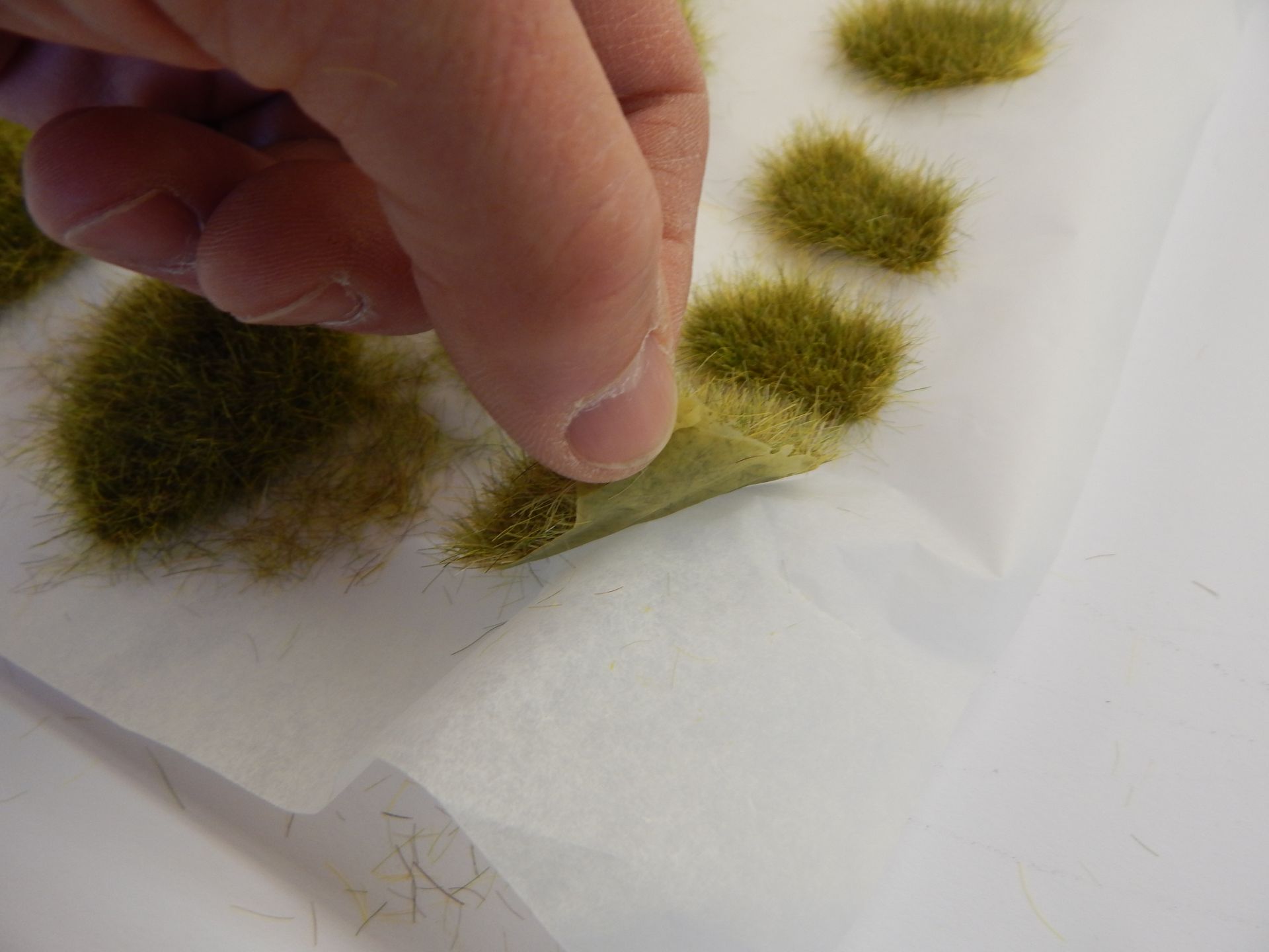 Hierfür streiche ich Weißleim auf Backfolie. Nun werden mit dem Flockgerät, die Grasfasern aufgesprüht. Nach der Trocknung können die Grasbüschel einfach von der Backfolie abgezogen werden. Grössere Grasbüschel werden mit Beflockunsmaterial bestreut, womit sich kleinere Büsche darstellen lassen.