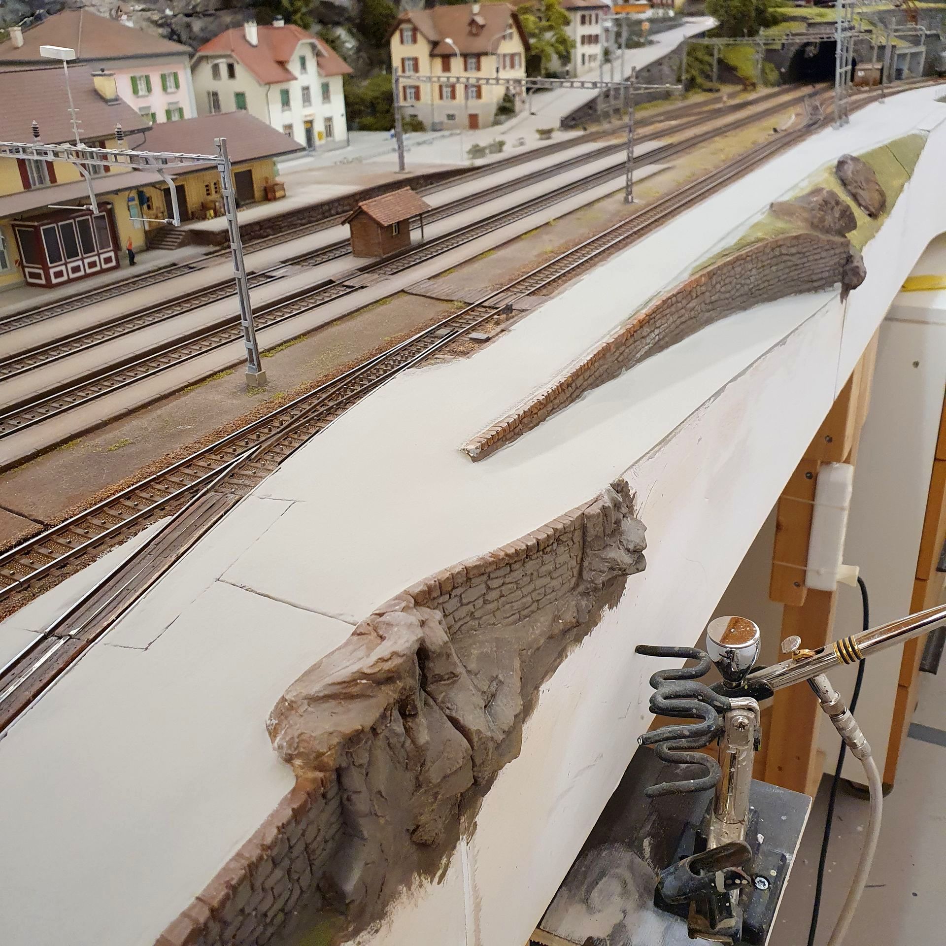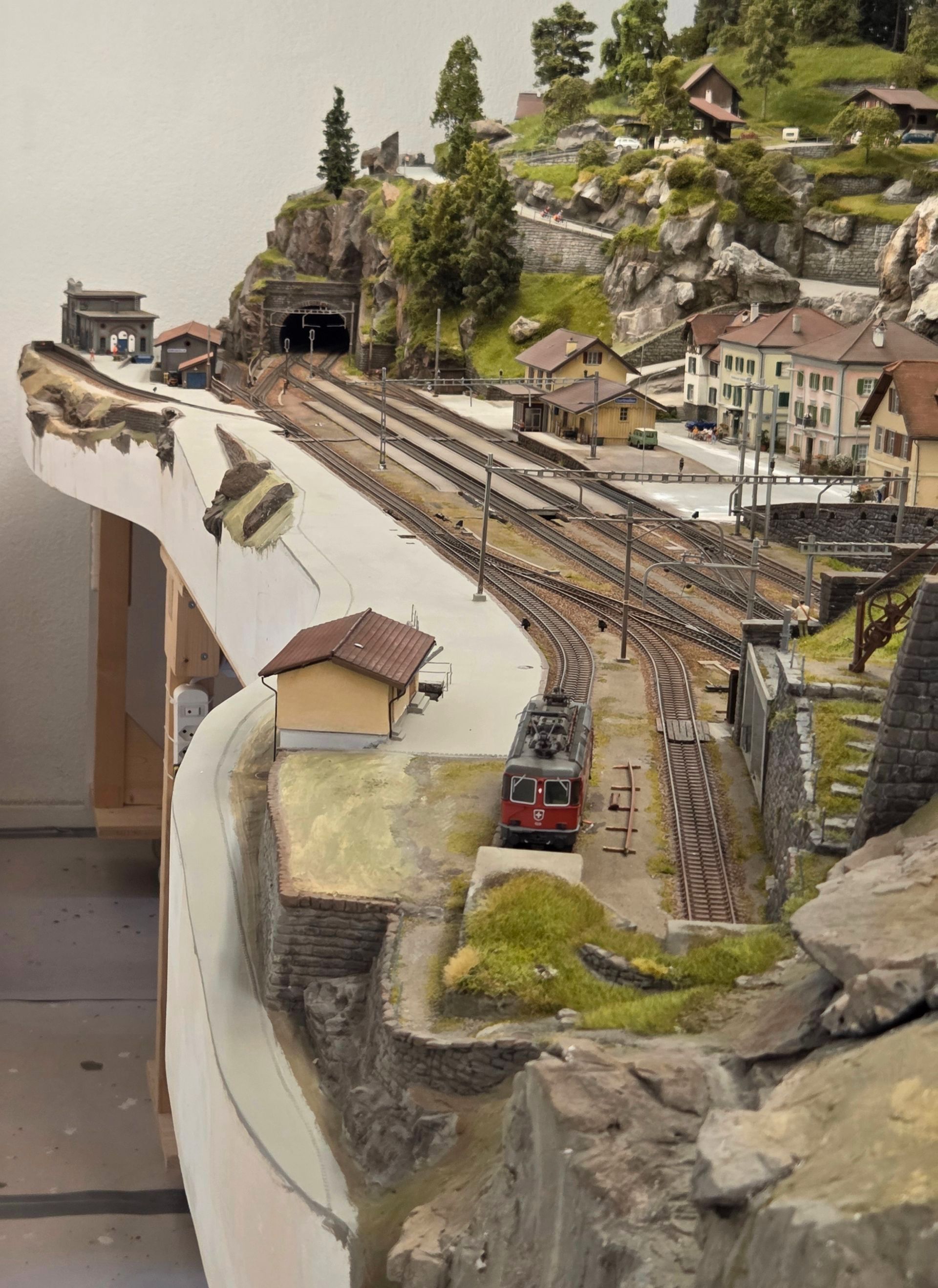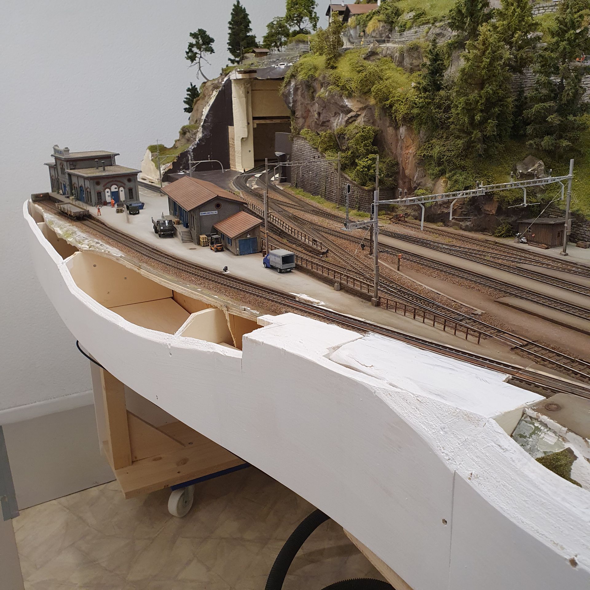 Ältere Anlagenmodule wurden nun fest miteinander verschraubt zu drei neuen, grösseren Modulen, auf denen auf der einen Seite der ganze Bahnhof von Gurtnellen inklusive der mittleren Entschigtal-Galerie mit Abstellgleisen von Wassen zu sehen ist. Die alten Übergänge habe ich verspachtelt und teilweise mit Felspartien kaschiert.