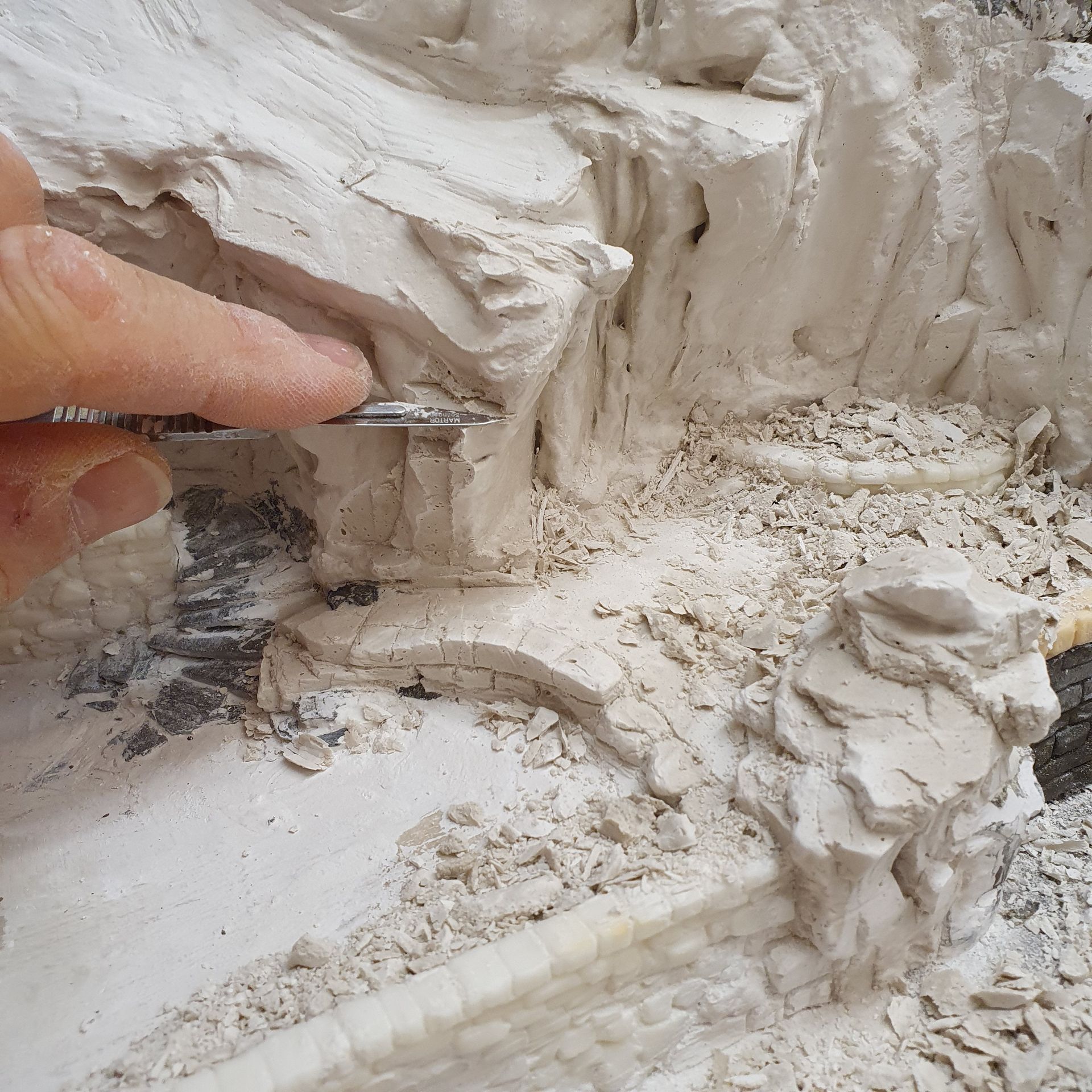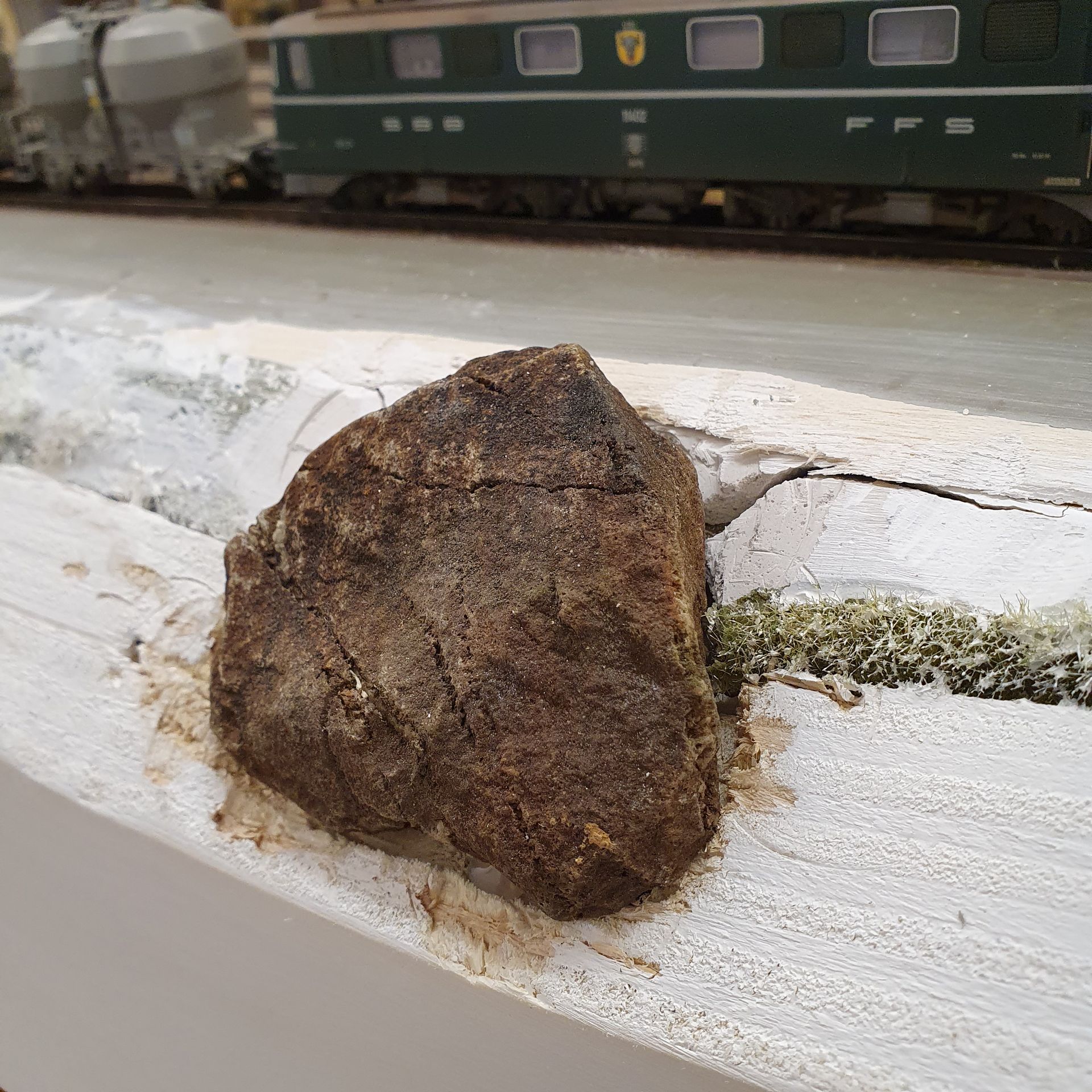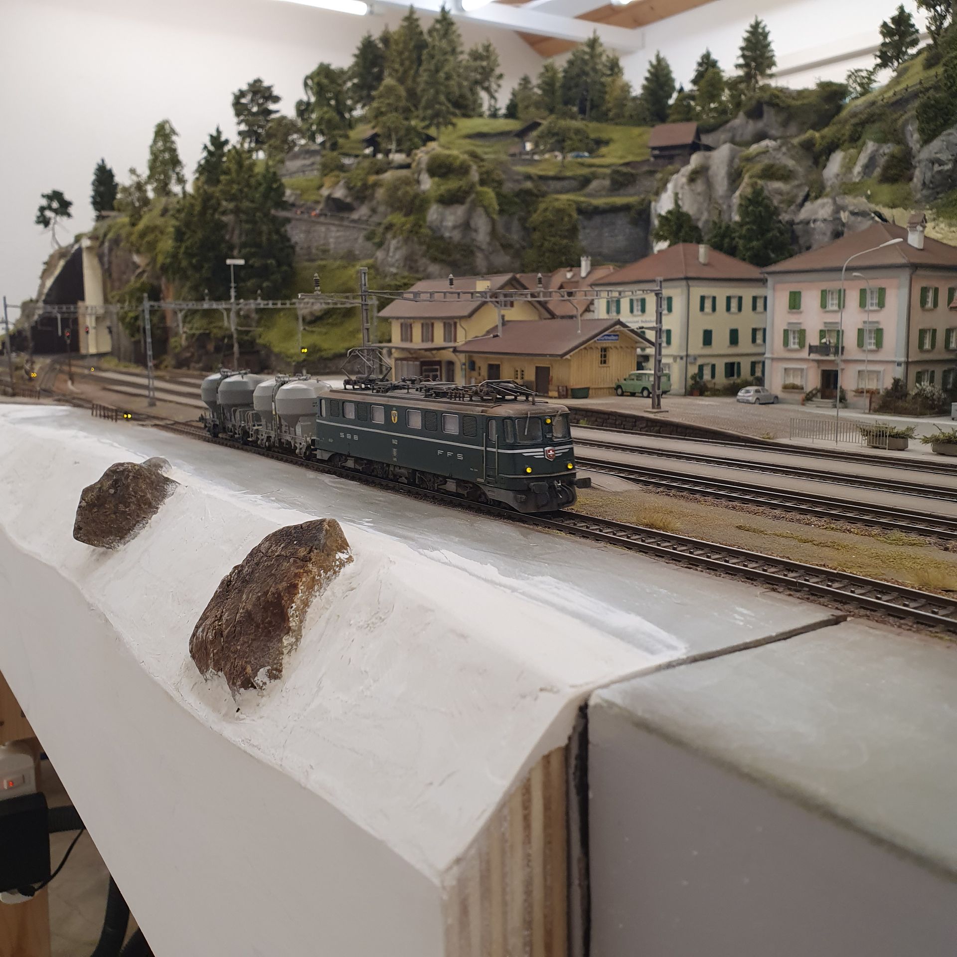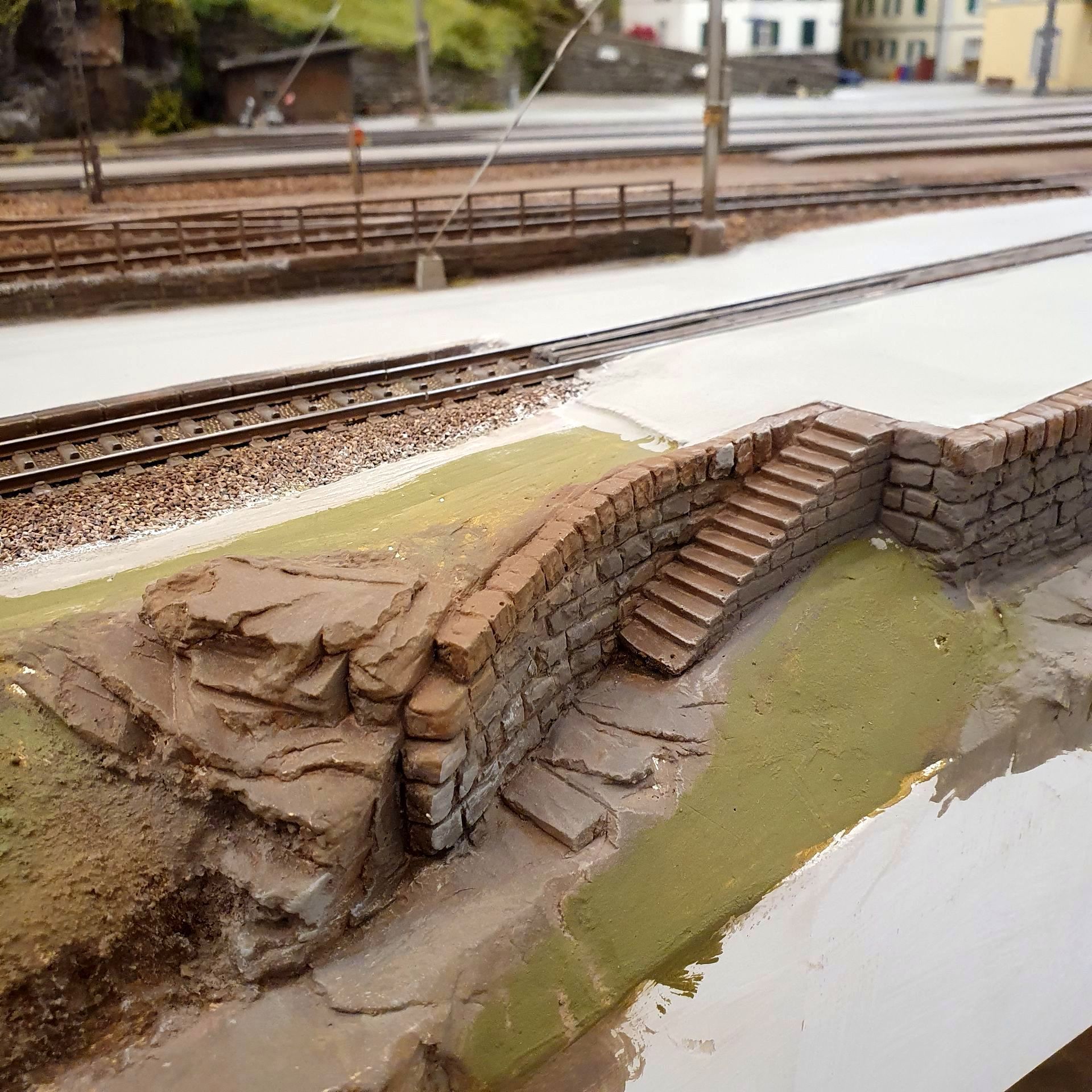 Den vorderen Bereich des Areals vom Bahnhof Gurtnellen, habe ich wellenförmig, auf der ganzen Länge der drei Module etwas verbreitert. Im mittleren Teil habe ich echte Schottersteine von den Abstellgleisen beim Bahnhof Wassen eingepflanzt, um den Grössenvergleich zum HO-Schotter auf der Anlage zu zeigen.