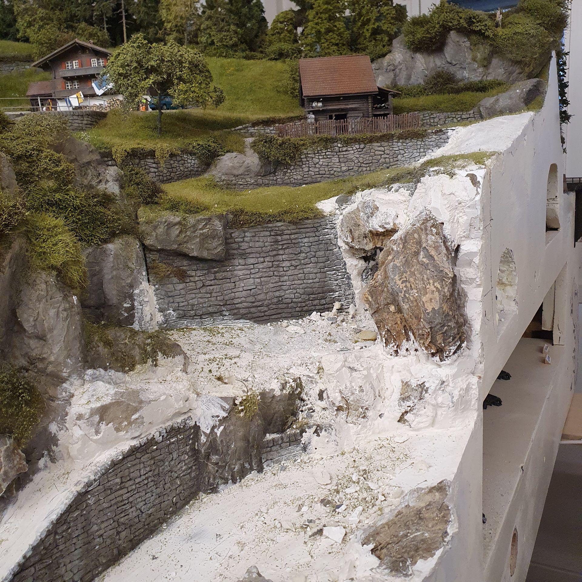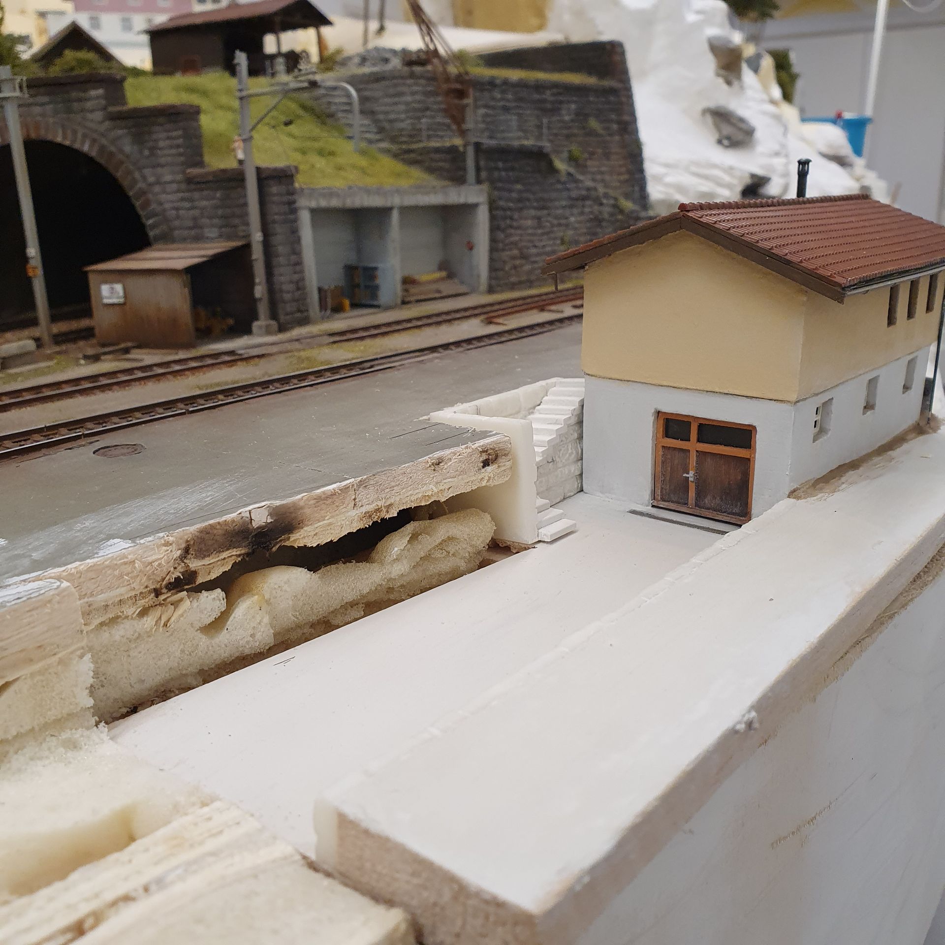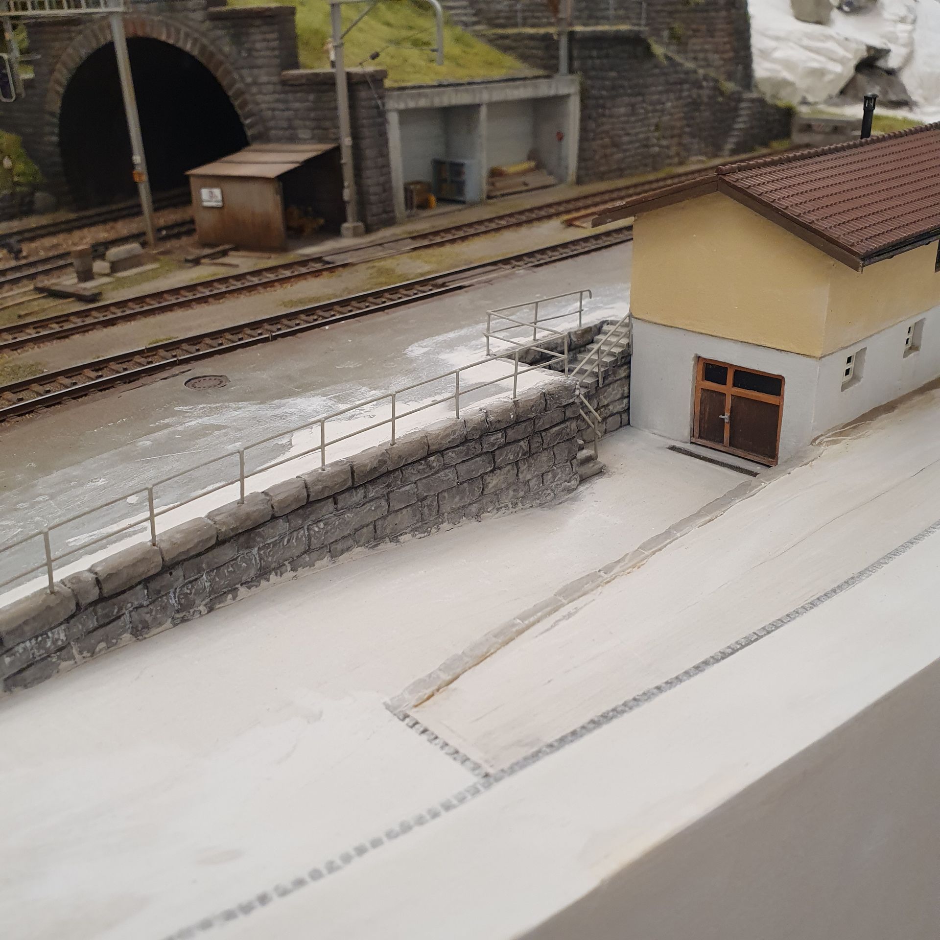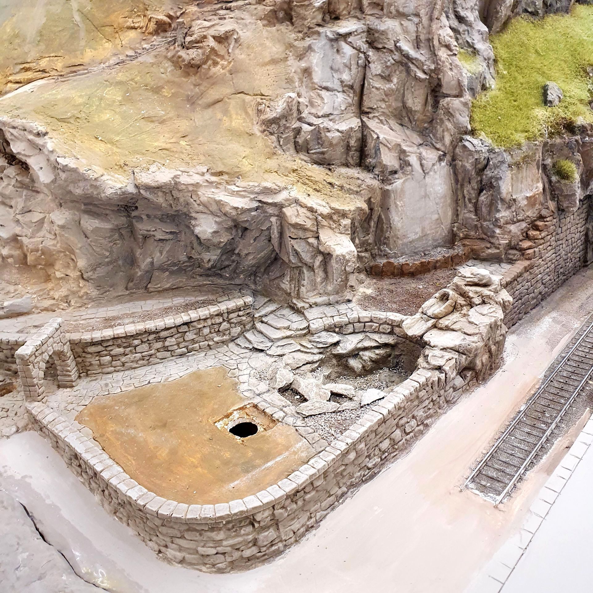 Hinter dem Schmelzmetall-Gebäude entstand einen kleiner Garten mit Weiher und mit den vorgefertigten Wanderwegteilen, habe ich einen steilen Weg zu den höher liegenden Häusern angelegt. Weiter kreierte ich auf der Stirnseite des ersten Moduls, eine felsige Grotte, in dessen Einblick, sich die Tunnel Arbeiten und die verbeirauschenden Züge offenbaren. Alles noch ohne finaler Detailierung und Begrünung.