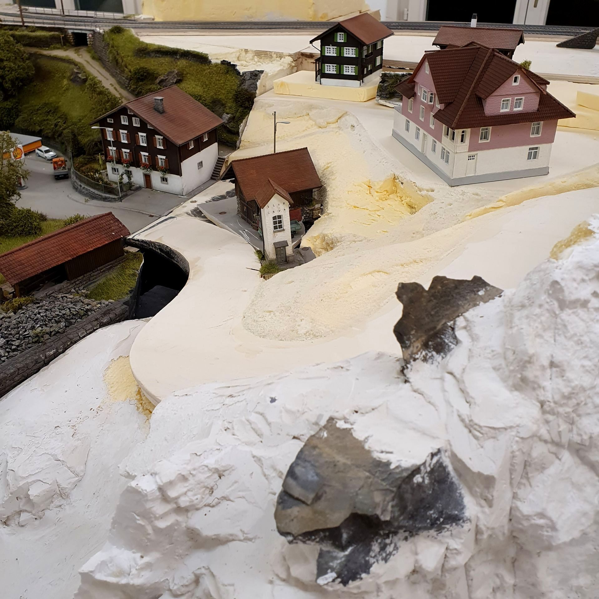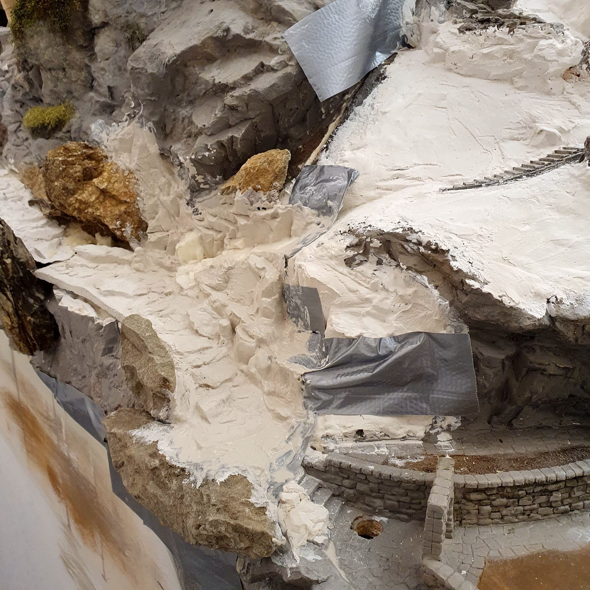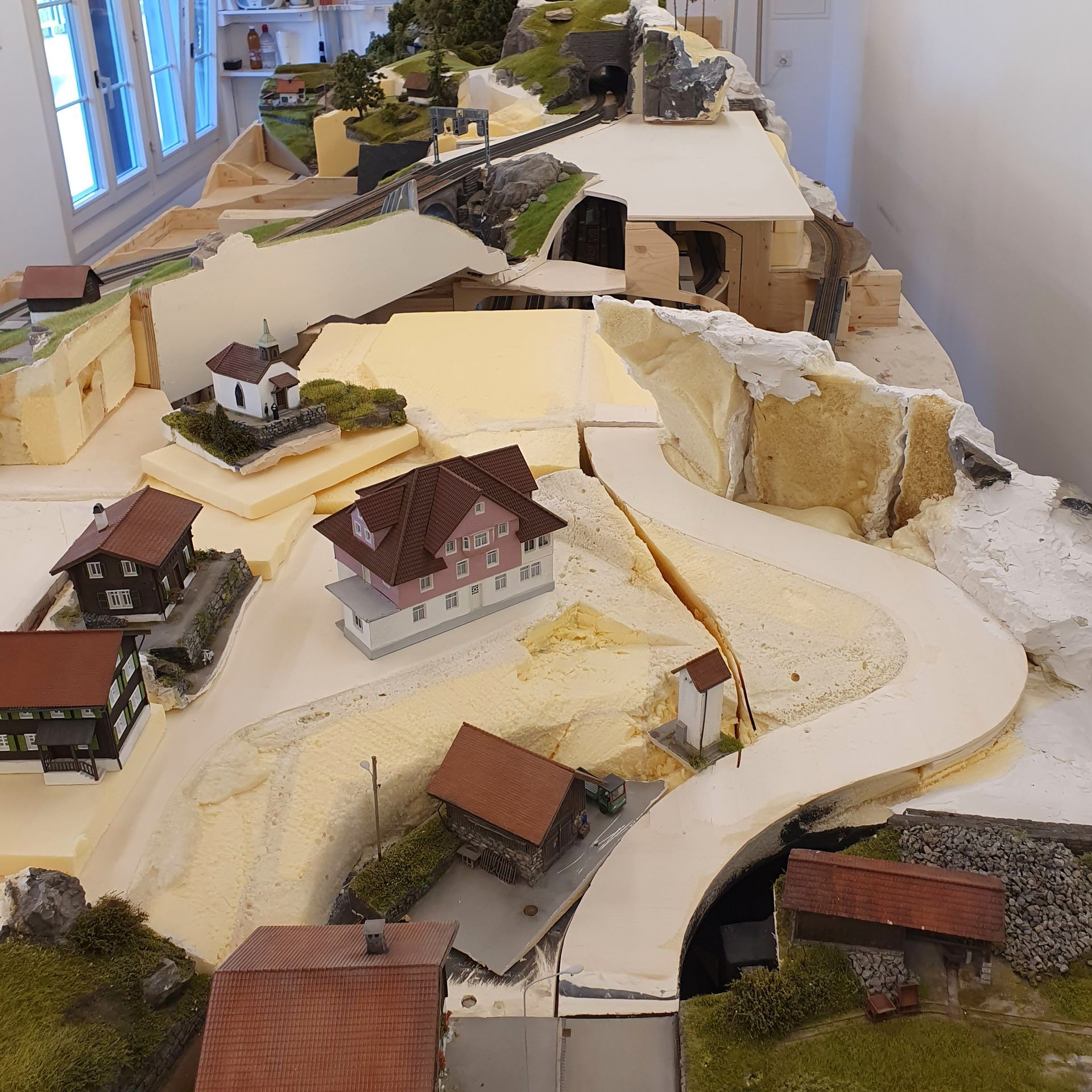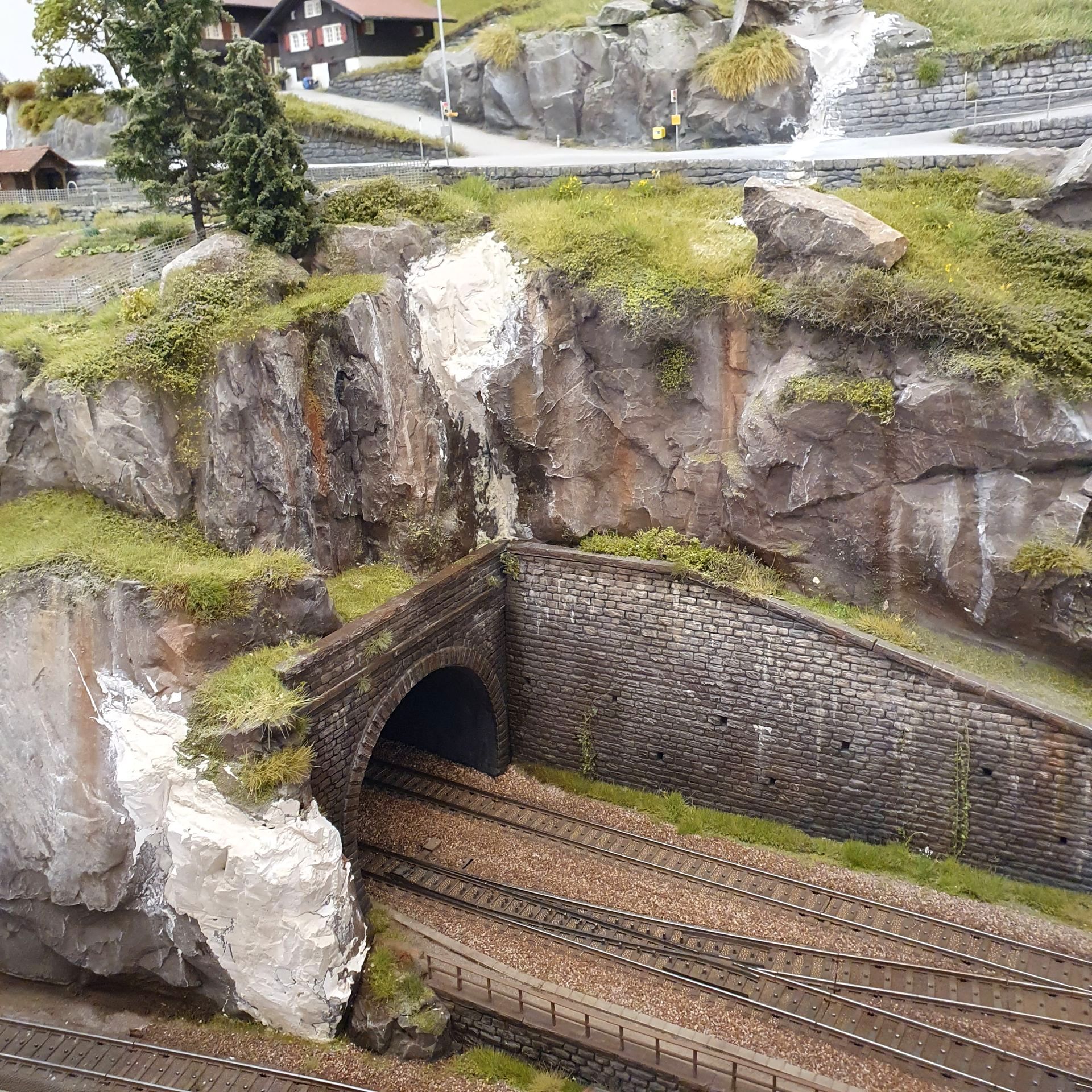 Hinter dem Schmelzmetall-Gebäude entstand einen kleiner Garten mit Weiher und mit den vorgefertigten Wanderwegteilen, habe ich einen steilen Weg zu den höher liegenden Häusern angelegt. Weiter kreierte ich auf der Stirnseite des ersten Moduls, eine felsige Grotte, in dessen Einblick, sich die Tunnel Arbeiten und die verbeirauschenden Züge offenbaren. Alles noch ohne finaler Detailierung und Begrünung.