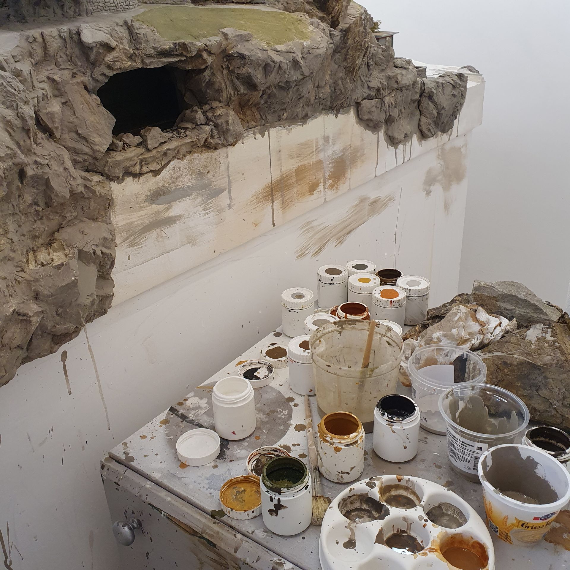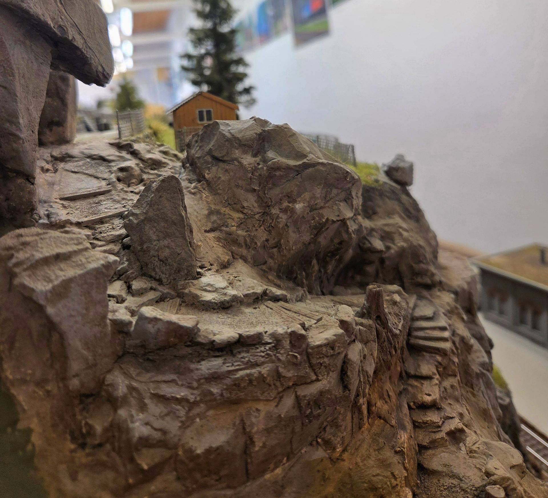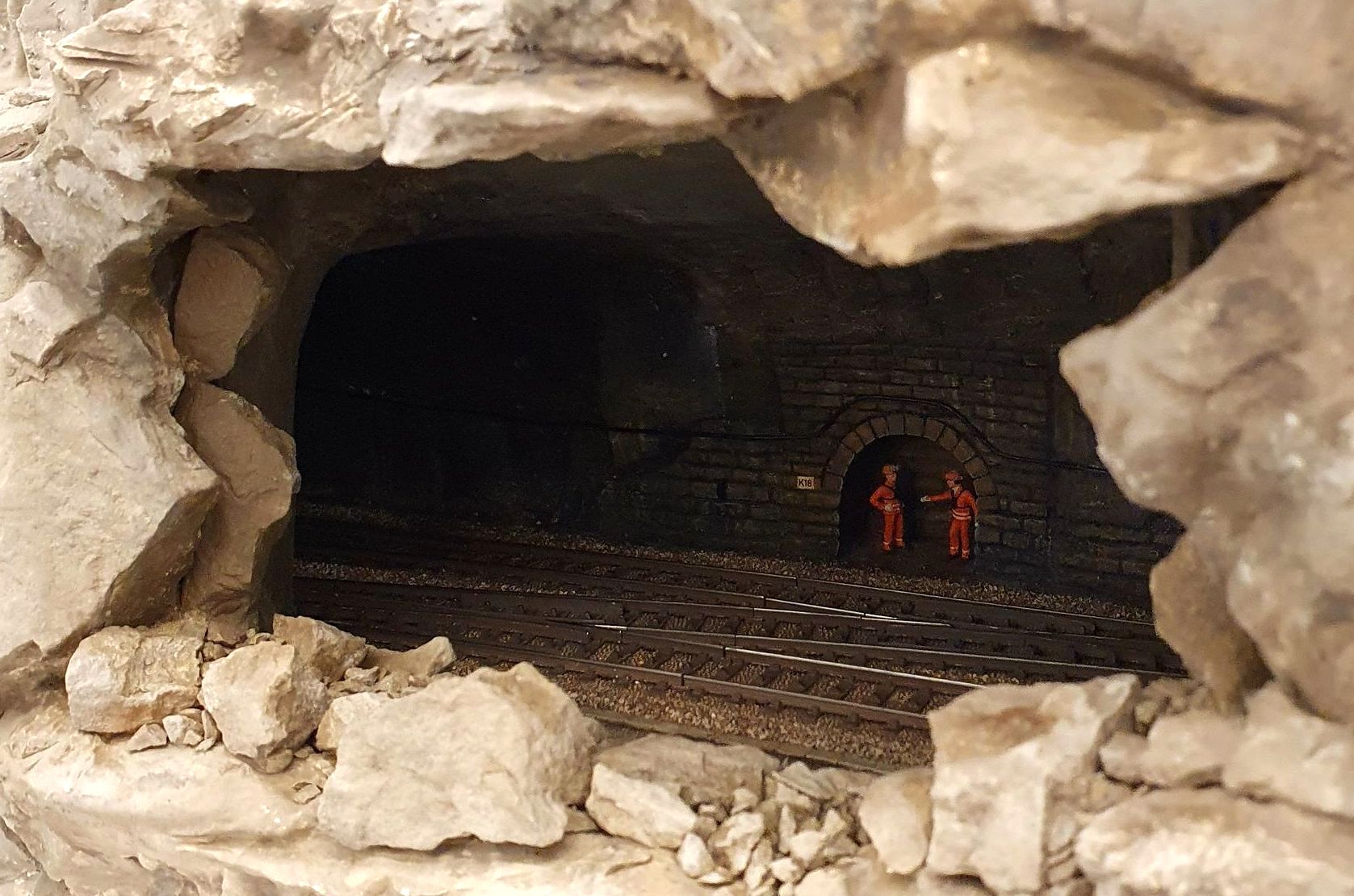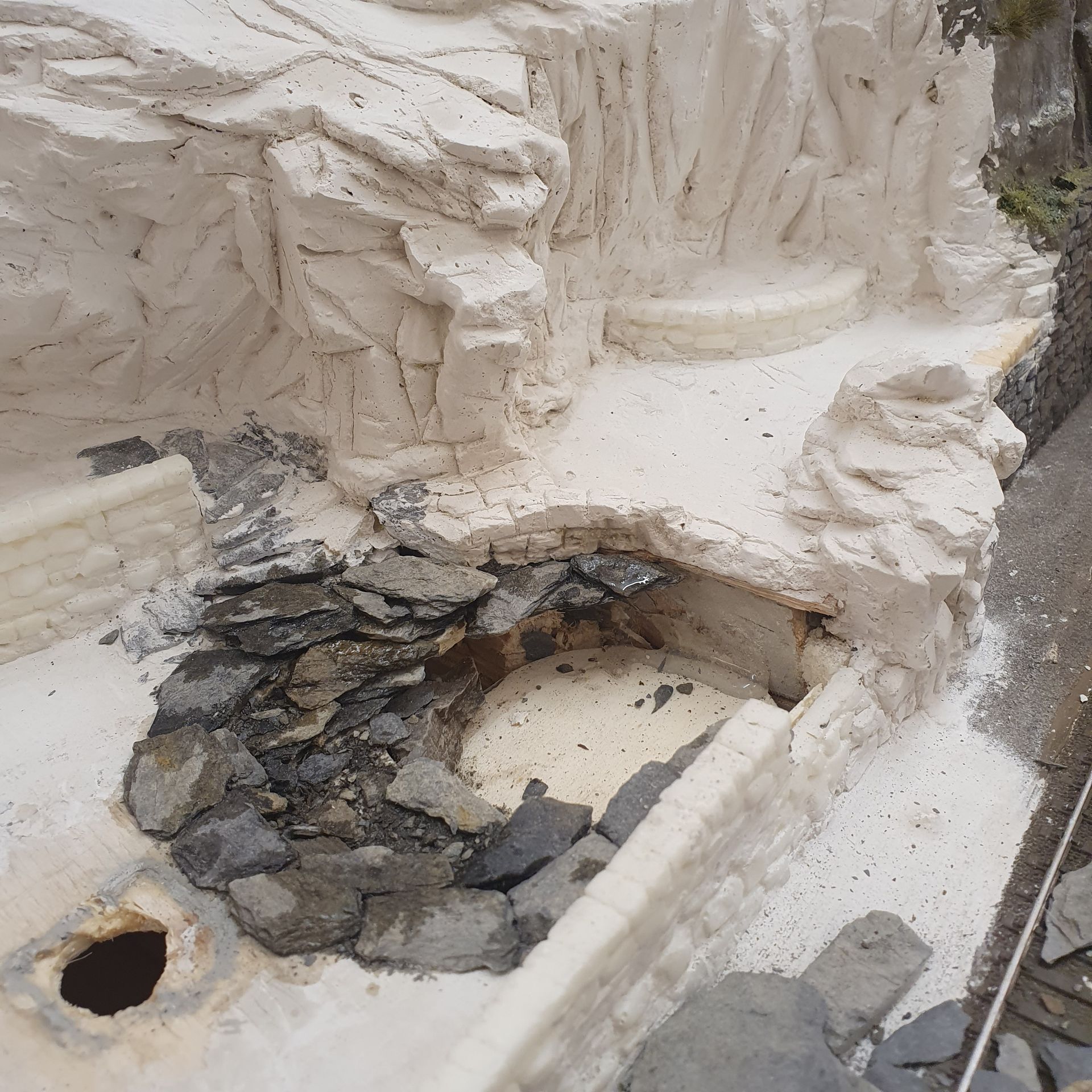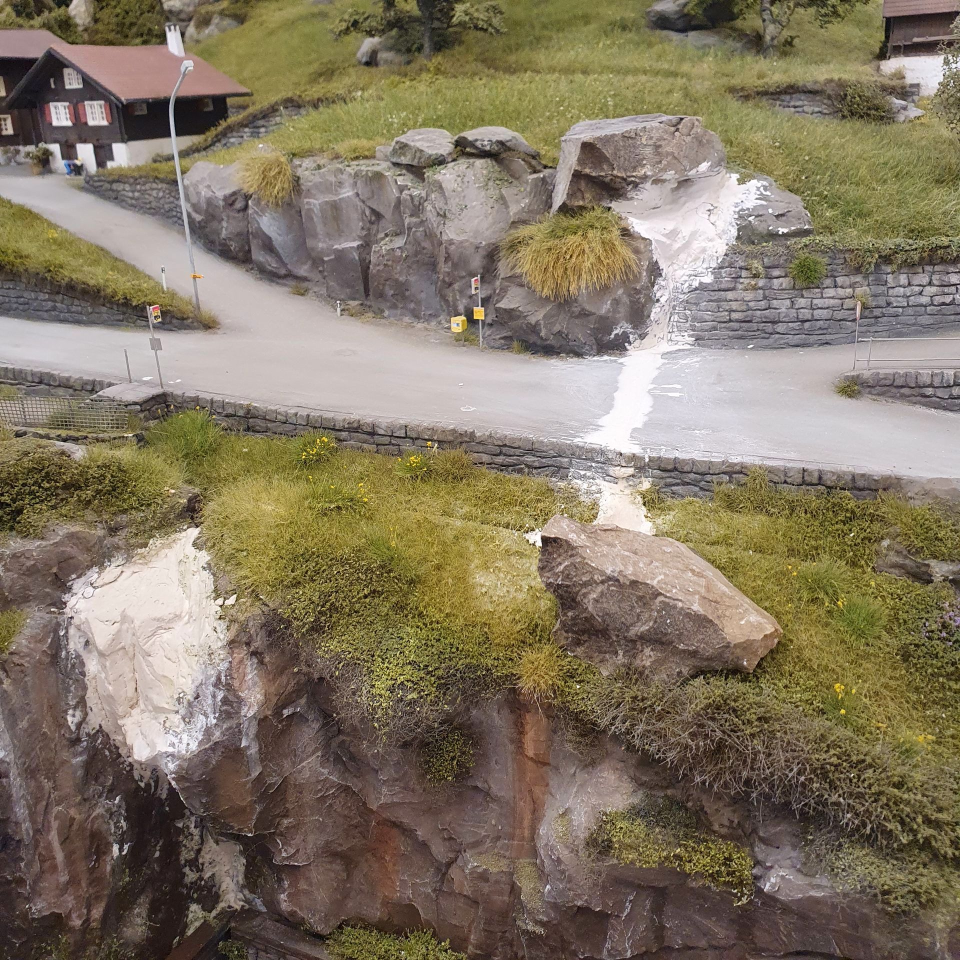 Hinter dem Schmelzmetall-Gebäude entstand einen kleiner Garten mit Weiher und mit den vorgefertigten Wanderwegteilen, habe ich einen steilen Weg zu den höher liegenden Häusern angelegt. Weiter kreierte ich auf der Stirnseite des ersten Moduls, eine felsige Grotte, in dessen Einblick, sich die Tunnel Arbeiten und die verbeirauschenden Züge offenbaren. Alles noch ohne finaler Detailierung und Begrünung.