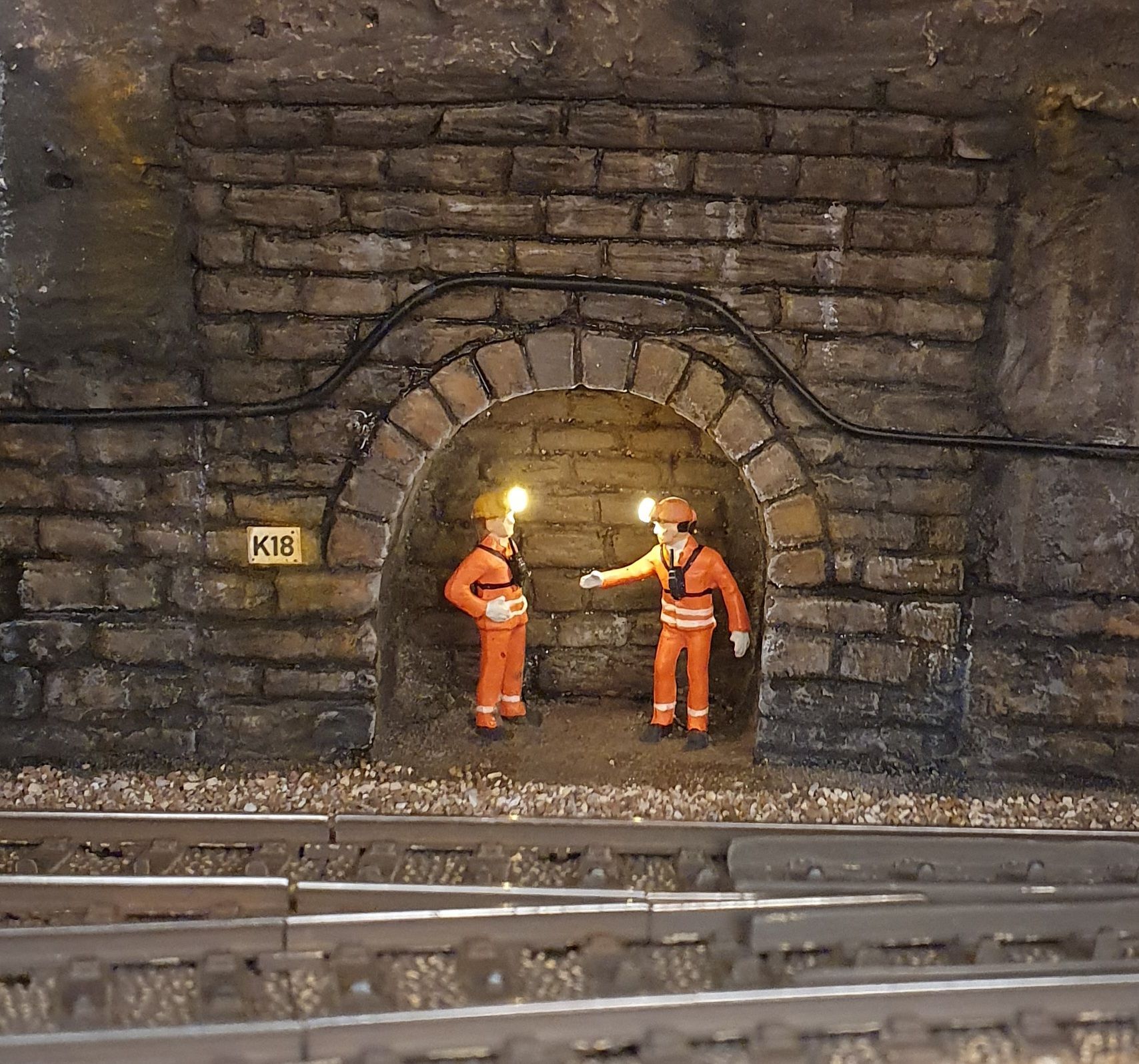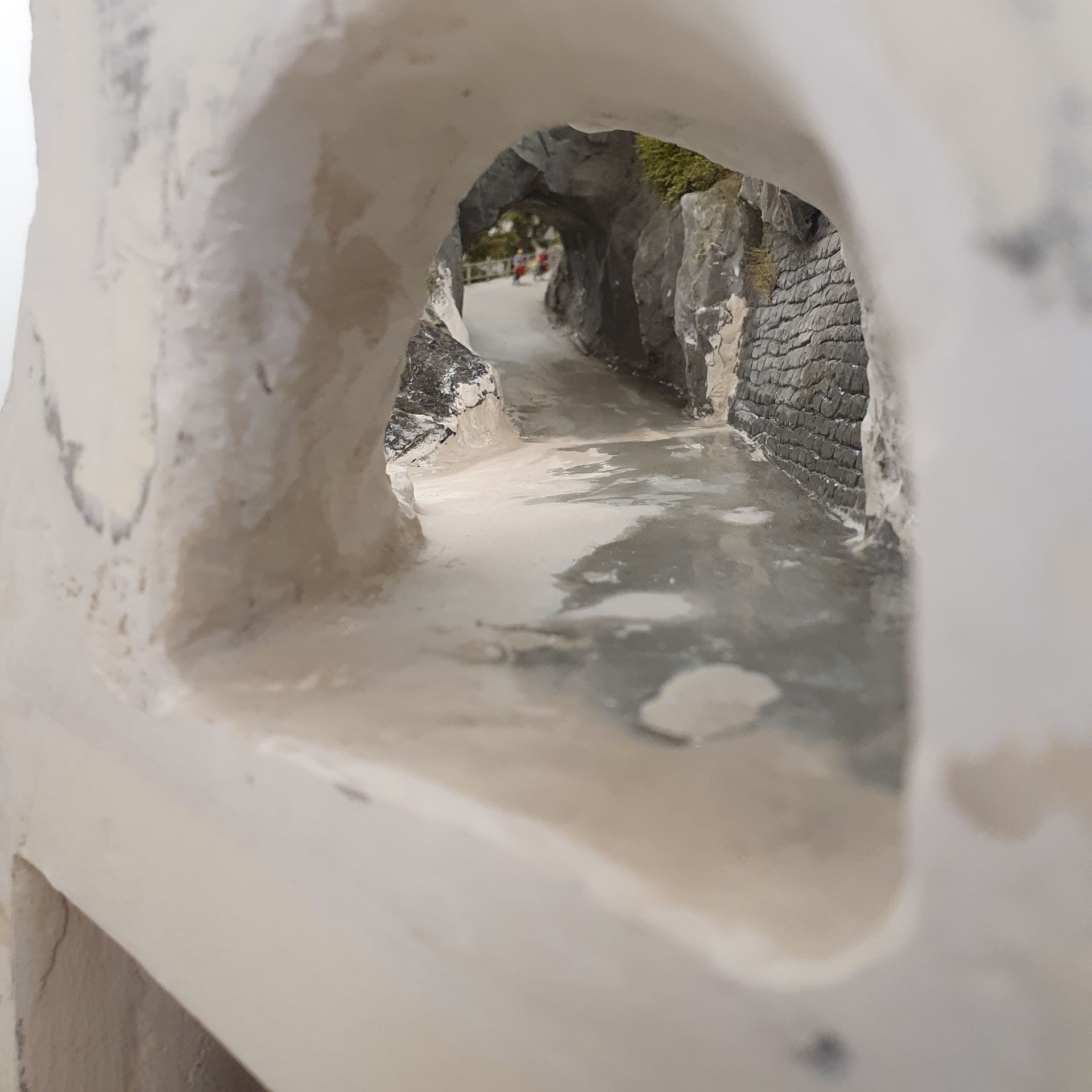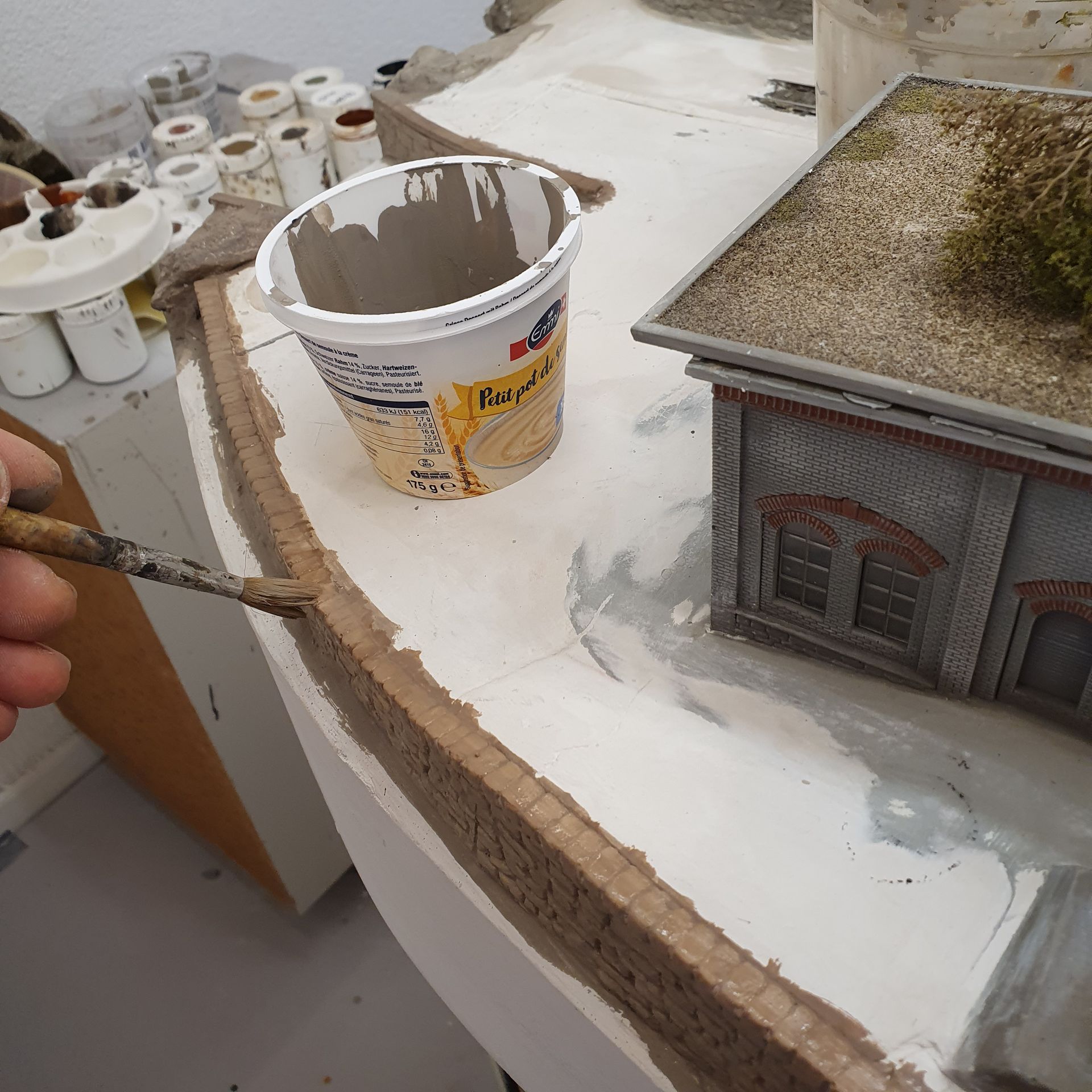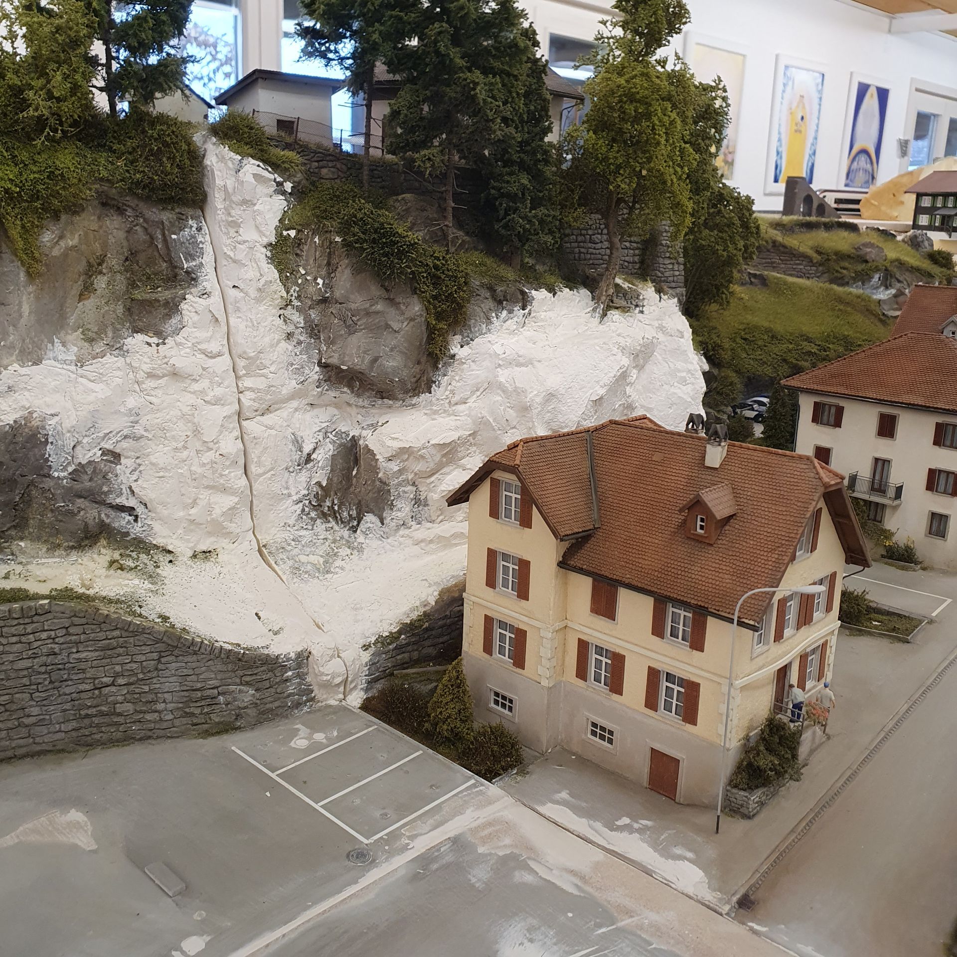 Hinter dem Schmelzmetall-Gebäude entstand einen kleiner Garten mit Weiher und mit den vorgefertigten Wanderwegteilen, habe ich einen steilen Weg zu den höher liegenden Häusern angelegt. Weiter kreierte ich auf der Stirnseite des ersten Moduls, eine felsige Grotte, in dessen Einblick, sich die Tunnel Arbeiten und die verbeirauschenden Züge offenbaren. Alles noch ohne finaler Detailierung und Begrünung.