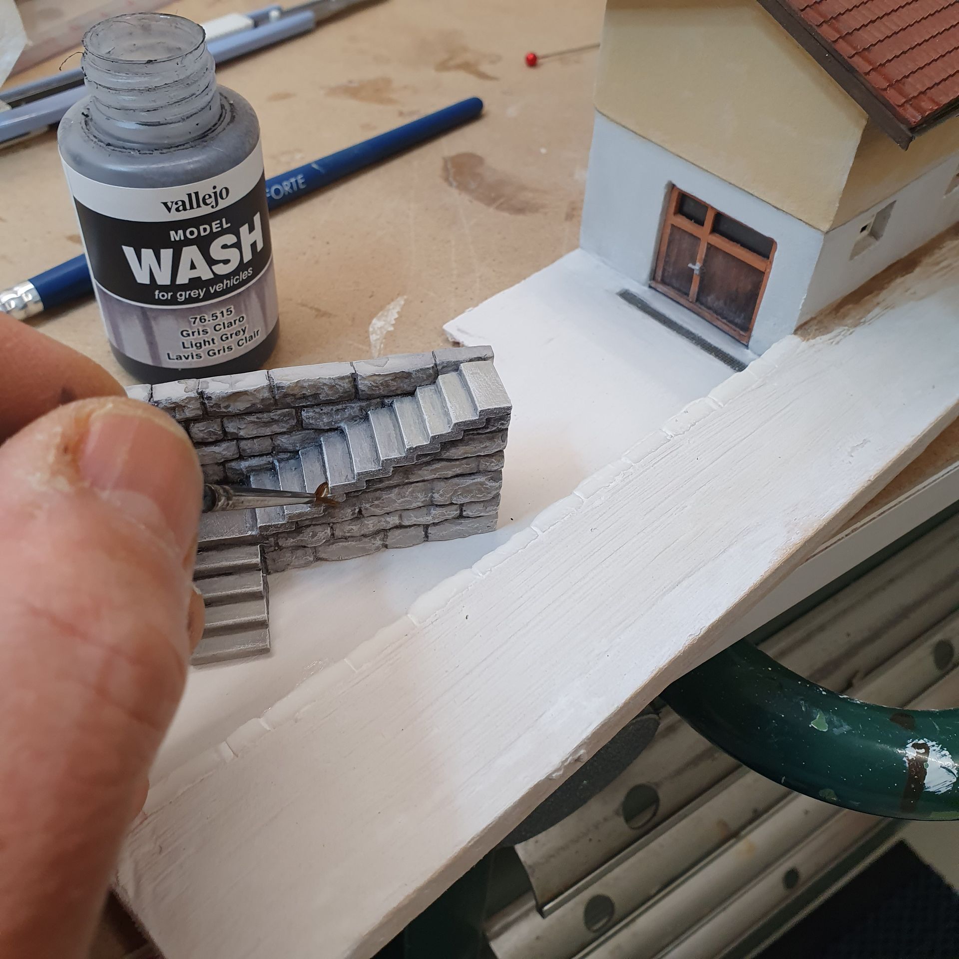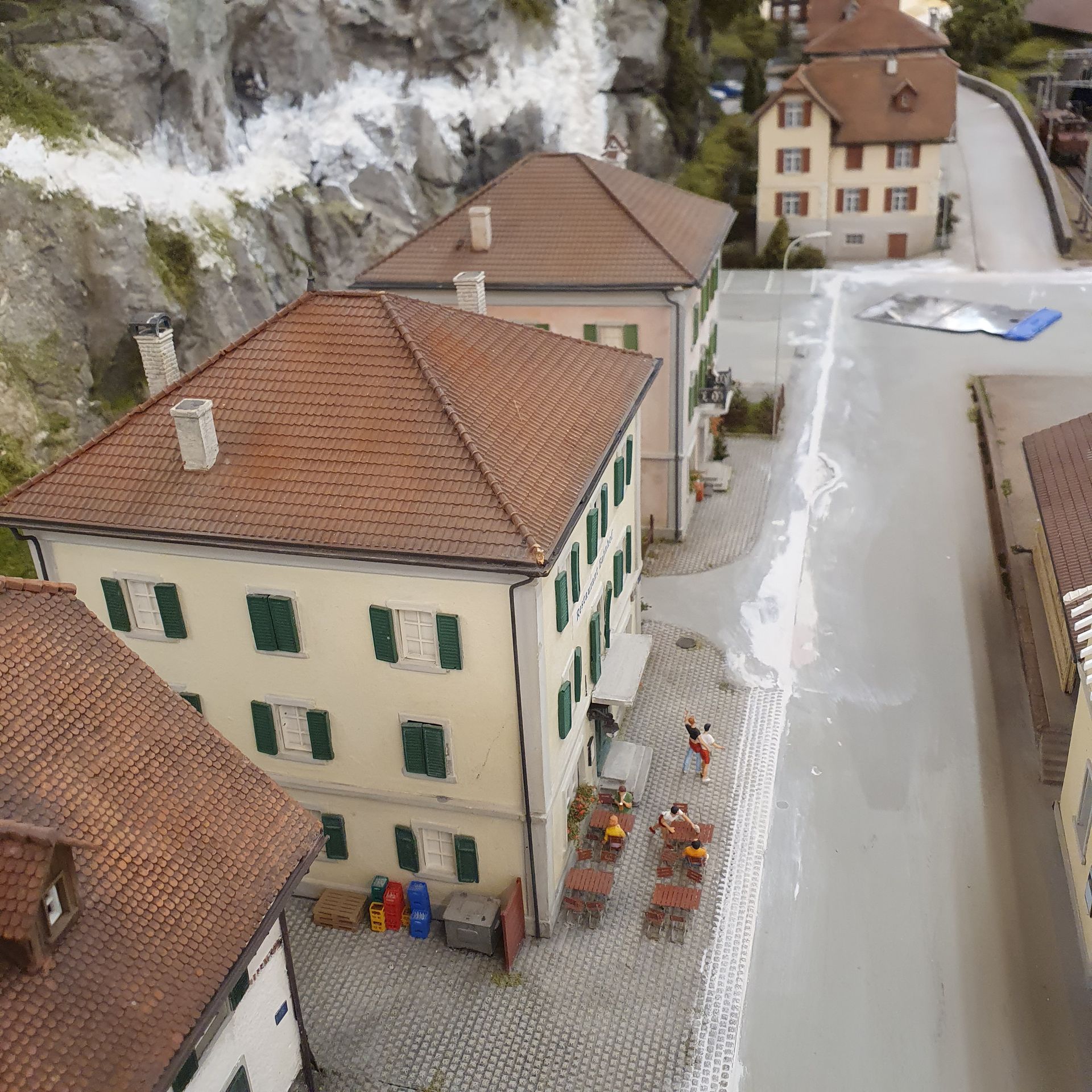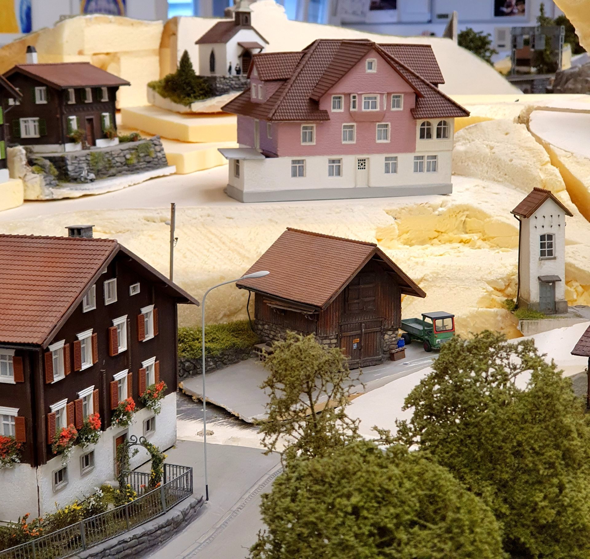 Das Dorf Gurtnellen wird etwas umgestaltet und um ein paar weitere Häuser ergänzt. Die Strasse führt weiter und wird oberhalb der Gumpischbachbrücke, ähnlich wie bei der Axensrasse, in einem Tunnel verschwinden. Dieser ganze Abschnitt erhält einen bewaldeten Hügel, womit der Blick auf die obere Paradestrecke über die Häggrigerbachbrücke verdeckt sein wird. Hier ein paar erste Studienbilder, wie die drei herausbarnehmenden Dorfteile, mal aussehen könnten. Bei grösseren Anlagen oder schwer zugänglichen Stellen, beispielsweise im mittleren Teil der Anlage, kann ich das finale Bauen von Anlagenteilen am Werktisch nur empfehlen, bevor diese ihren festen Platz auf der Anlage erhalten. Das Gestallten und Detaillieren ist auf diese Weise äusserst bequem. Werde das in einen anderen Update mit ein paar Bildern zeigen.