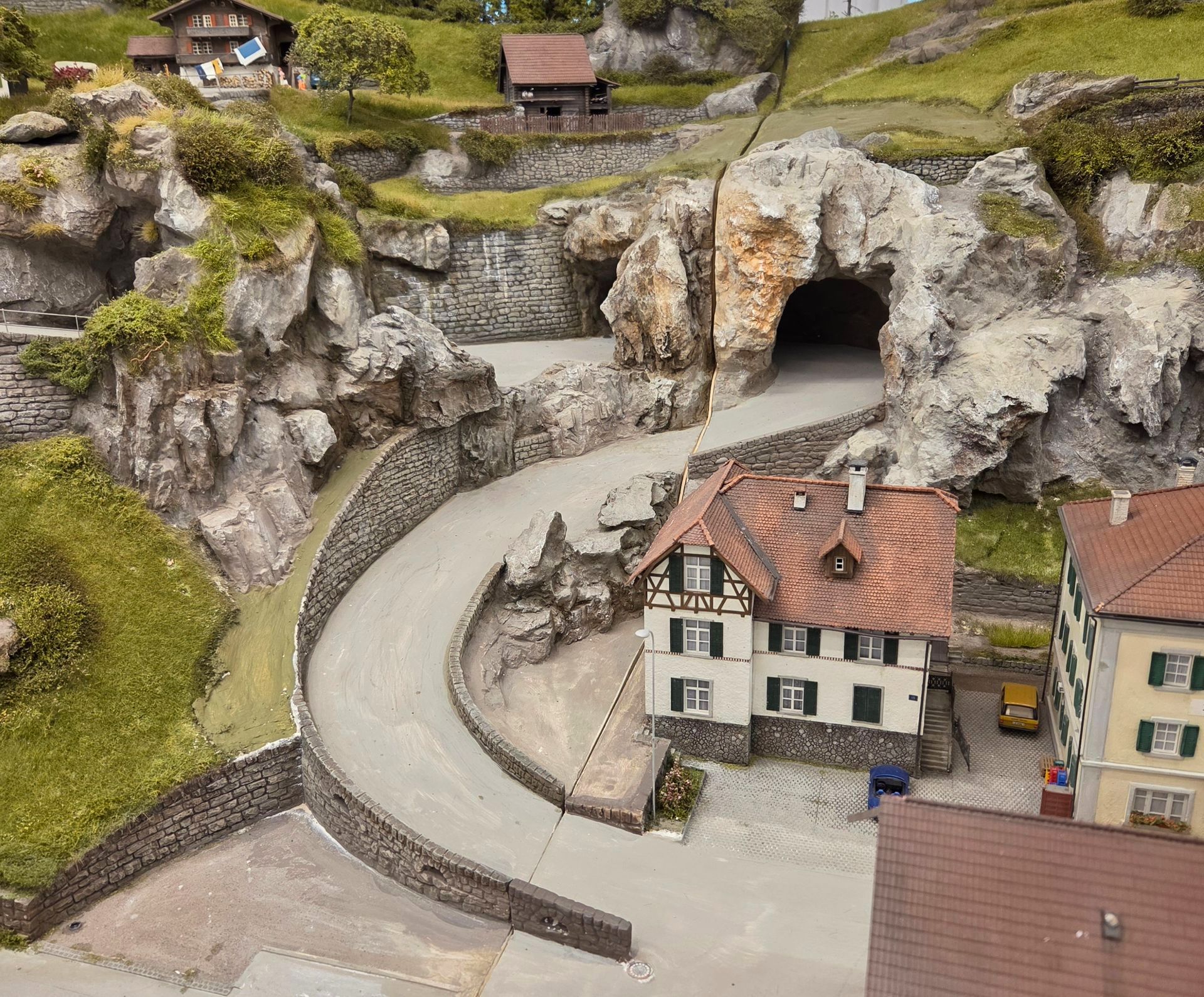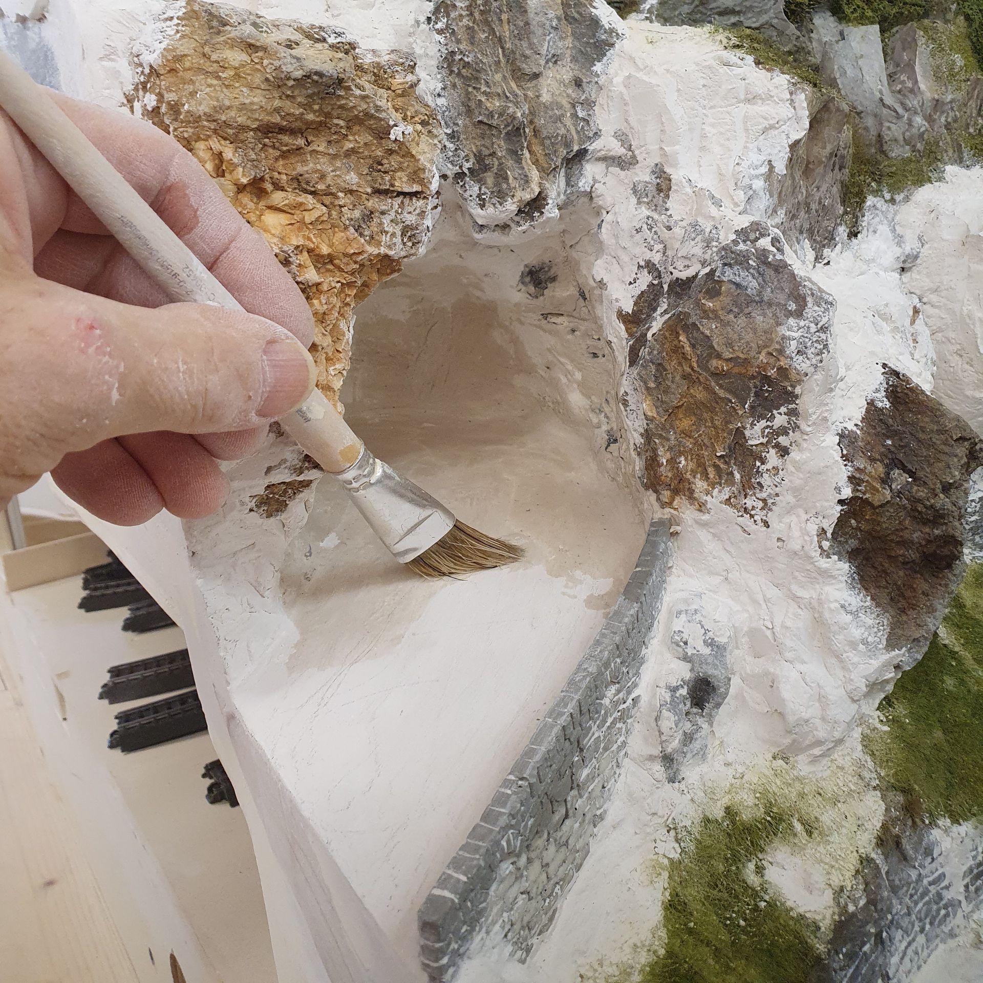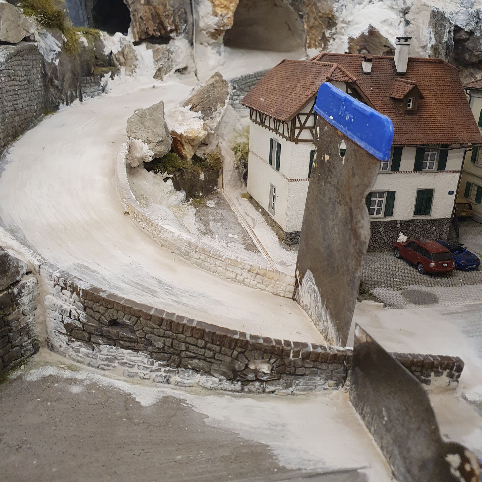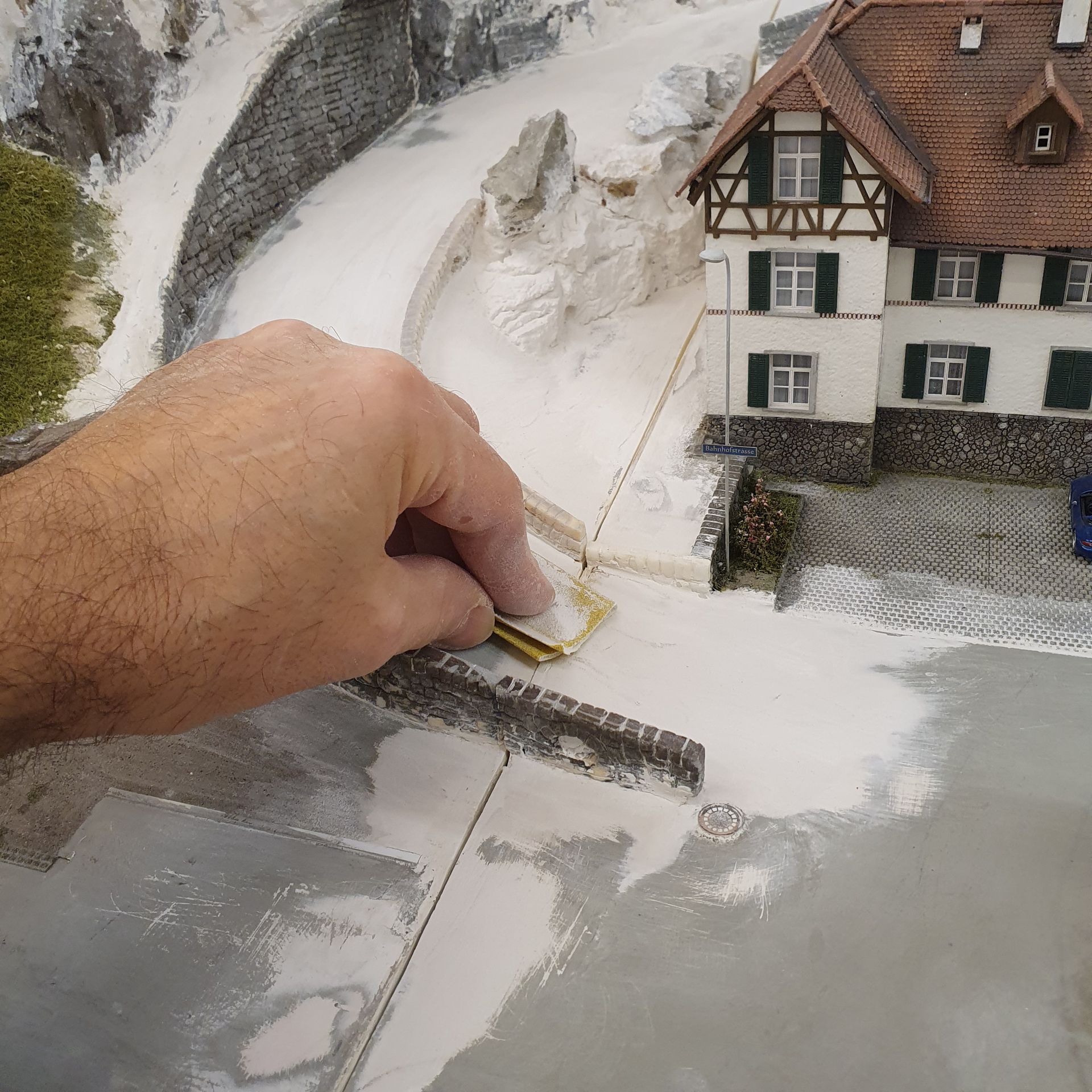 Der vorher herausnehmbare Strassentunnel wurde in zwei Hälften getrennt und auf je 2 Module verteilt und festgeschraubt. Der felsige Tunnel, den ich nun mit echte Steinen vom Urner Boden ergänzt habe und die kurvige Bergstrasse, wurden sorgfältig den zwei neuen, grösseren Modulen anpasst.
