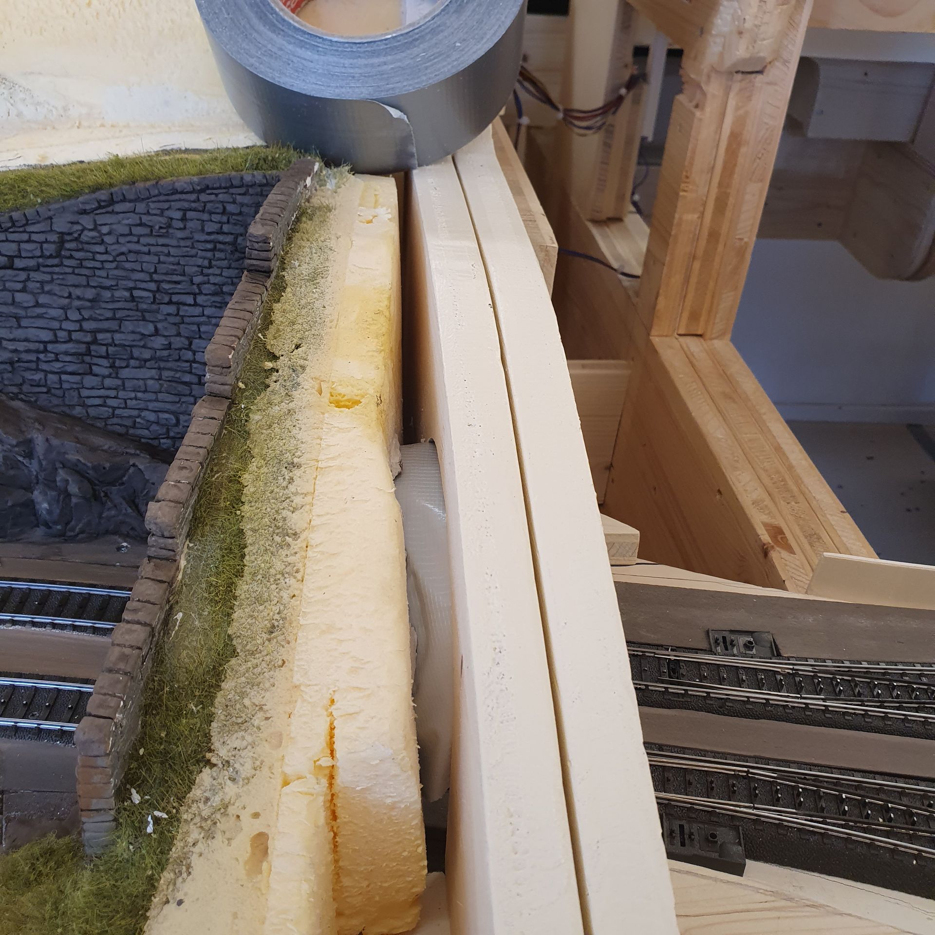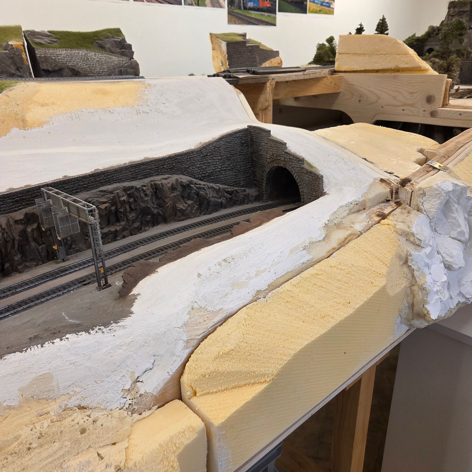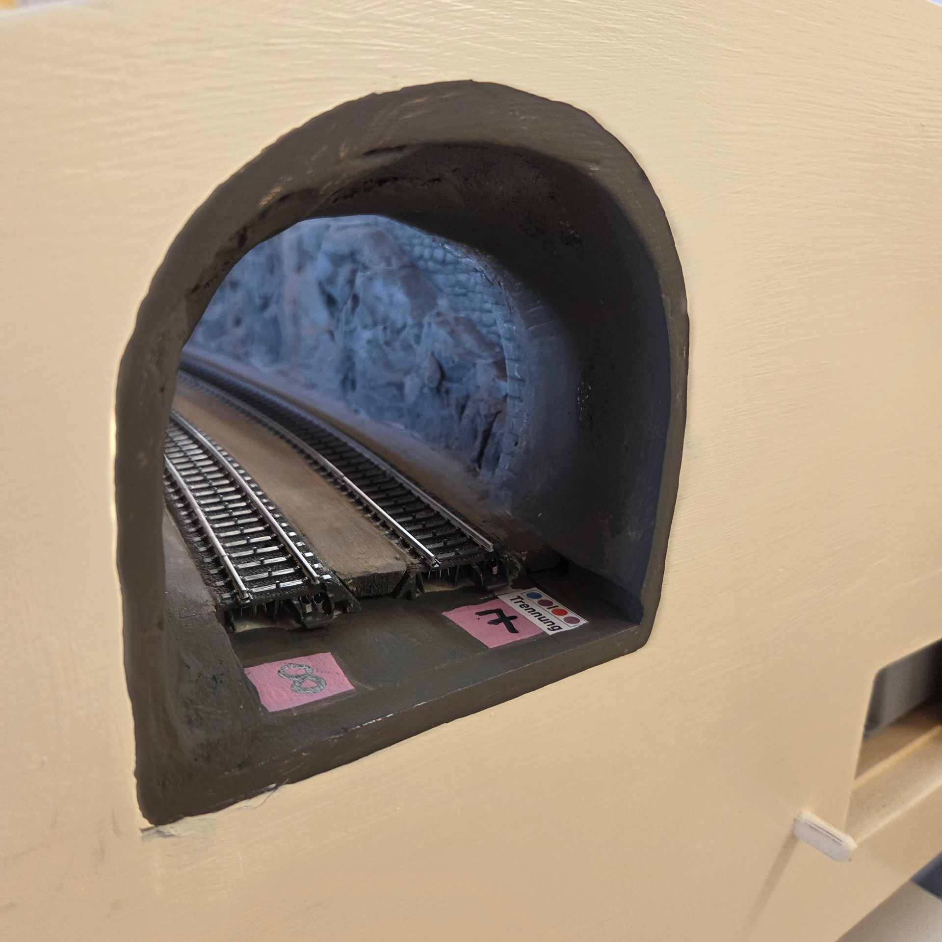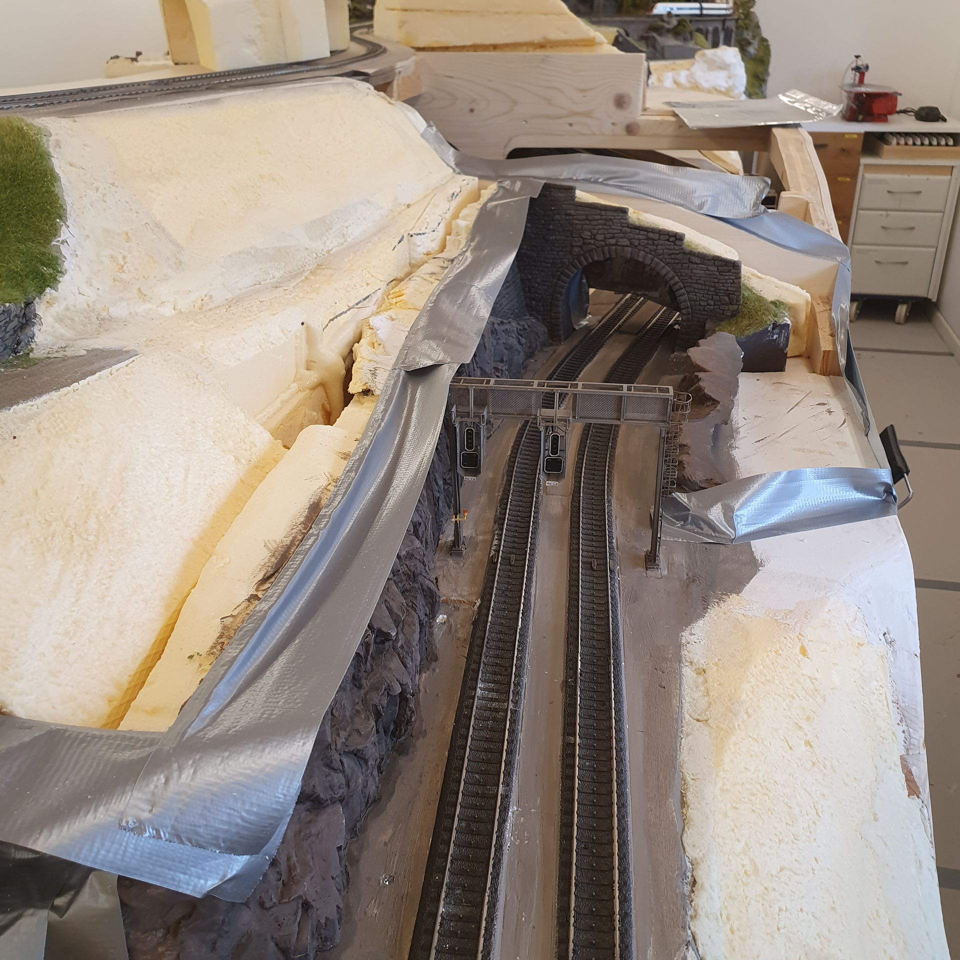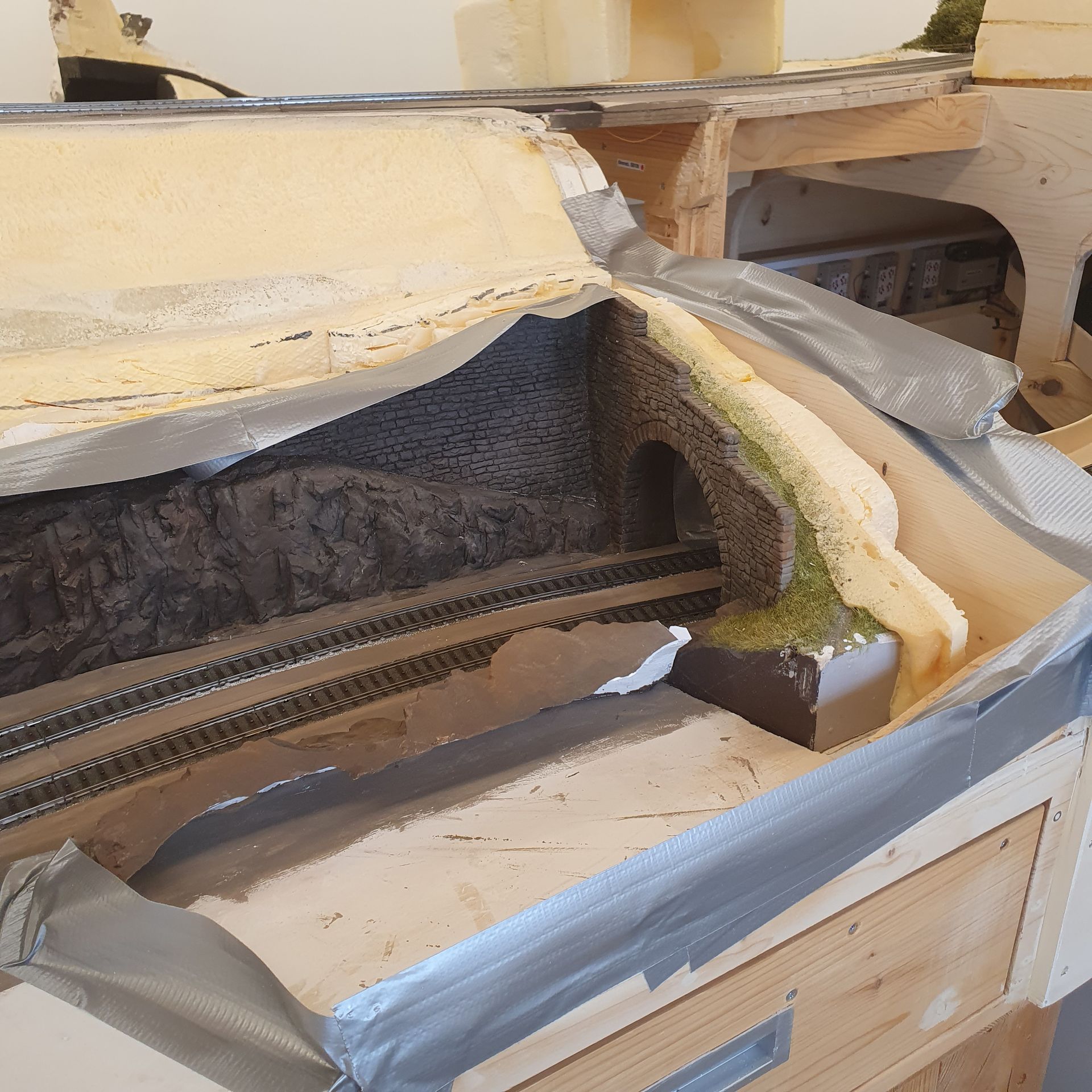 Übergang zum nächsten Modul wird angepasst und eine Tunnelröhre hergestellt, der den Einblick in den Schattenbahnhof verhindern soll.