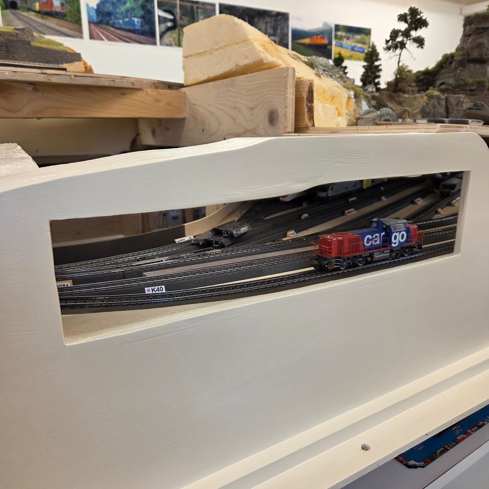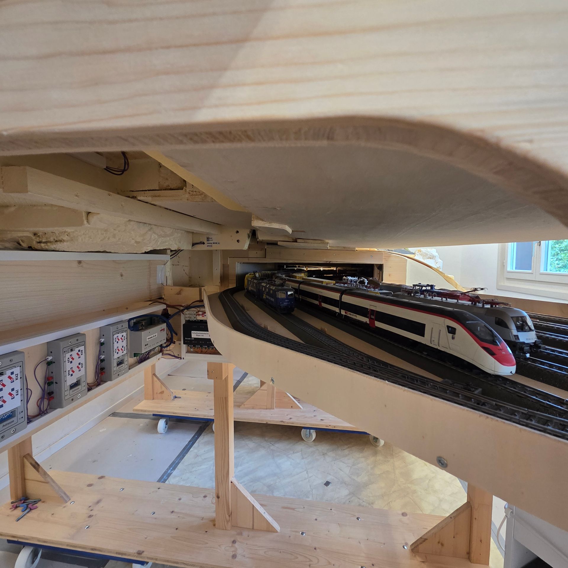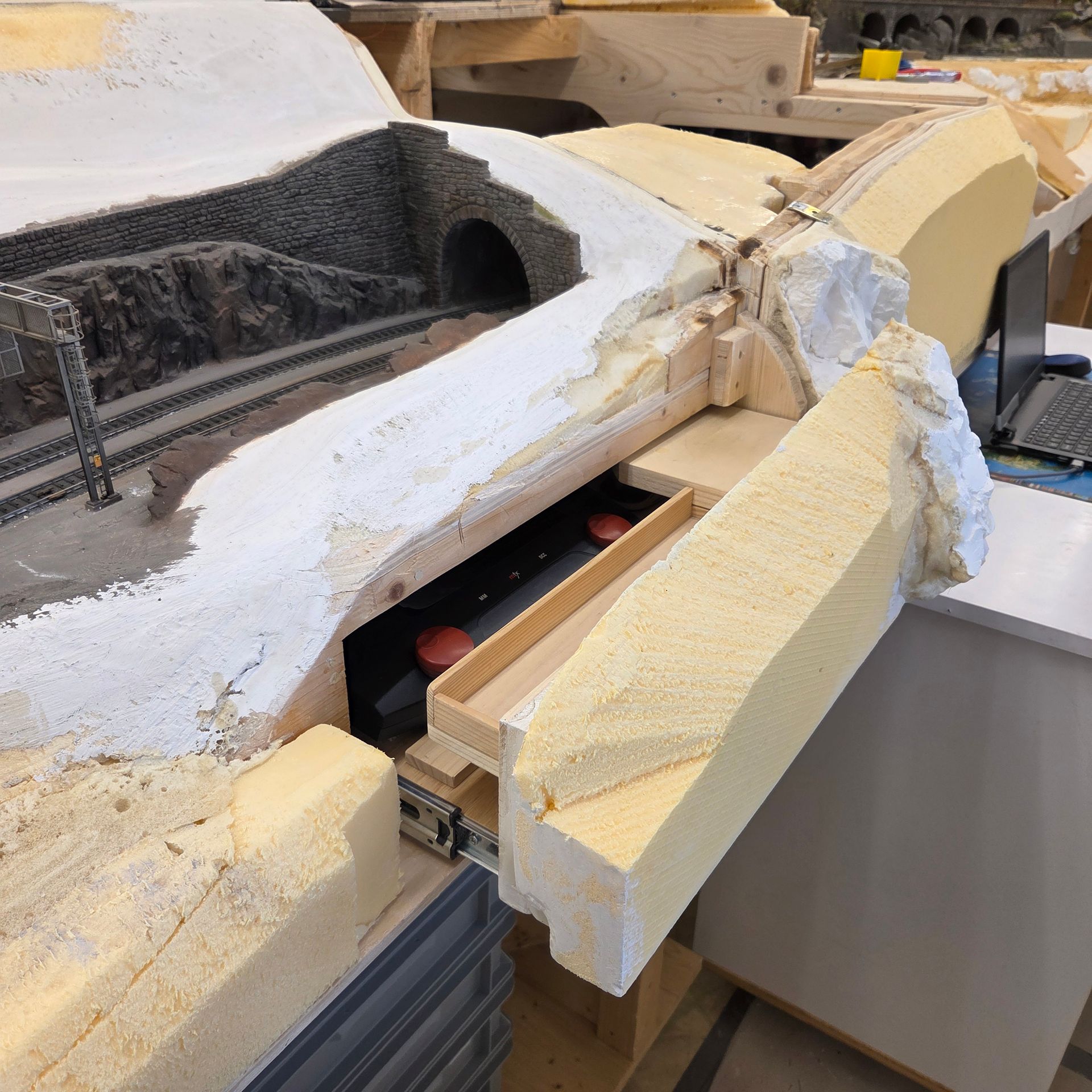 Verdeckte CS3 Schublade und bereits vorbereitetes, nach oben herausziehbares Landschaftsteil, um an die abgestellten Bauzüge zu gelangen. An die Elektronik und die Zugkompositionen, kommt man gut von der gegenüberliegenden Seite unter der Anlage. Die aufgeklebten Styrodurplatten werden noch mit weitern Felspartien ergänzt, was dem Gesamtbild der Aussenwände der Anlage, mehr Attraktivität verleiht, im Gegensatz zu einer einfachen Sperrholzplatte.