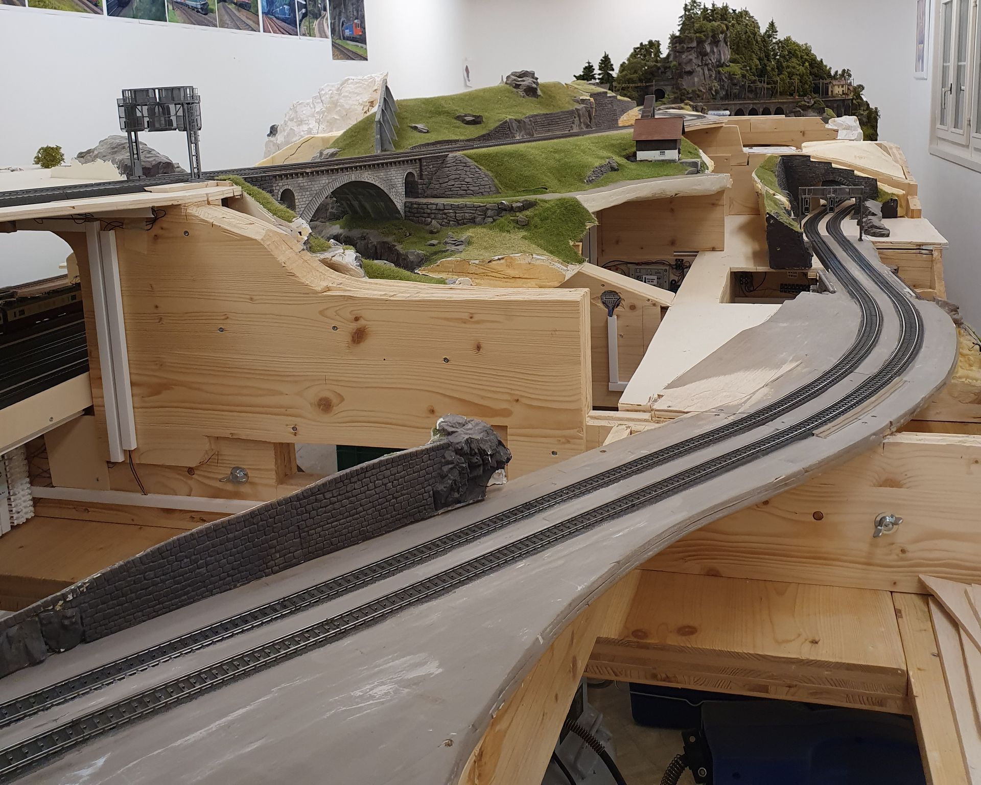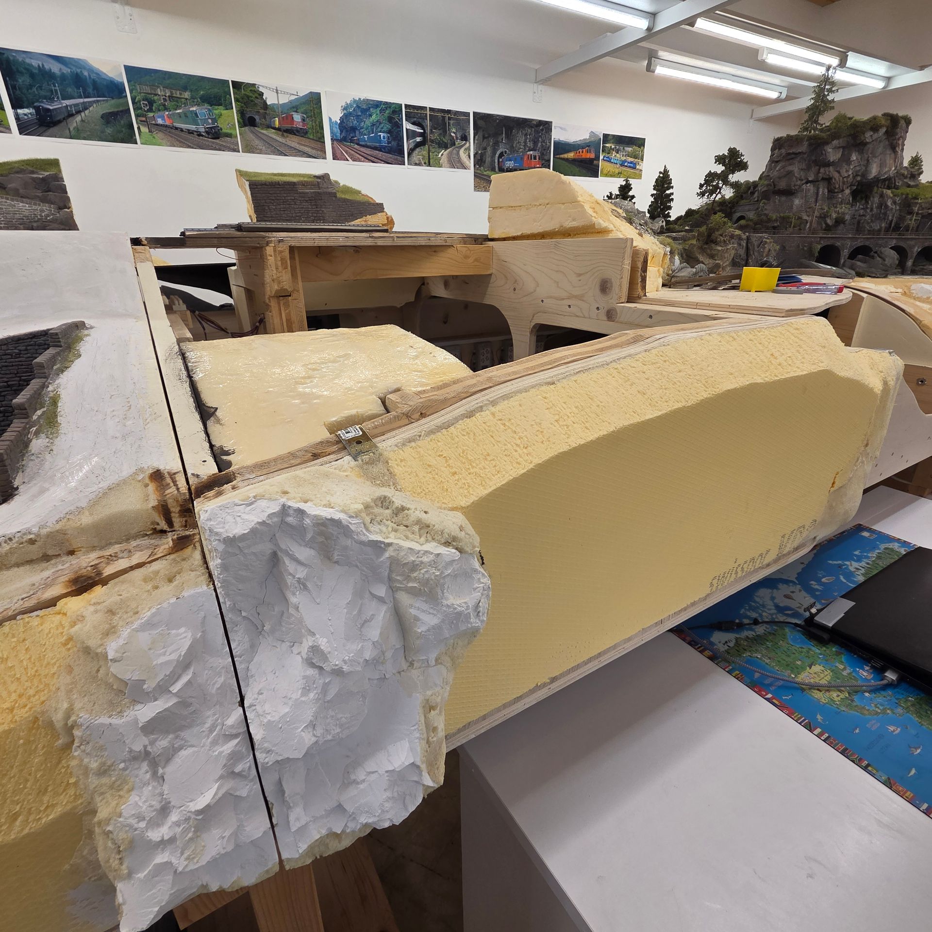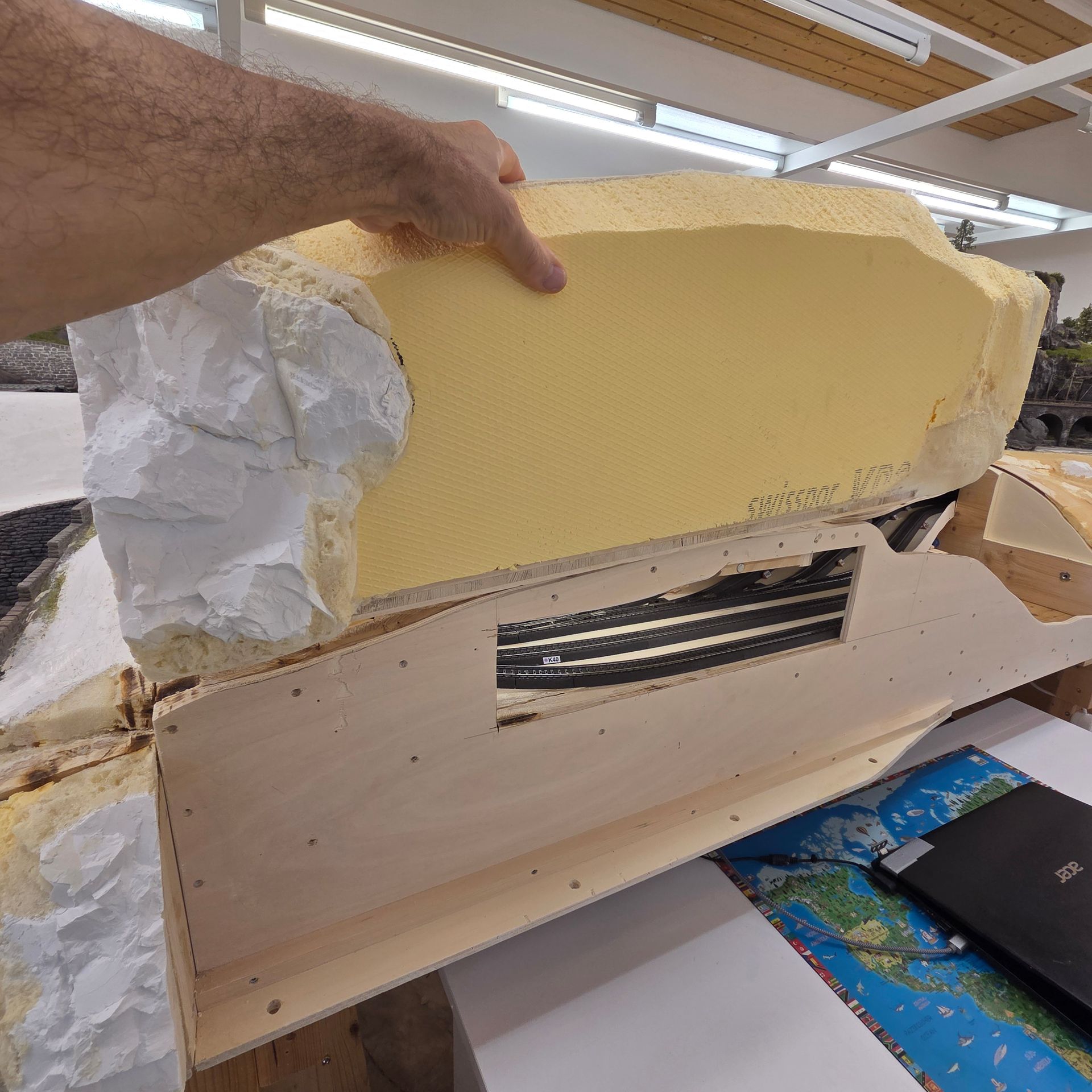 Verdeckte CS3 Schublade und bereits vorbereitetes, nach oben herausziehbares Landschaftsteil, um an die abgestellten Bauzüge zu gelangen. An die Elektronik und die Zugkompositionen, kommt man gut von der gegenüberliegenden Seite unter der Anlage. Die aufgeklebten Styrodurplatten werden noch mit weitern Felspartien ergänzt, was dem Gesamtbild der Aussenwände der Anlage, mehr Attraktivität verleiht, im Gegensatz zu einer einfachen Sperrholzplatte.