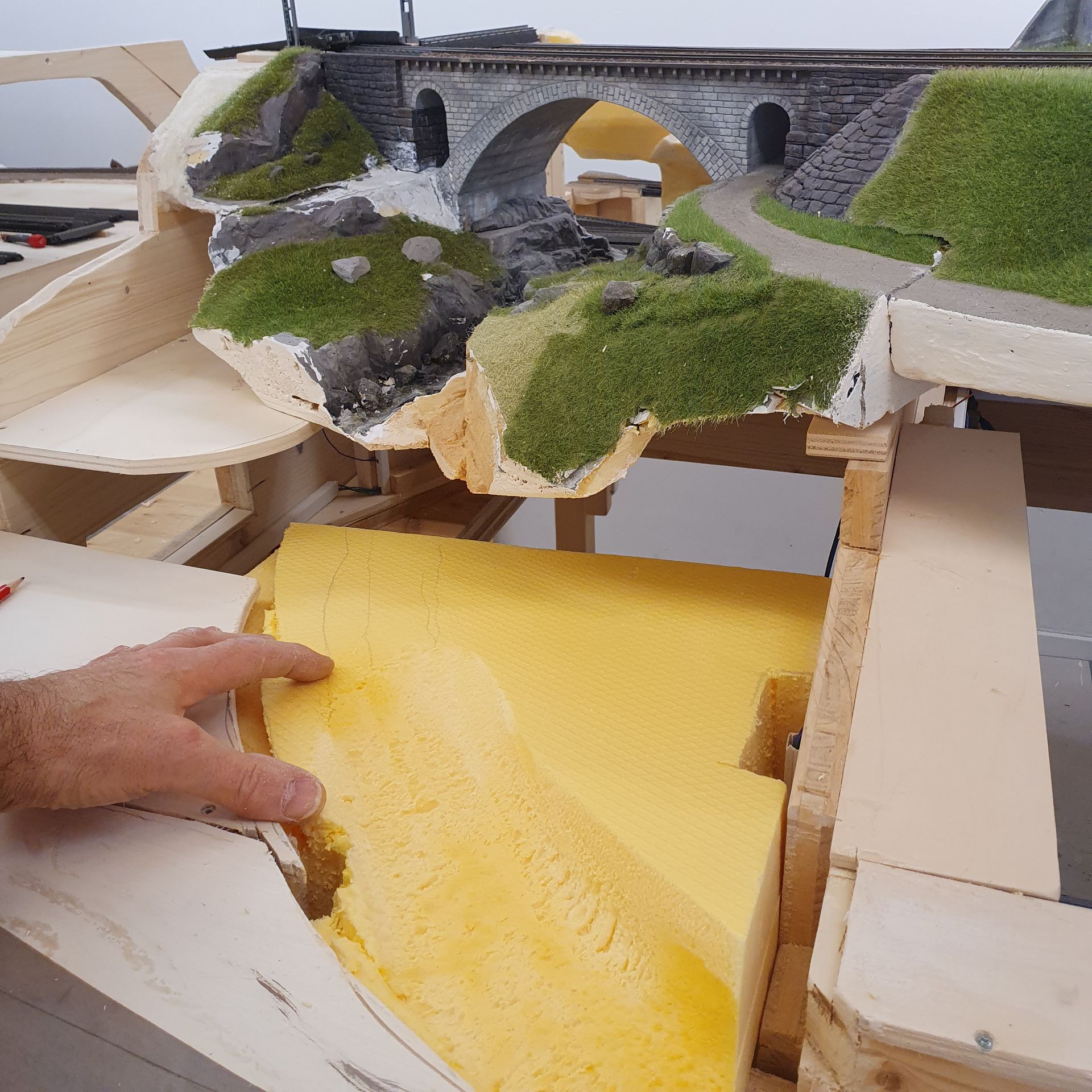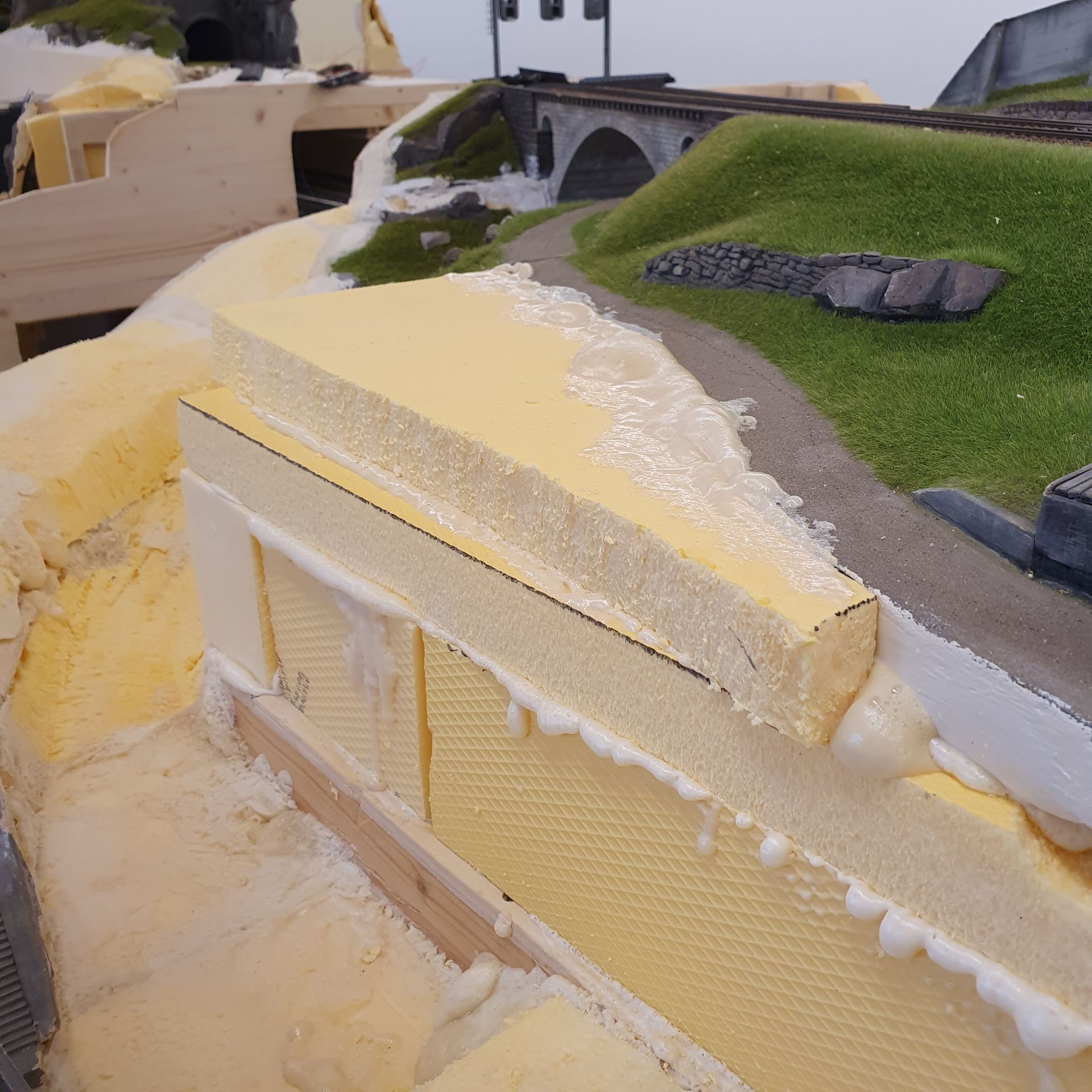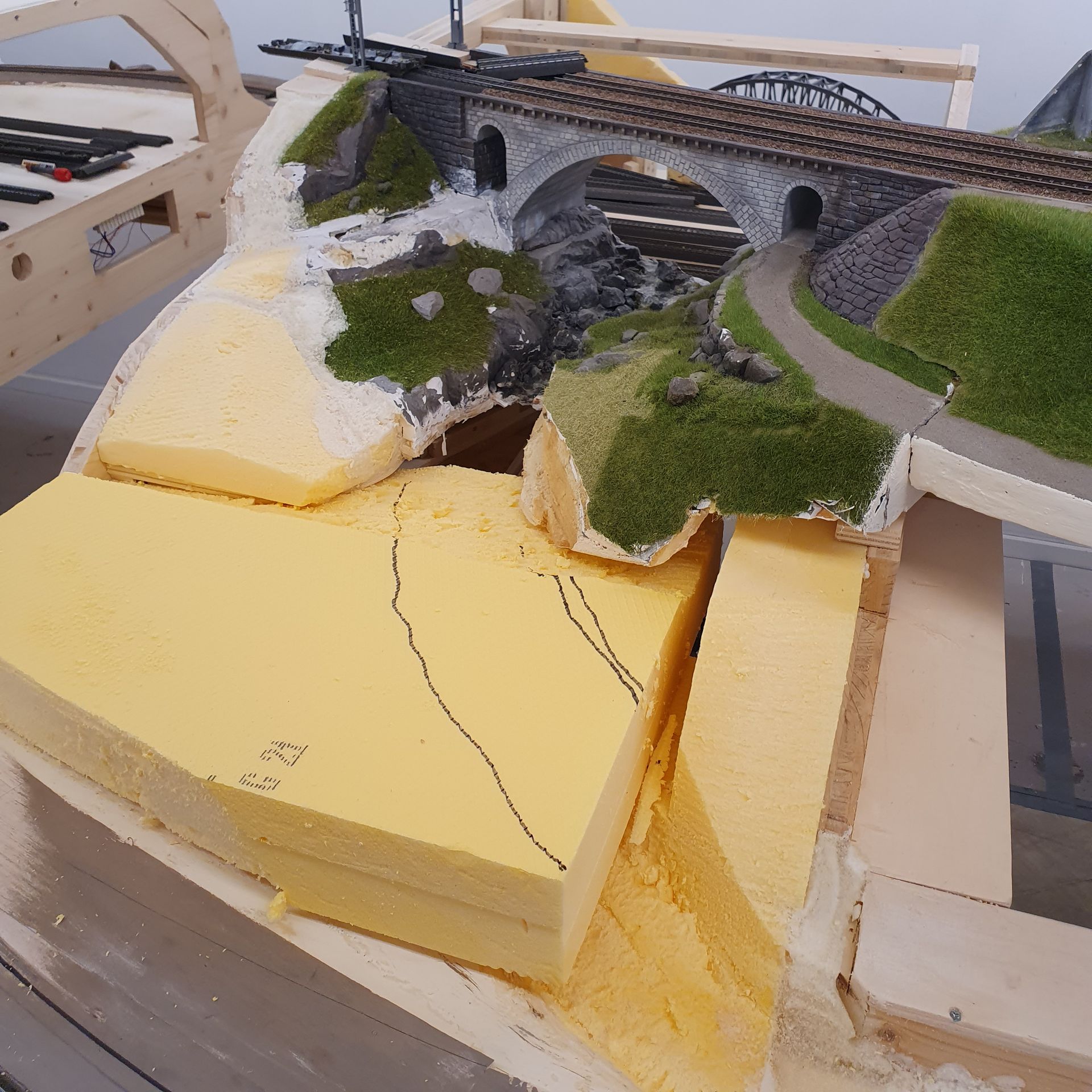 Die folgenden Bilder zeigen die stufenweise Anpassung der Geländestruktur, mit Hartschaumplatten, 2 Komponenten- Schaum und vorgefertigten "Urirocks", an die bereits bestehenden, modellierten Landschaftsteile der alten Anlage. Eine spannende Herausforderung.