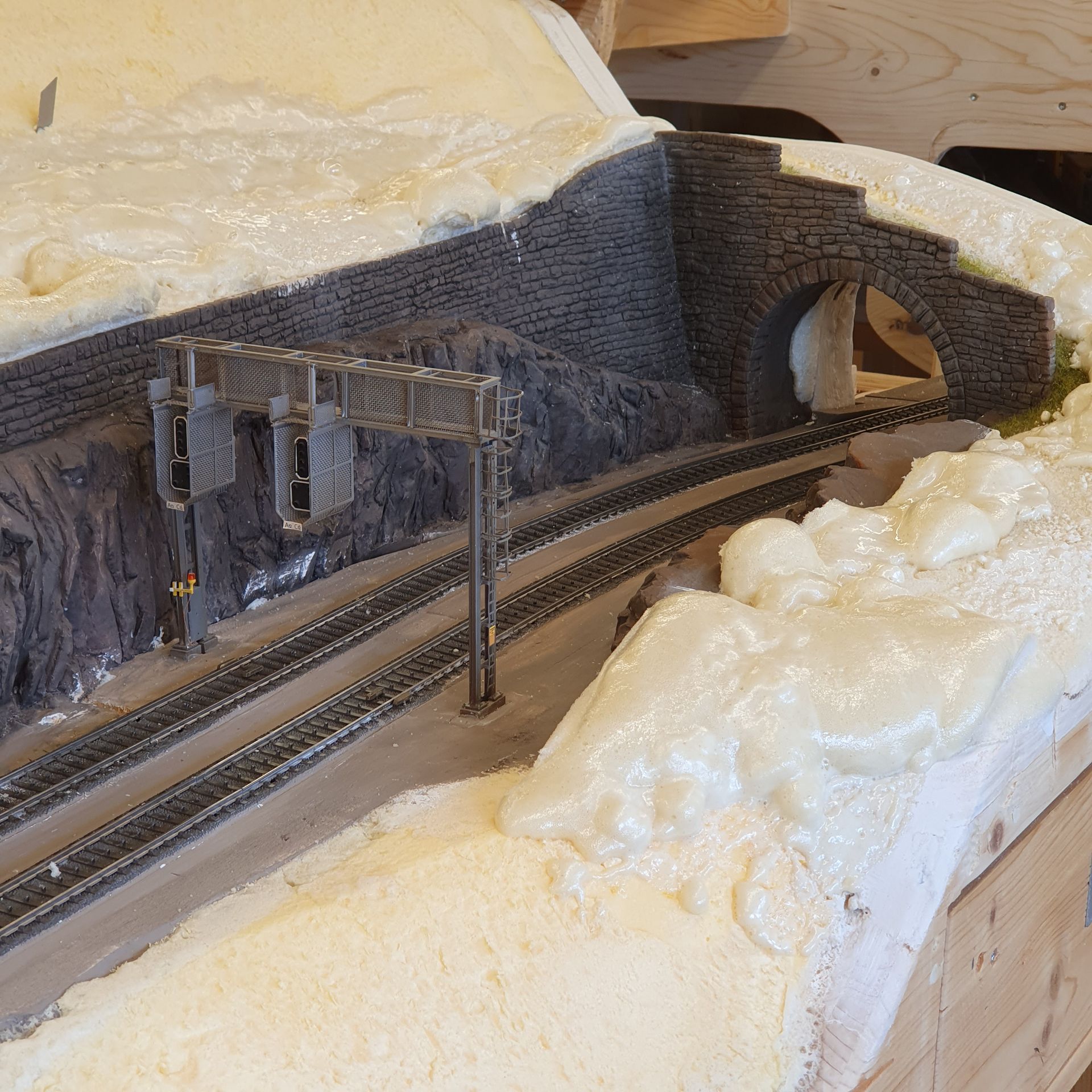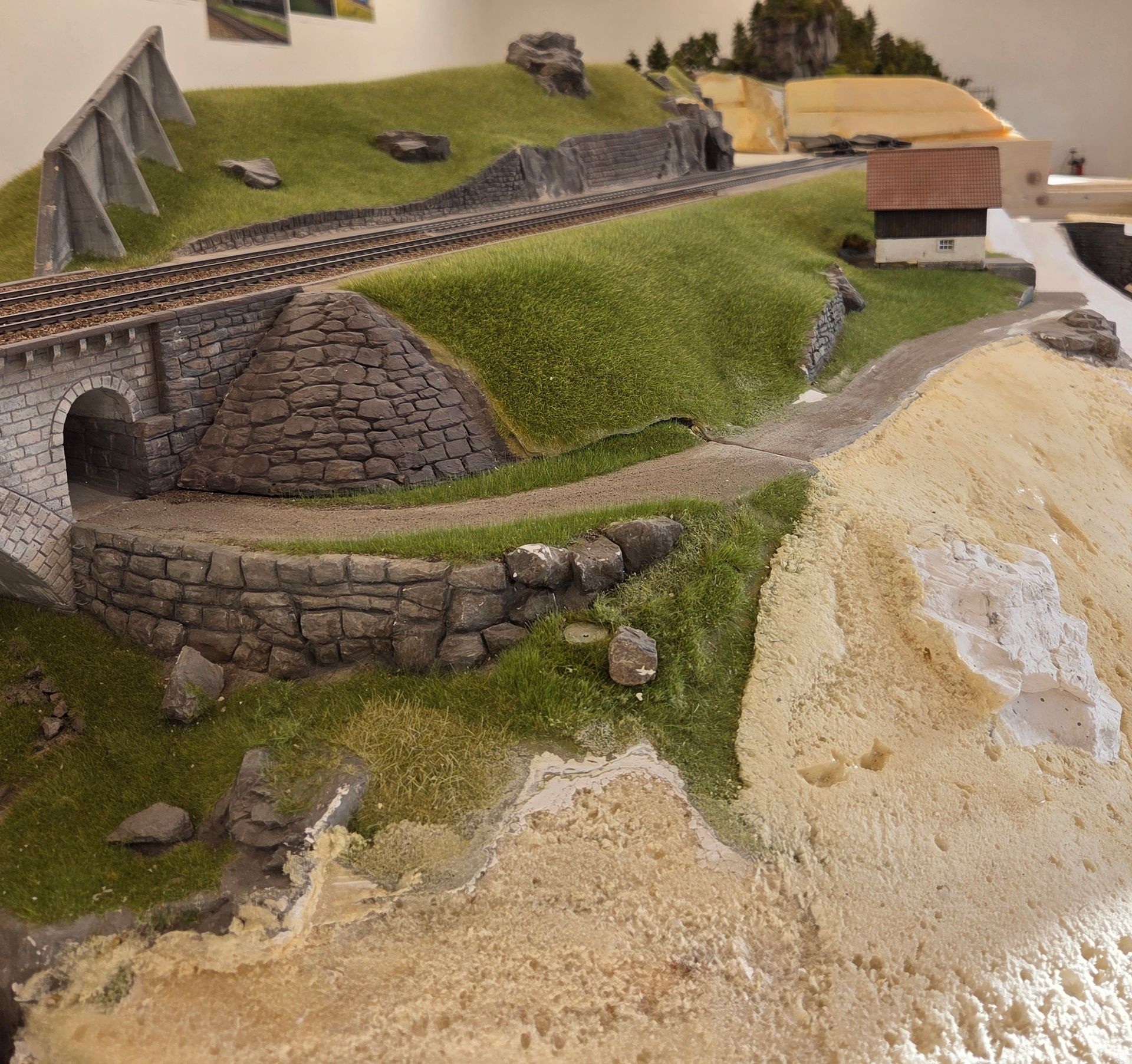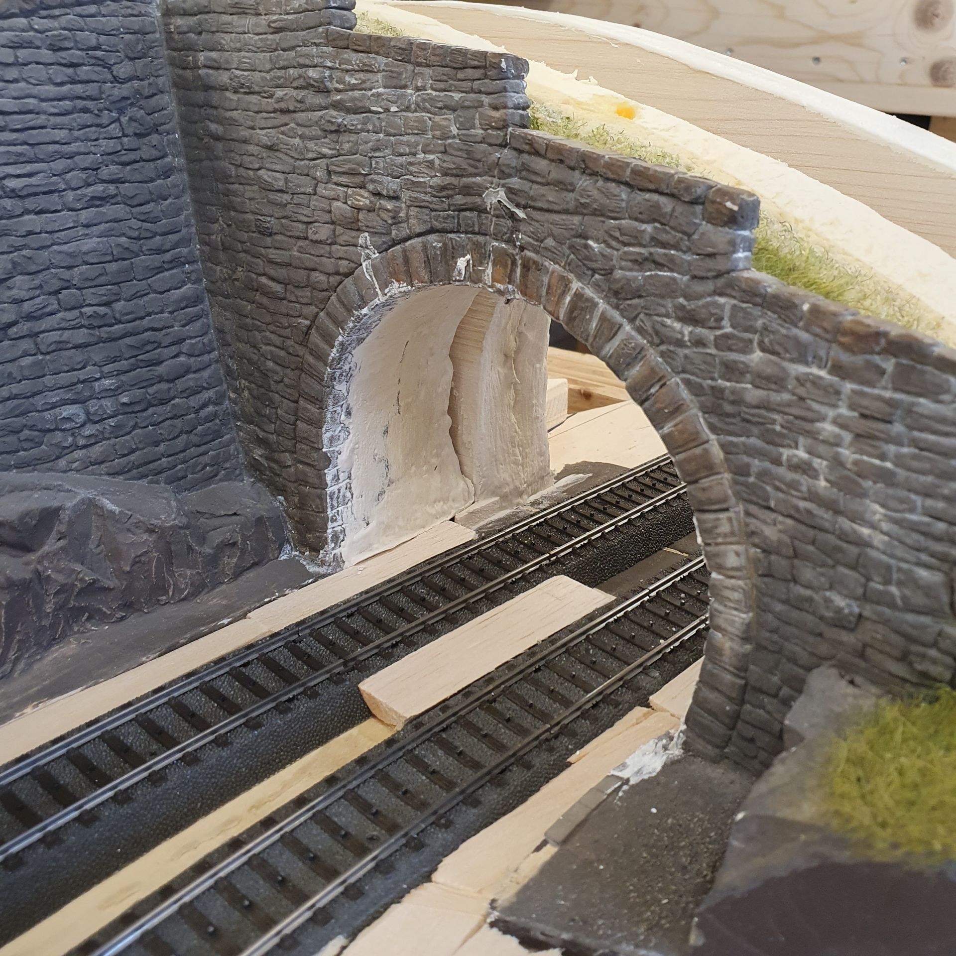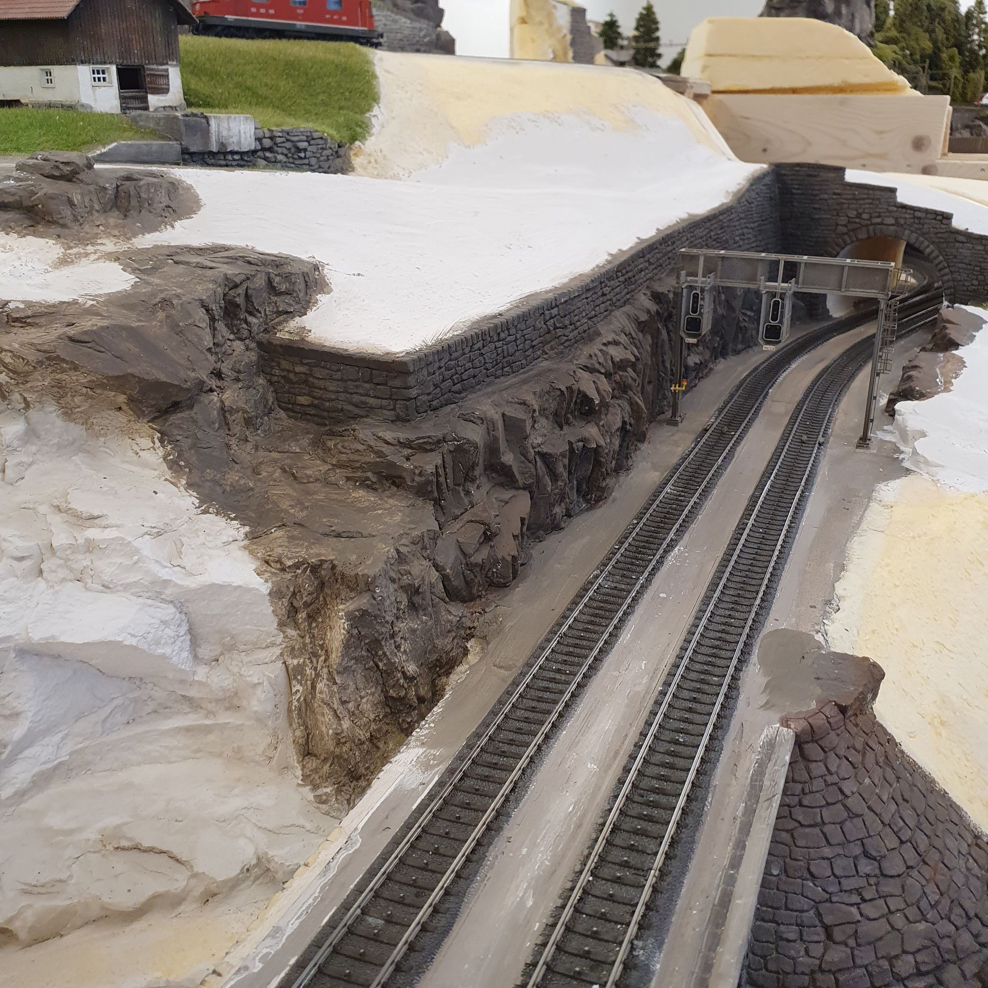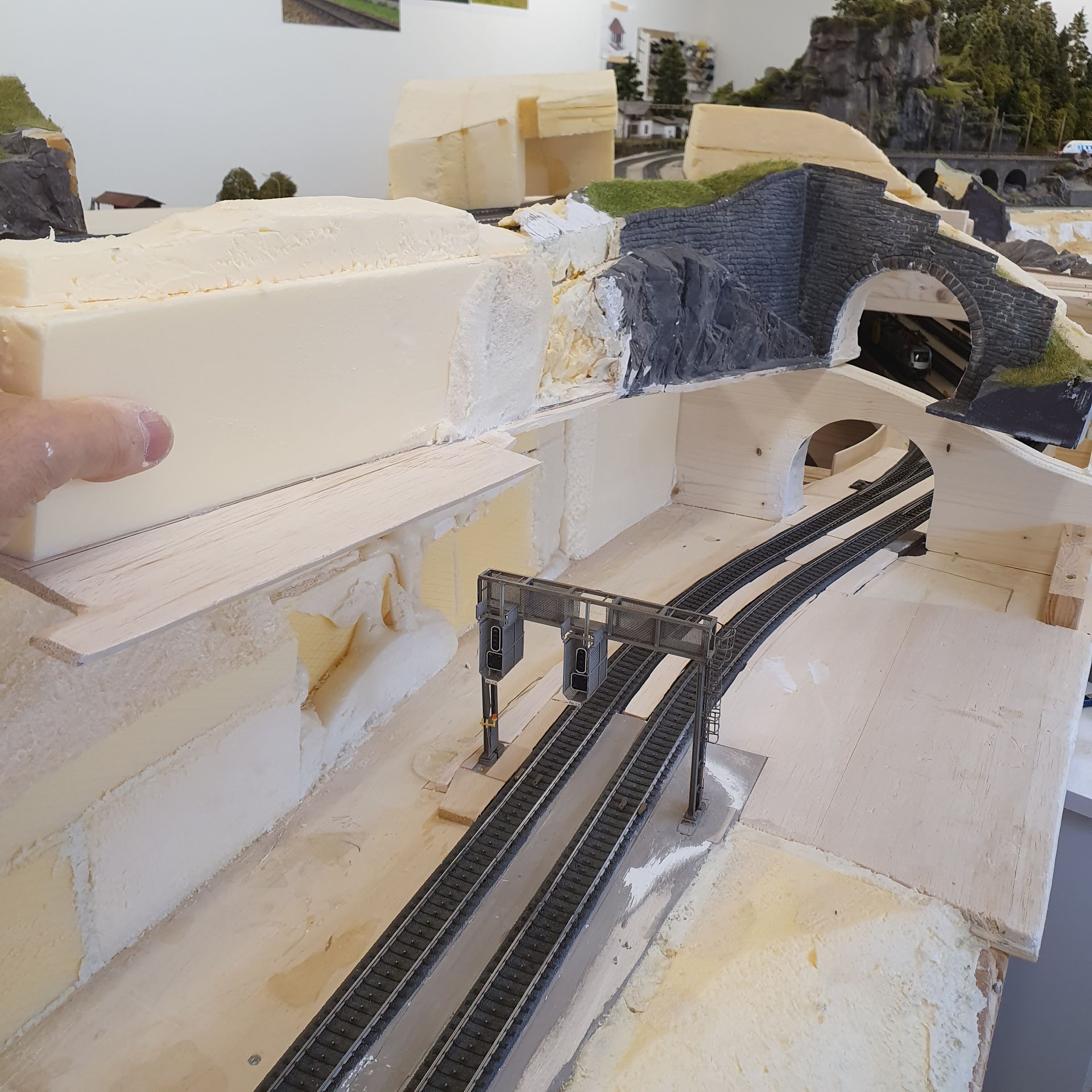 Das von der alten Anlage ausgeschnittene Rohrbach-Tunnelportal mit Stützmauer wird am Werktisch der neuen Gleisführung angepasst, bevor es fest eingeklebt wird. Hierfür verlängere ich die Stützmauer und Felspartie um 50cm und orientiere mich dabei an Vorbildfotos.