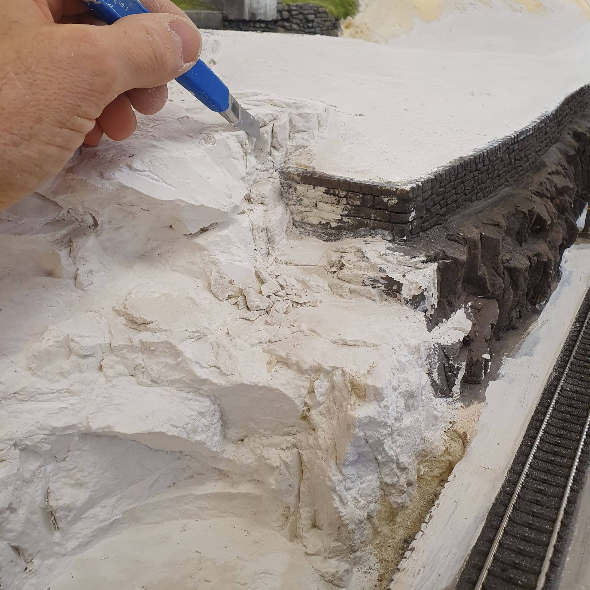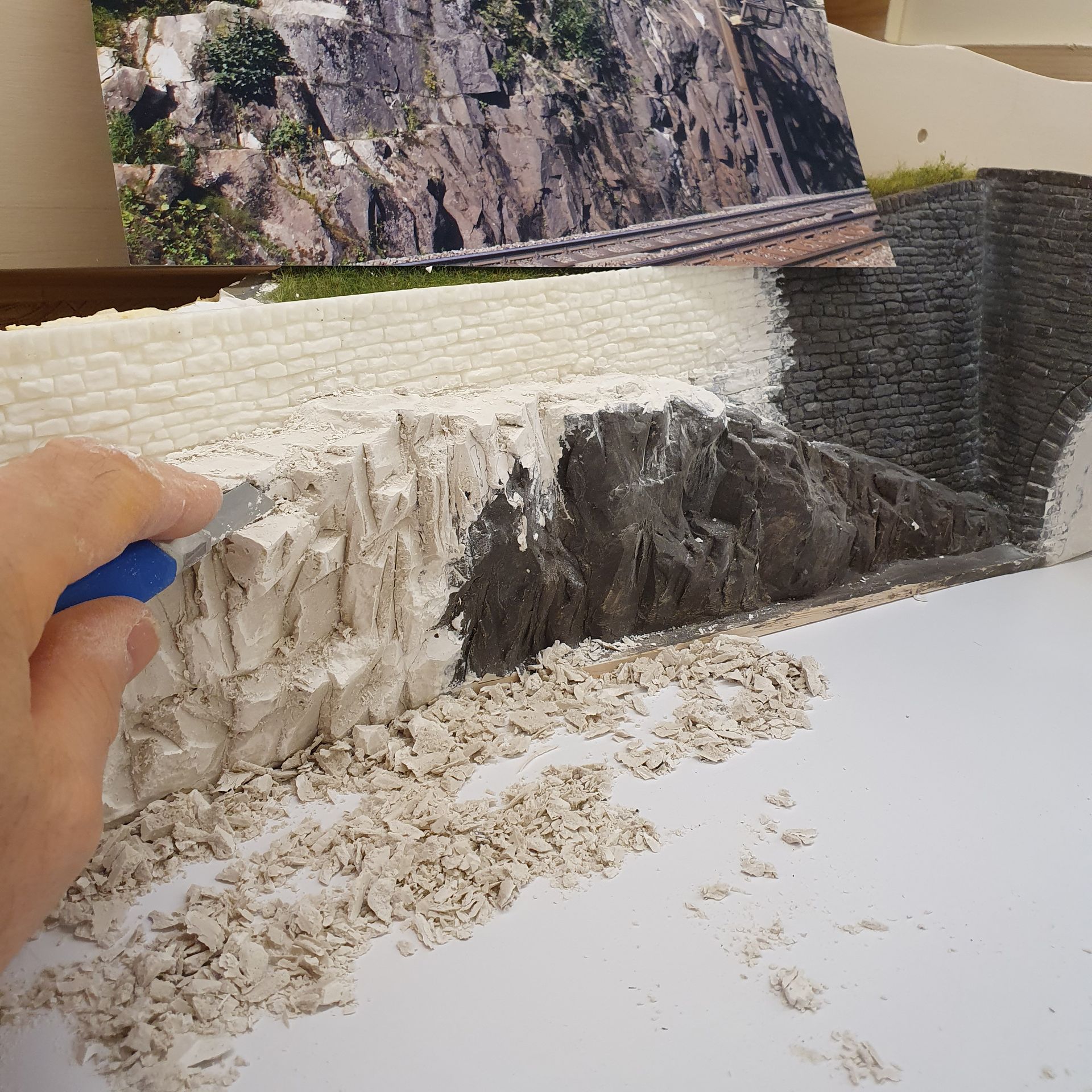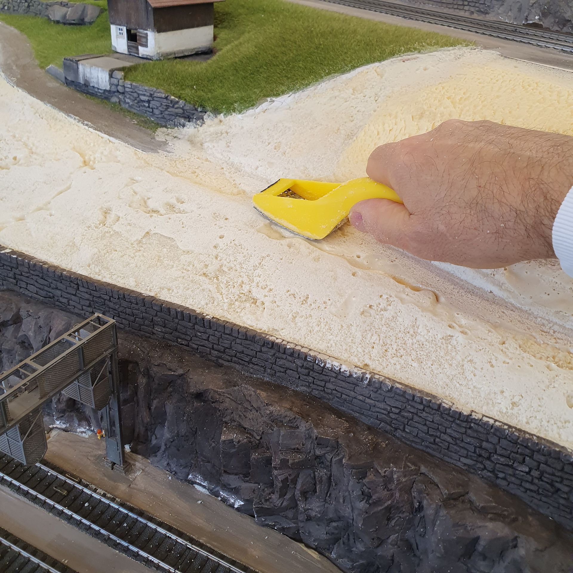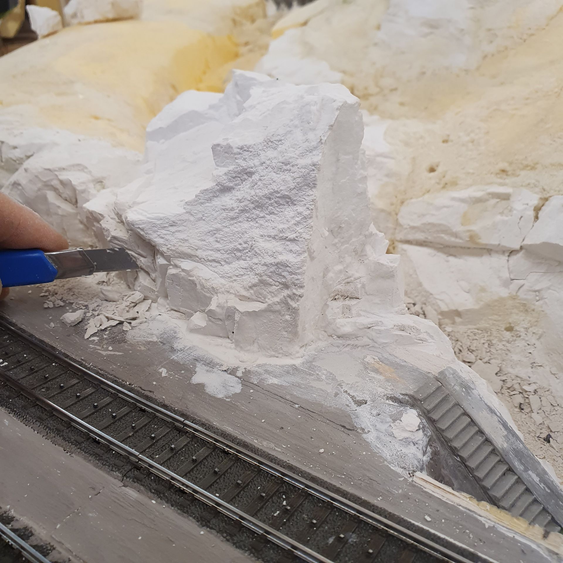 Die mit Schaum ausgefüllten Hohlräume der platzierten "Urirocks", werden mit Moltofill überzogen, um anschliessend daraus mit dem Cutter Felsen zu modellieren. Was relativ leicht von Händen geht, da der angetrocknete Spachtel meist von selbst, in realistisch wirkende Steinstruktur abbricht.