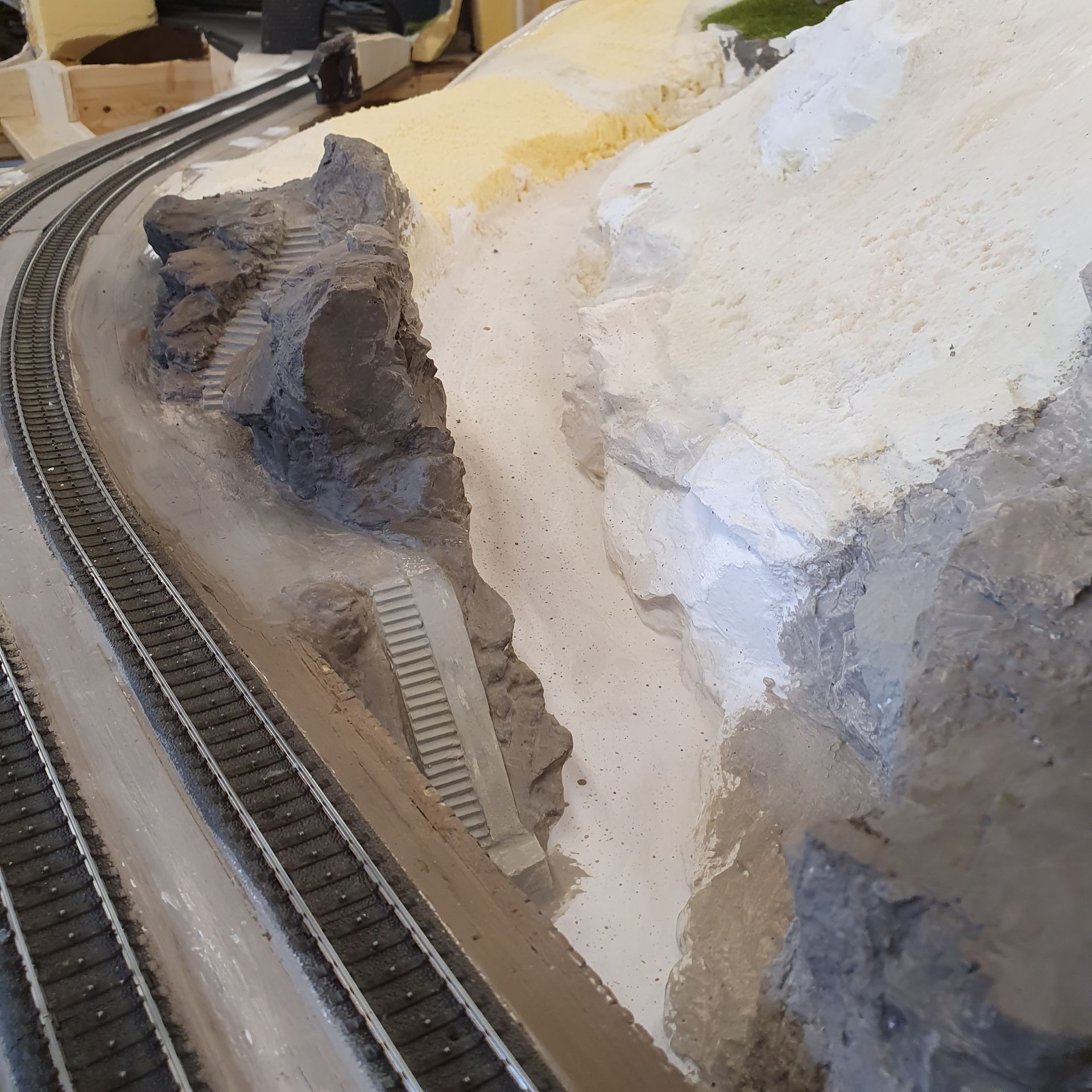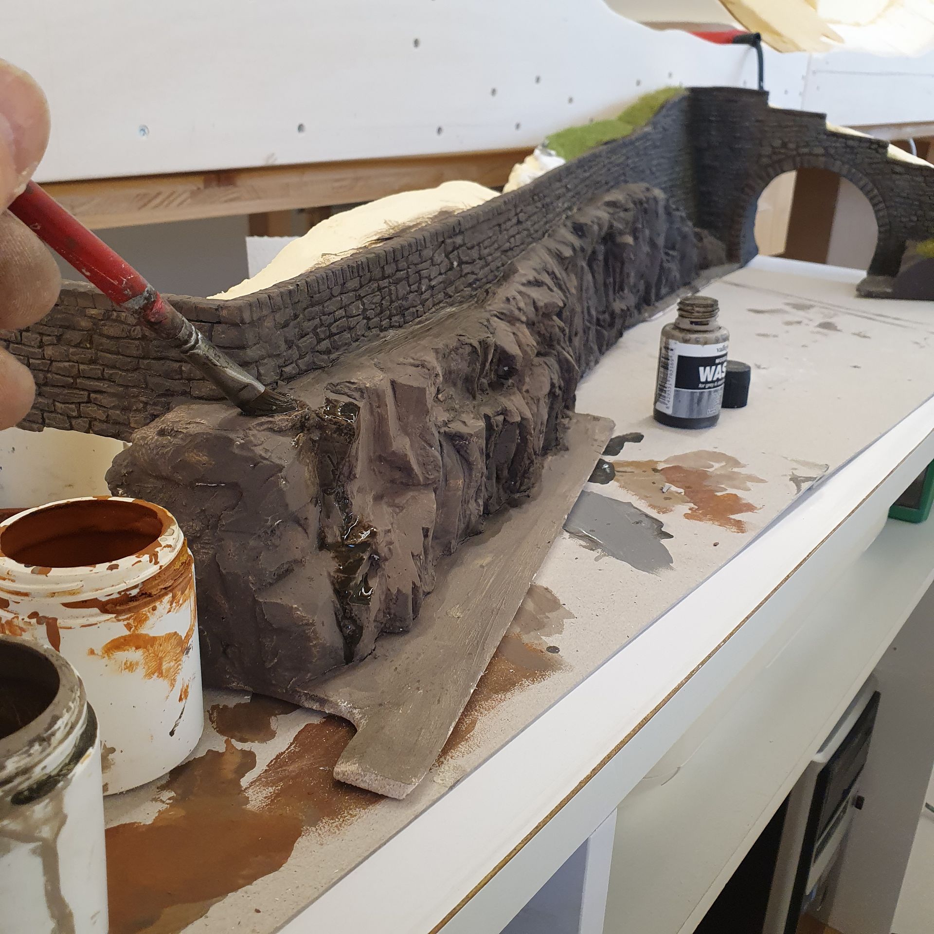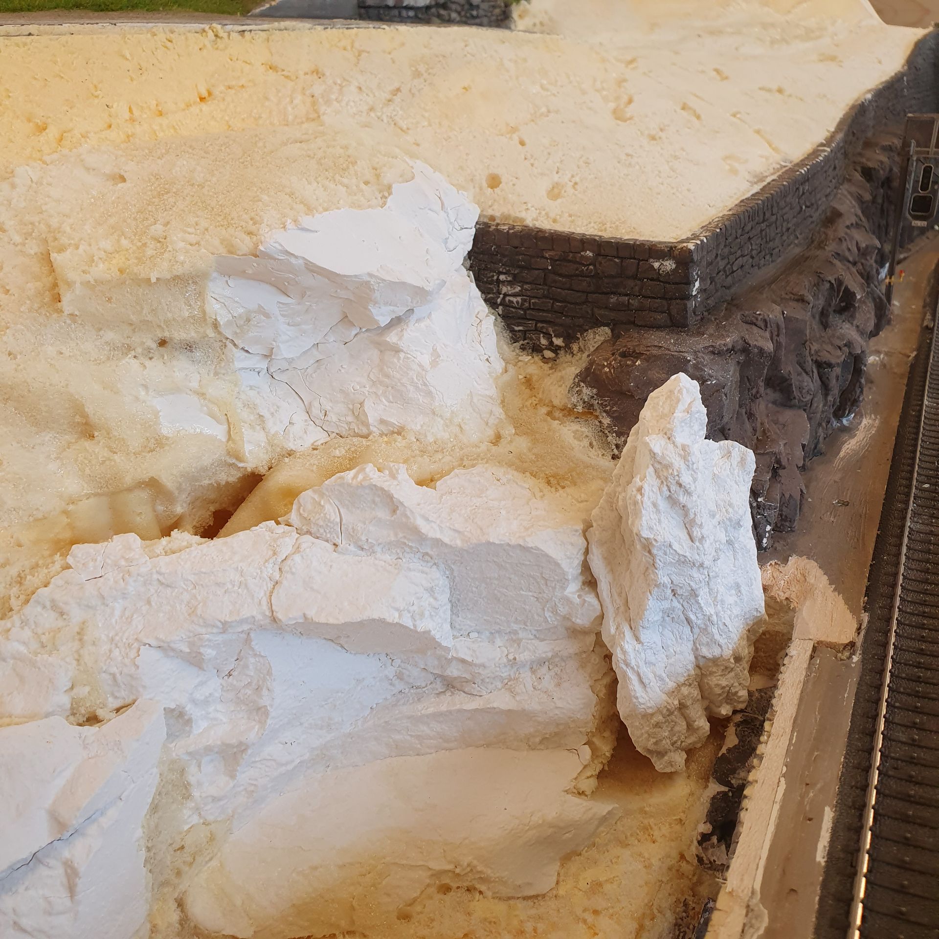 Die mit Schaum ausgefüllten Hohlräume der platzierten "Urirocks", werden mit Moltofill überzogen, um anschliessend daraus mit dem Cutter Felsen zu modellieren. Was relativ leicht von Händen geht, da der angetrocknete Spachtel meist von selbst, in realistisch wirkende Steinstruktur abbricht.