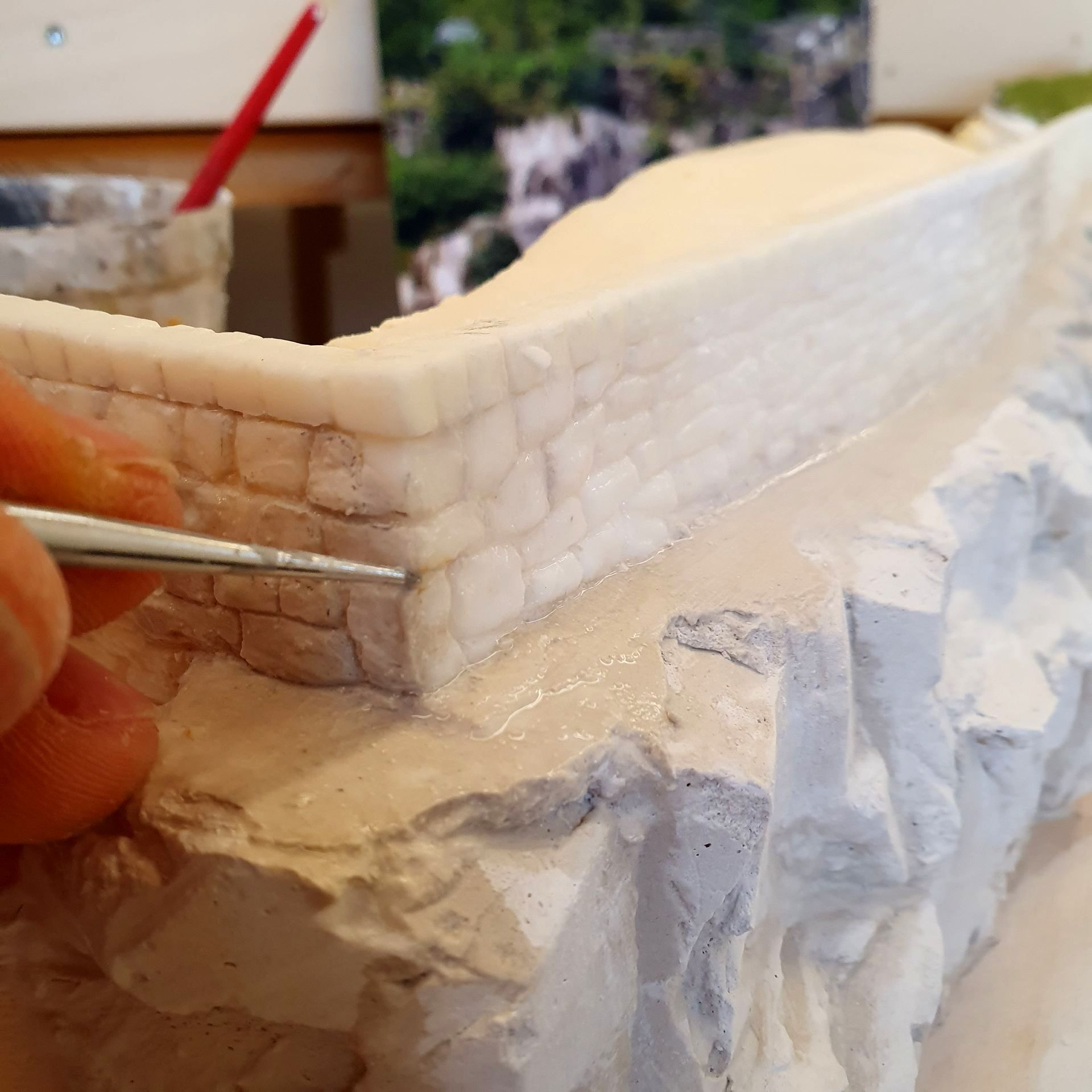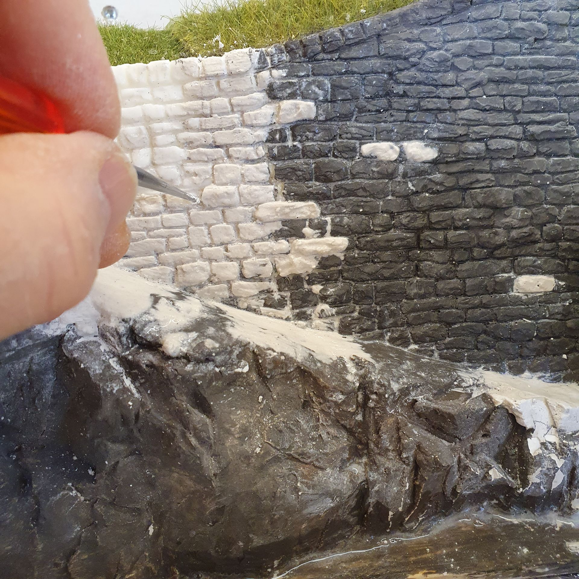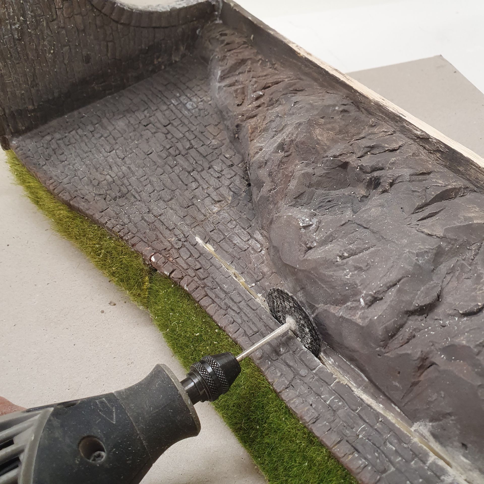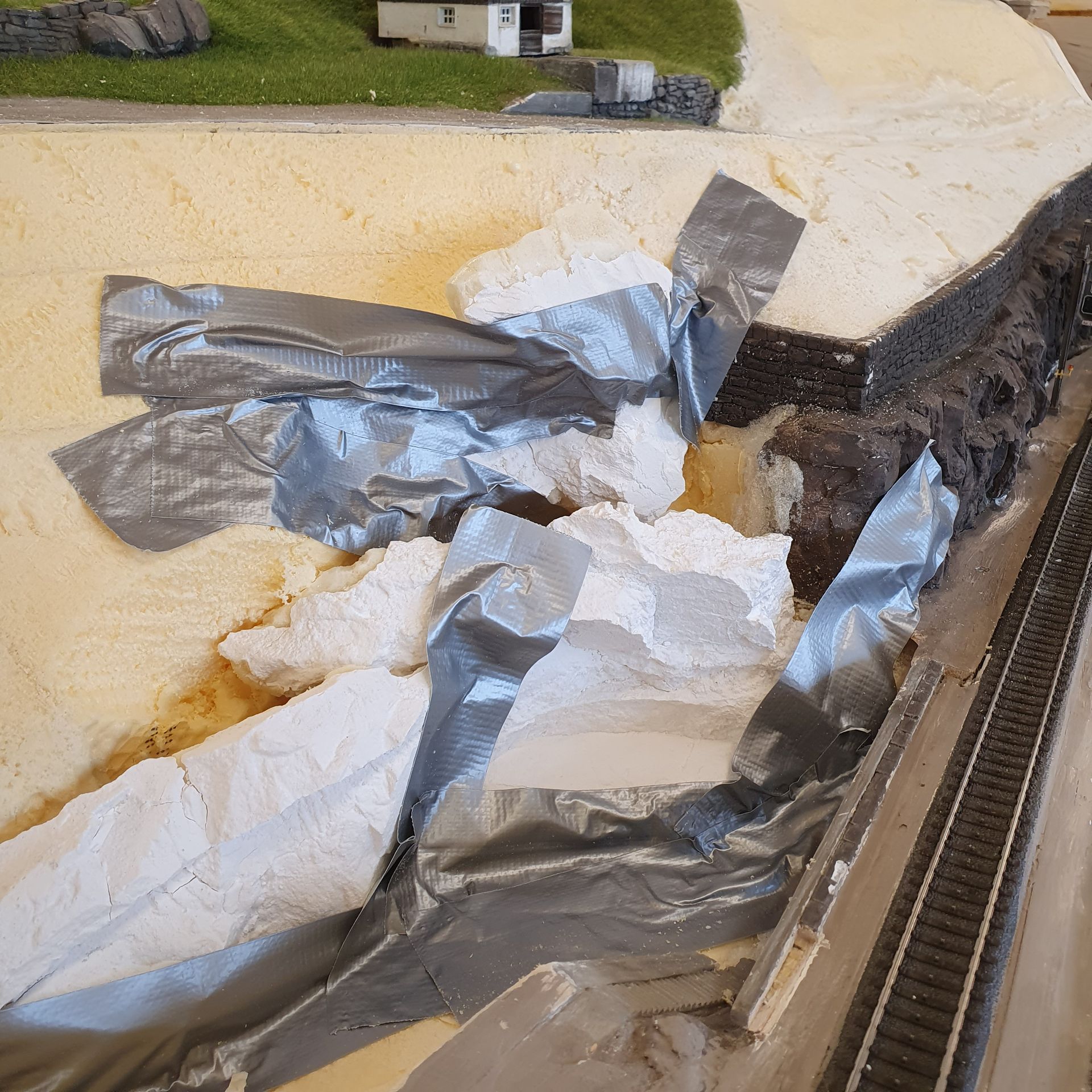 Die mit Schaum ausgefüllten Hohlräume der platzierten "Urirocks", werden mit Moltofill überzogen, um anschliessend daraus mit dem Cutter Felsen zu modellieren. Was relativ leicht von Händen geht, da der angetrocknete Spachtel meist von selbst, in realistisch wirkende Steinstruktur abbricht.
