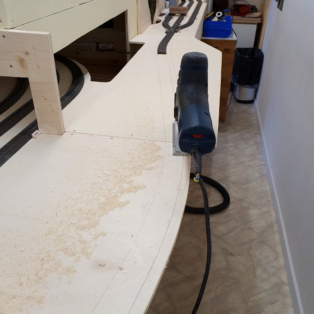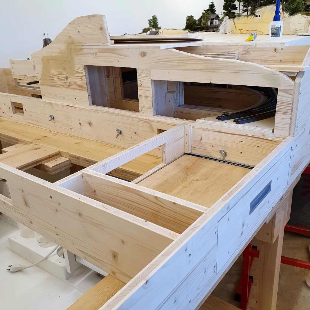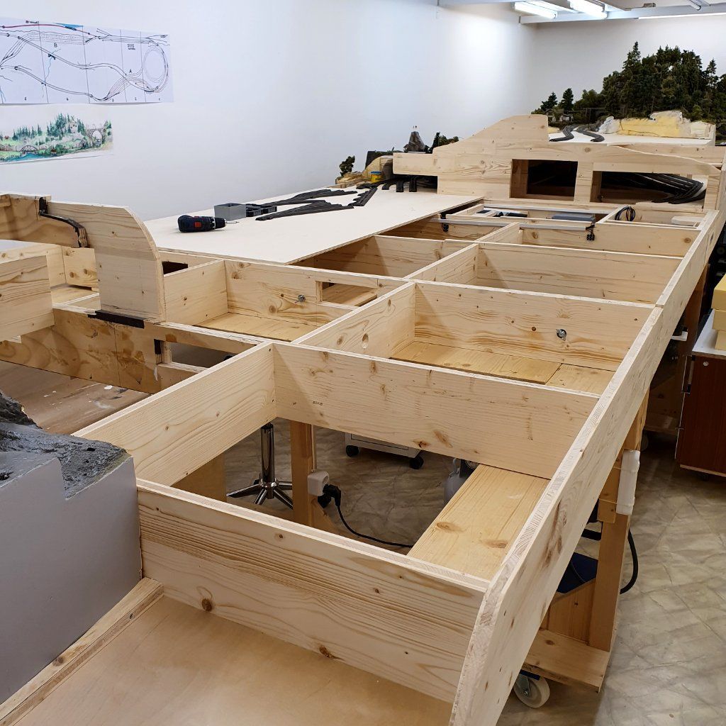 Das neue Grundgerüst besteht aus sieben, fahrbaren Holzträgern. Diese entstanden aus 60x60mm Tannenholzbalken und 19mm bzw. 27mm Dreischichtplatten, auf deren Grundplatte zwei Allzweckroller, durchgehend verschraubt wurden. Die Tragkraft eines Mapo-Rollers ist 500Kg, also mehr als genug, um auch mal währenddem Bau auf die Anlage zu steigen. Die sieben fahrbaren Holzträger wurden mit 27mm Dreischichtholzstreben miteinander verbunden, was ein sehr stabiles Grundgerüst ergab. Nach dem Zusammenbau des Grundgerüstes, wurden alle 2m, an die Stützbalken, Mehrfachsteckdosen montiert. So kann ich heute "es bitzli Gotthard" in alle Richtungen verschieben und erhalte so mehr Platz beim Bauen und Modellieren und die 8 Steckdosen um die Anlage, haben sich als äusserst praktisch erwiesen! Der Grundrahmen für den Aufbau der neuen Module, wurde ebenfalls aus 19mm Dreischichtplatten hergestellt und das Trasse für das C-Gleis, habe ich aus 10mm Pappelsperrholz zurecht gesägt. Bilder zu dieser Bauphase sind in den Impressionen vom Umbau zu sehen.
