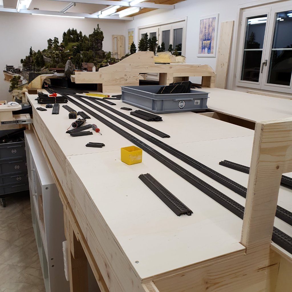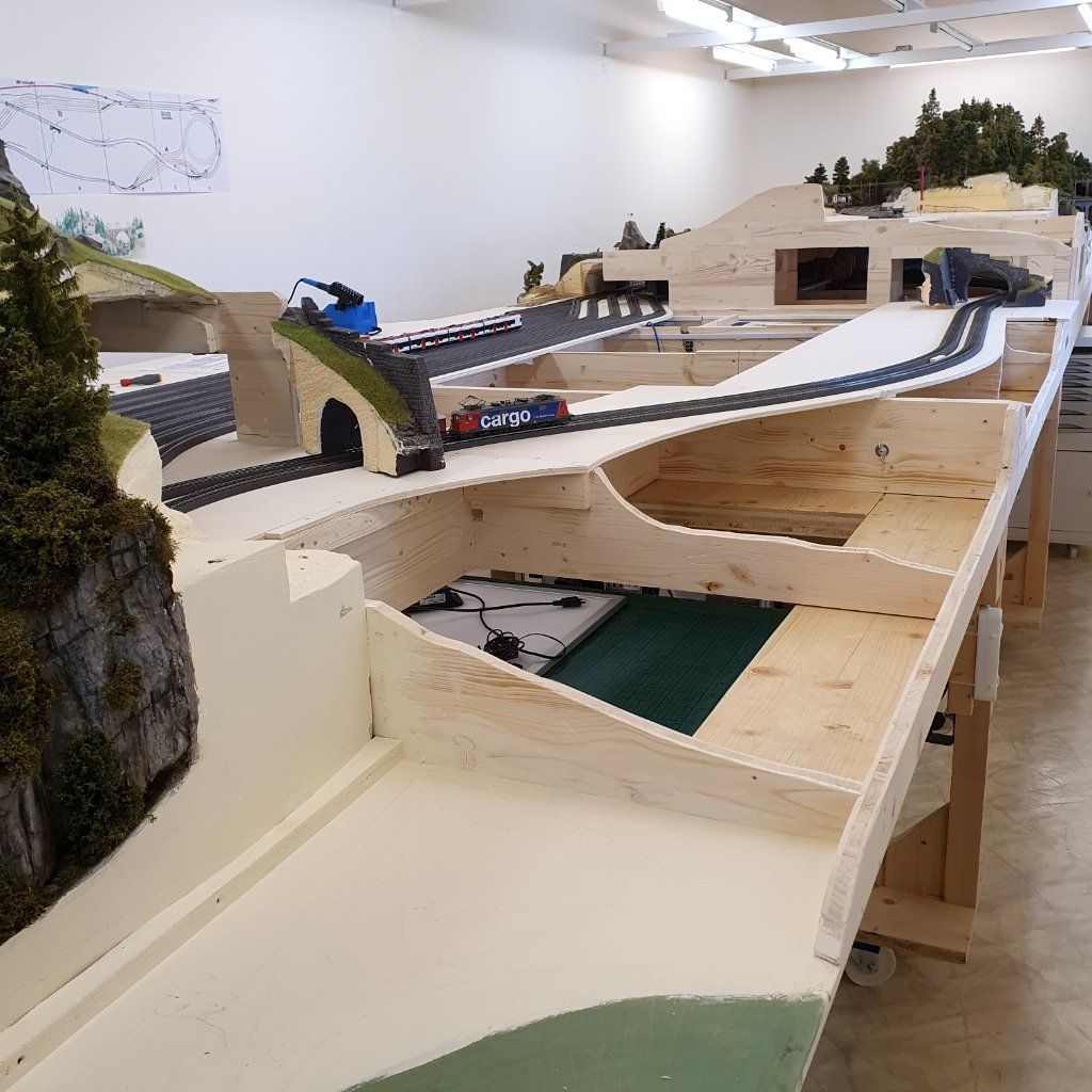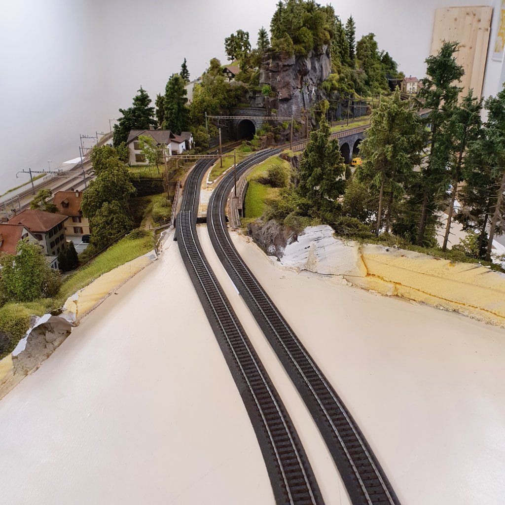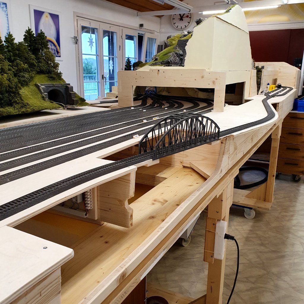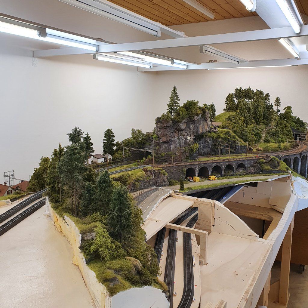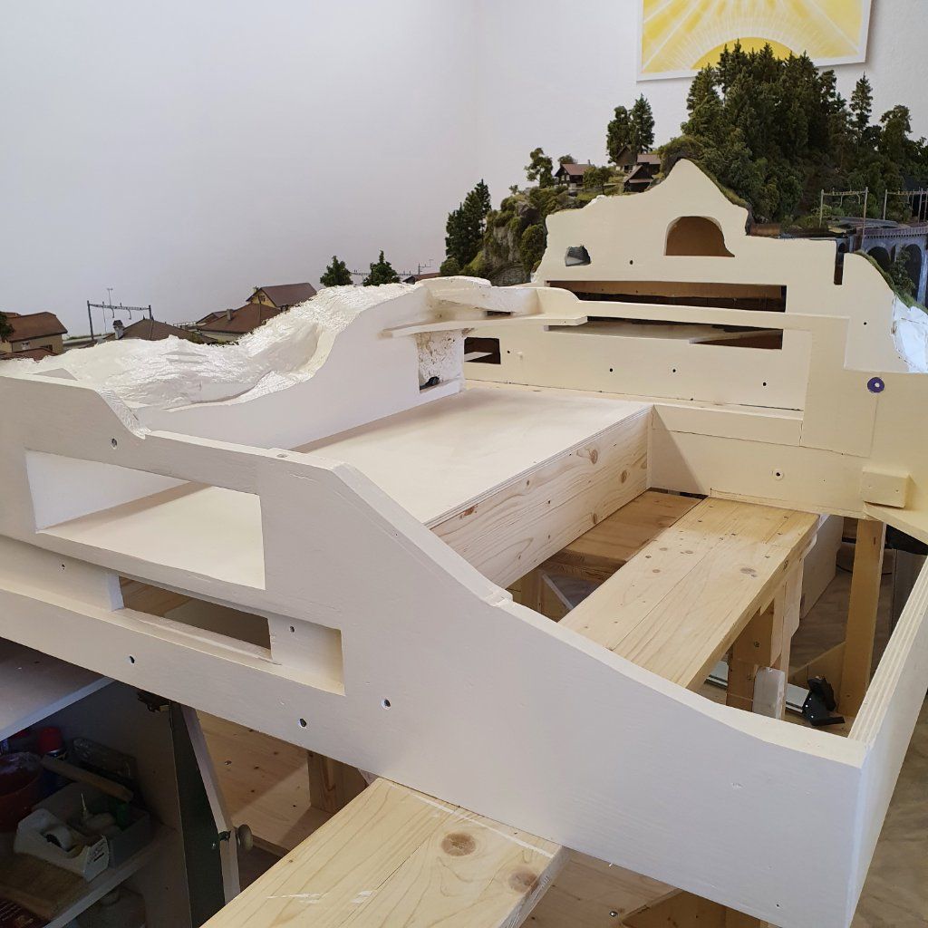 Bin im Dezember 2020 umgezogen und habe nun einen neuen Raum für "es bitzli Gotthard". Dieser schöne Raum, mit Sicht ins Grüne, ist 12m x 3.30 groß. Die alte Anlage mit ihrer U-Form 4,5m x 5m passte da nicht mehr rein und musste deshalb auf 2m x 10m umgebaut werden. Dies natürlich mit einem Teil der bereits vollendeten Module, an denen jedoch einige aufwendige Anpassungen nötig waren. "Es bitzli Gotthard" lässt sich nun ringsum betrachten, was doch eine wesentliche Verbesserung darstellt.