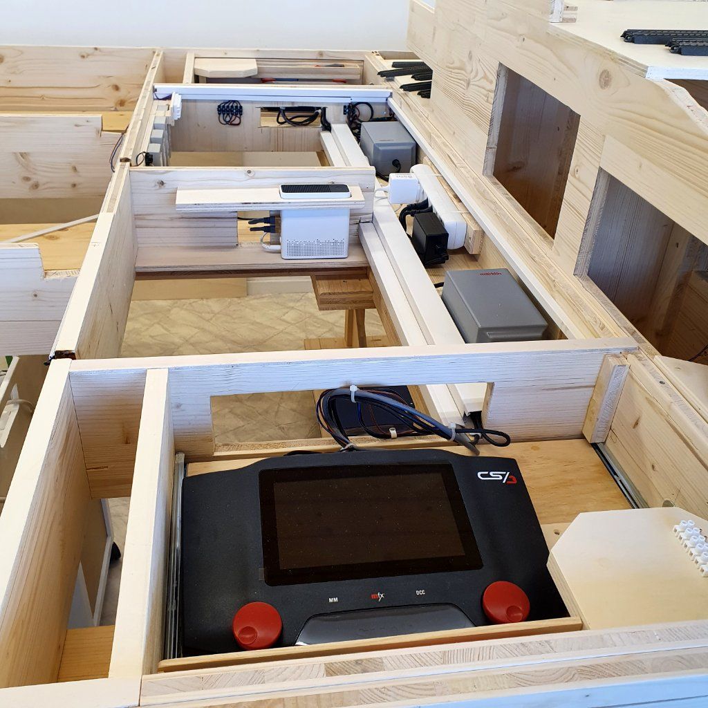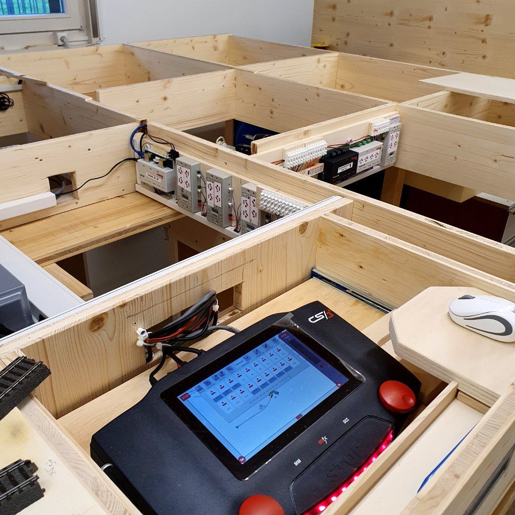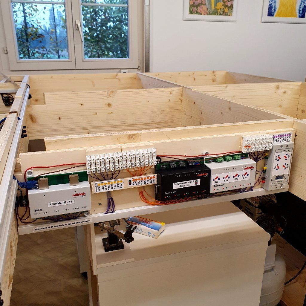 Gesteuert wird die Anlage mit einer CS3+ und einer CS3, aufgeteilt in zwei Stromkreise, auf je drei Module. Die beiden CS3 sind geschützt und getarnt in Schubladen untergebracht. Weiter wurden mit dem LinkS88 und weiteren S88 Rückmeldemodulen von Märklin und vielen Kontaktgleisen, die Abläufe (Ereignisse) programmiert . Sämtliche Kontaktgleise, werden nach dem überfahren, bez. nach dem Auslösen der Ereignisse durch die Decoder m84 deaktiviert und erst wieder durch den Fahrweg einer nächsten Lok, wenn nötig, aktiviert. Die Weichen werden mit den leisen, motorischen und zuverlässigen Antrieben von Viessmann (4568), angetrieben.