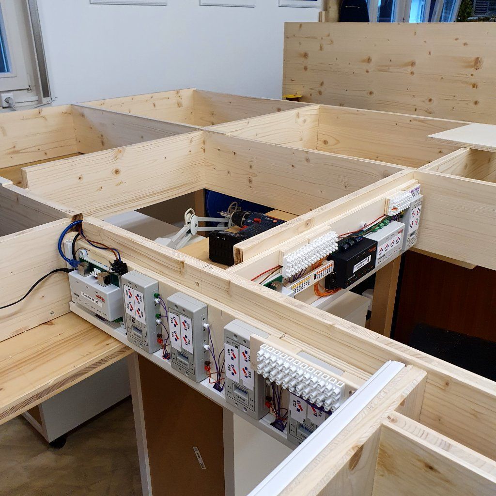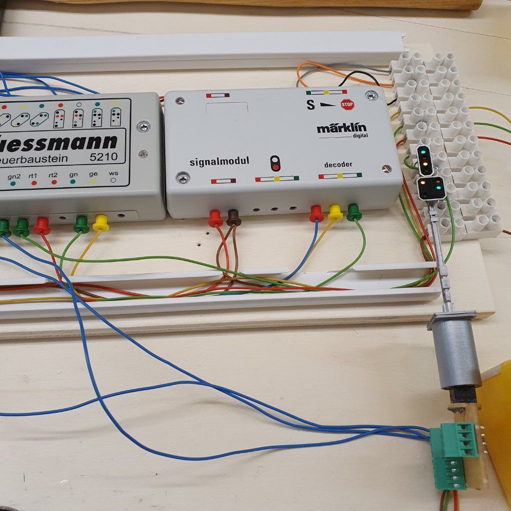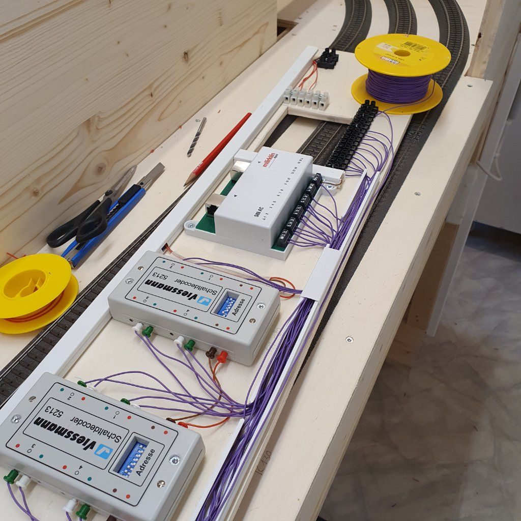 Gesteuert wird die Anlage mit einer CS3+ und einer CS3, aufgeteilt in zwei Stromkreise, auf je drei Module. Die beiden CS3 sind geschützt und getarnt in Schubladen untergebracht. Weiter wurden mit dem LinkS88 und weiteren S88 Rückmeldemodulen von Märklin und vielen Kontaktgleisen, die Abläufe (Ereignisse) programmiert . Sämtliche Kontaktgleise, werden nach dem überfahren, bez. nach dem Auslösen der Ereignisse durch die Decoder m84 deaktiviert und erst wieder durch den Fahrweg einer nächsten Lok, wenn nötig, aktiviert. Die Weichen werden mit den leisen, motorischen und zuverlässigen Antrieben von Viessmann (4568), angetrieben.