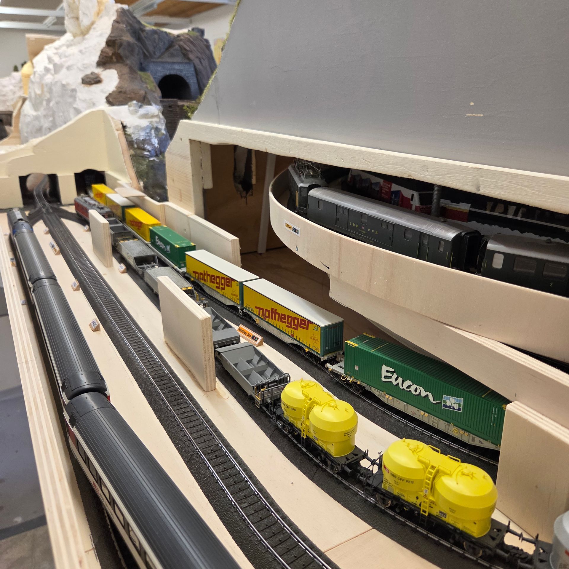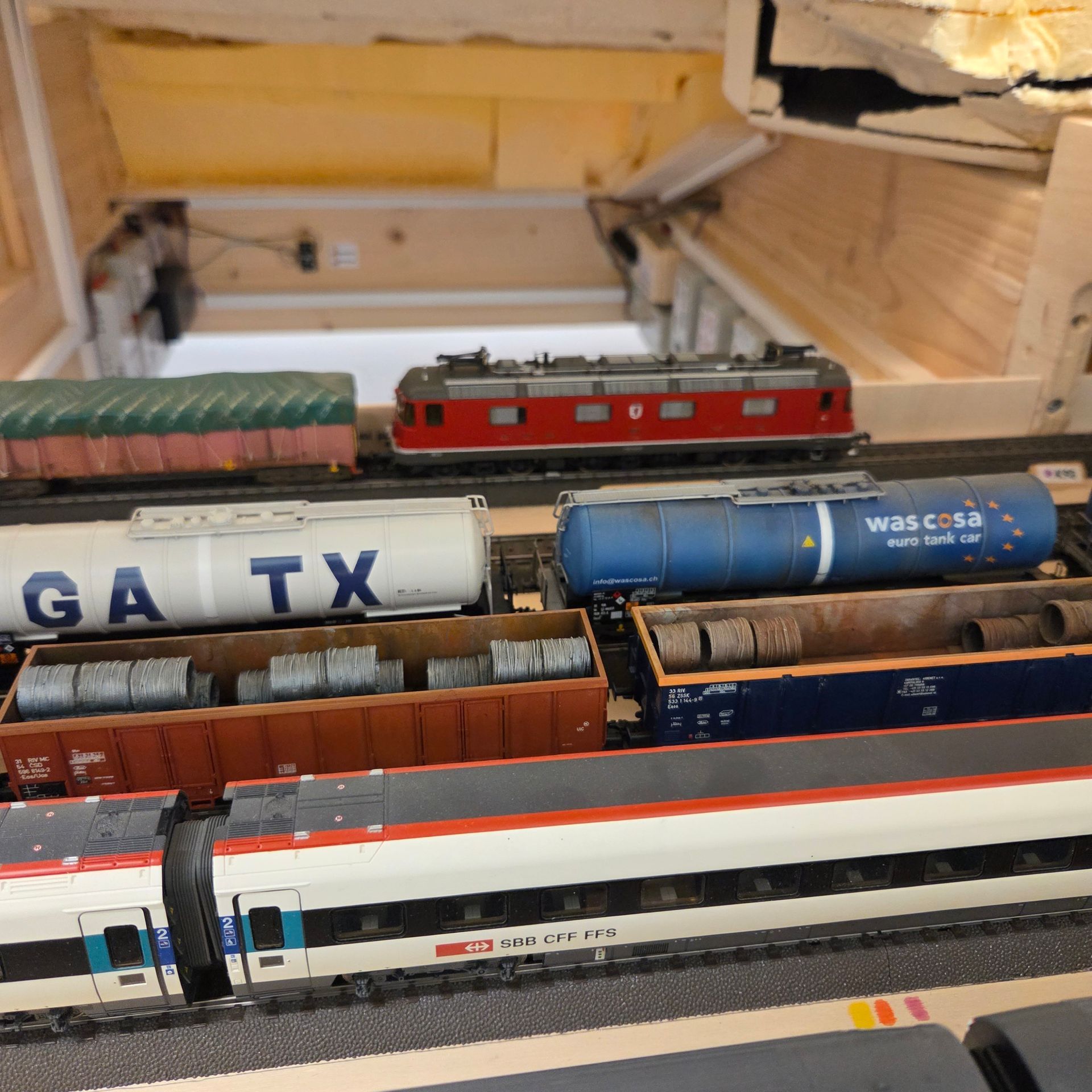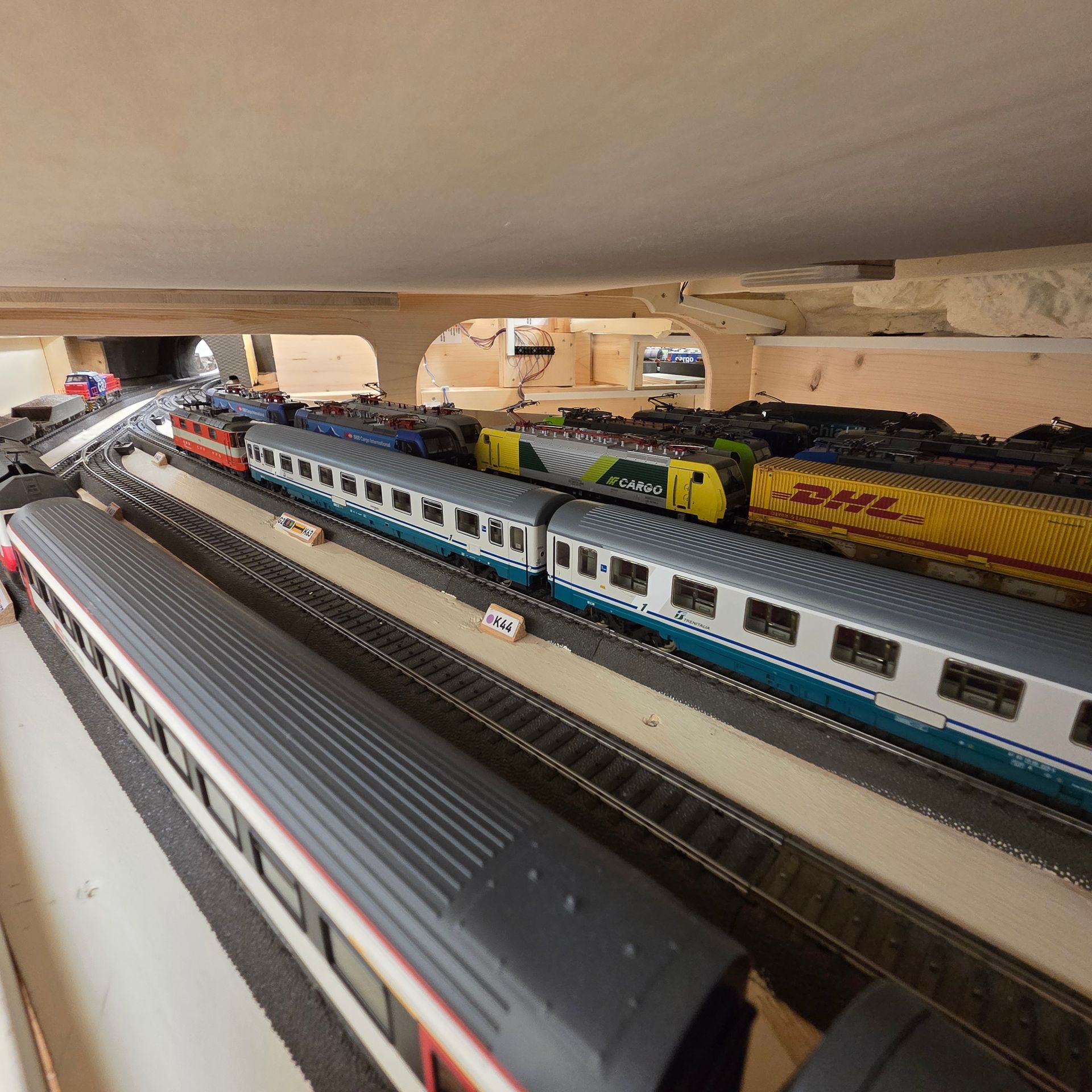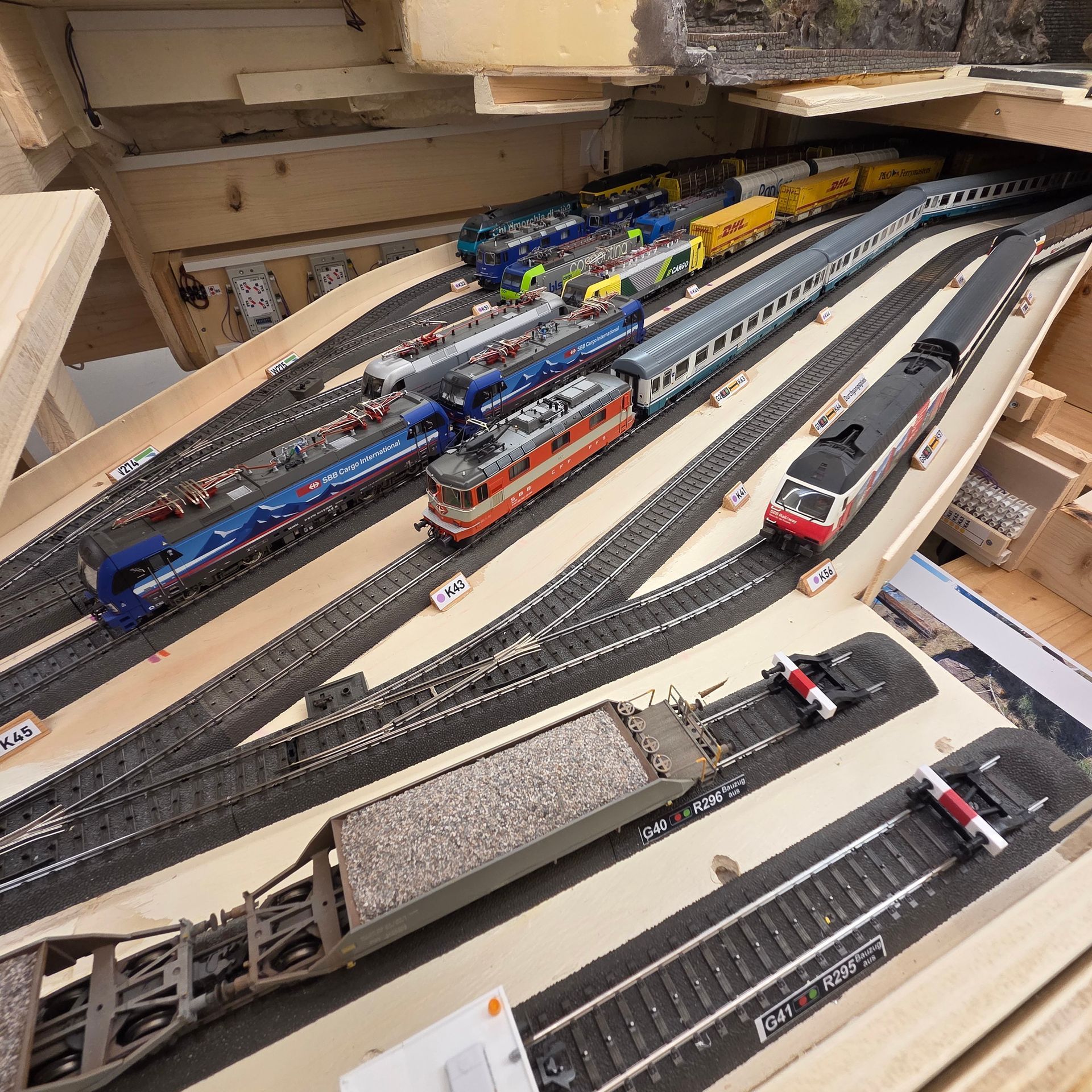 Somit lassen sich, auf den meist über 3m langen Schattenbahnhofsgleisen, bis zu 20 abwechslungsreiche Zugkompositionen auf der neuen Gotthard-Anlage unterbringen, teilweise 2 kürzere Kompositionen auf einem Gleis. Zwei zusätzliche, pendelnde Rangierloks im Bahnhof Gurtnellen und zwei Bauzüge auf offener Strecke, beleben die Szenerie zusätzlich. Sämtliche Züge in den Schattenbahnhöfen und die vier Pendelgarnituren, werden beim absolviertem Einsatz, automatisch stromlos geschaltet. Somit entstehen keine ungewollten Zugfahrten auf der Anlage.