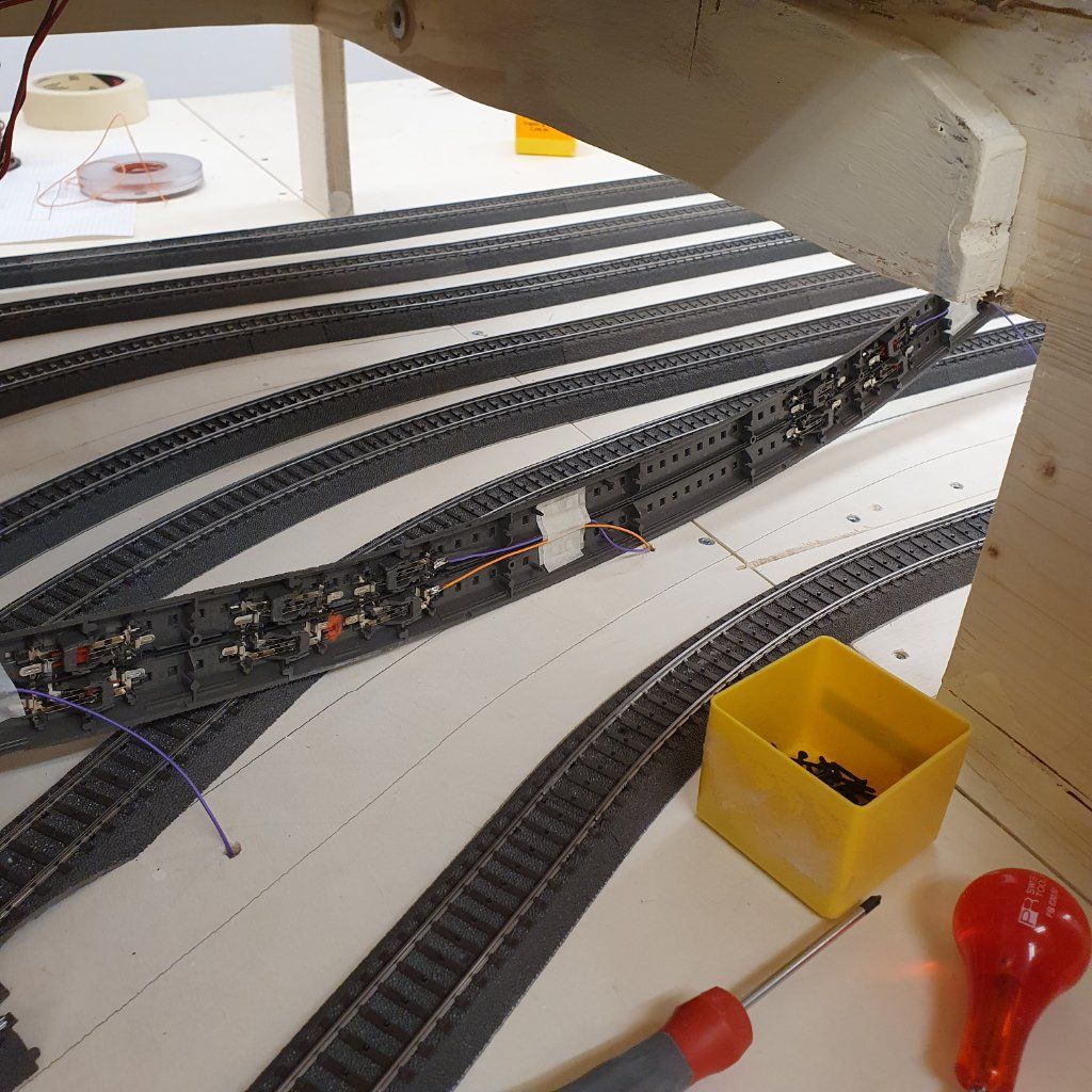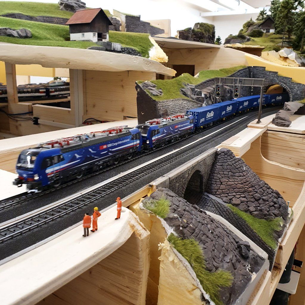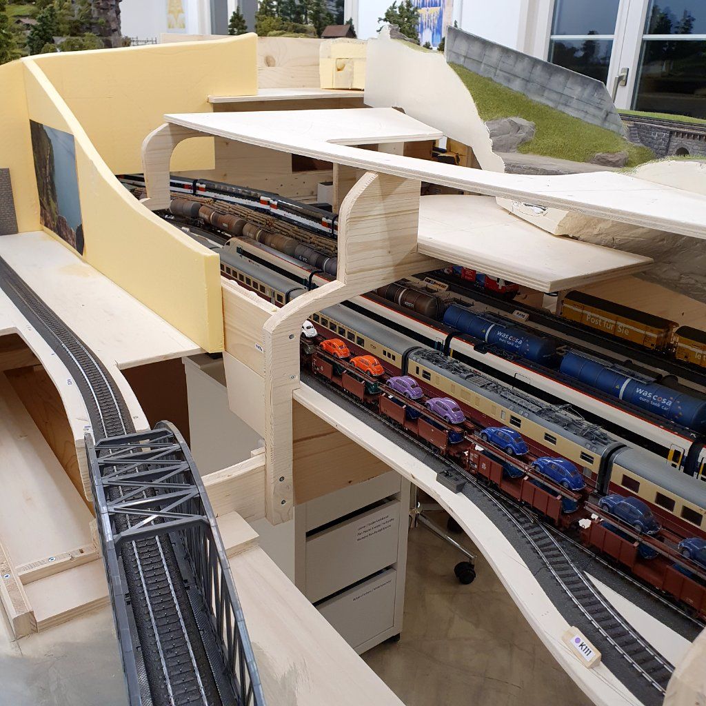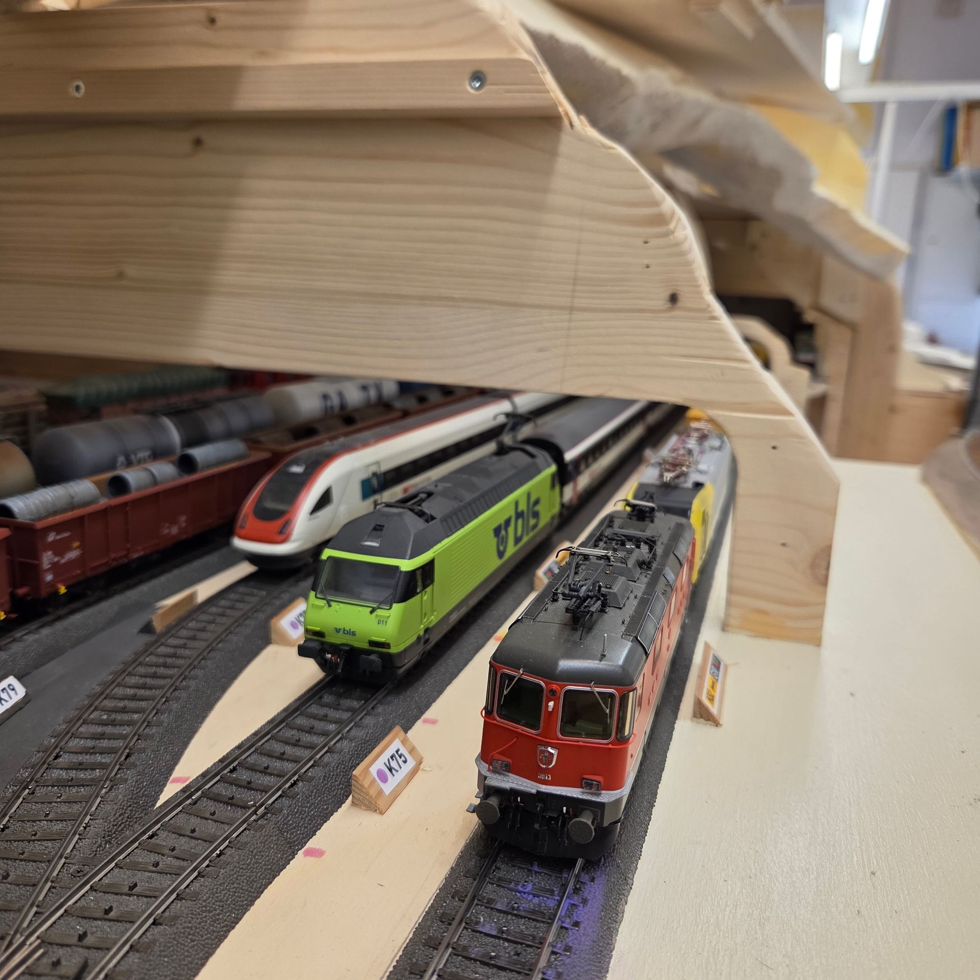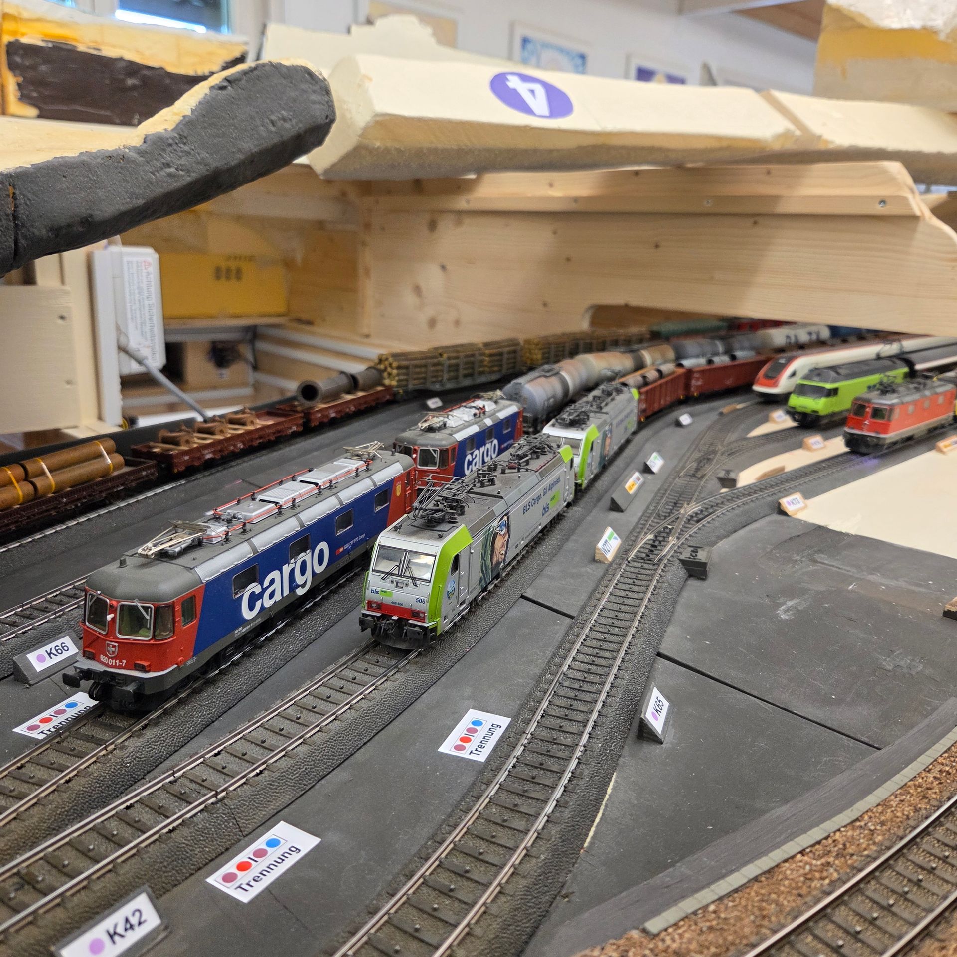 Somit lassen sich, auf den meist über 3m langen Schattenbahnhofsgleisen, bis zu 20 abwechslungsreiche Zugkompositionen auf der neuen Gotthard-Anlage unterbringen, teilweise 2 kürzere Kompositionen auf einem Gleis. Zwei zusätzliche, pendelnde Rangierloks im Bahnhof Gurtnellen und zwei Bauzüge auf offener Strecke, beleben die Szenerie zusätzlich. Sämtliche Züge in den Schattenbahnhöfen und die vier Pendelgarnituren, werden beim absolviertem Einsatz, automatisch stromlos geschaltet. Somit entstehen keine ungewollten Zugfahrten auf der Anlage.
